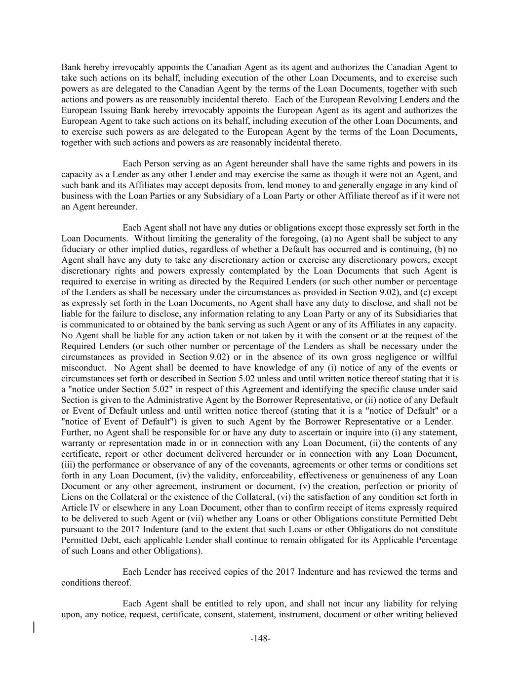 Bank hereby irrevocably appoints the Canadian Agent as its agent and authorizes the Canadian Agent to take such actions on its behalf, including execution of the other Loan Documents, and to exercise such powers as are delegated to the Canadian Agent by the terms of the Loan Documents, together with such actions and powers as are reasonably incidental thereto. Each of the European Revolving Lenders and the European Issuing Bank hereby irrevocably appoints the European Agent as its agent and authorizes the European Agent to take such actions on its behalf, including execution of the other Loan Documents, and to exercise such powers as are delegated to the European Agent by the terms of the Loan Documents, together with such actions and powers as are reasonably incidental thereto. Each Person serving as an Agent hereunder shall have the same rights and powers in its capacity as a Lender as any other Lender and may exercise the same as though it were not an Agent, and such bank and its Affiliates may accept deposits from, lend money to and generally engage in any kind of business with the Loan Parties or any Subsidiary of a Loan Party or other Affiliate thereof as if it were not an Agent hereunder. Each Agent shall not have any duties or obligations except those expressly set forth in the Loan Documents. Without limiting the generality of the foregoing, (a) no Agent shall be subject to any fiduciary or other implied duties, regardless of whether a Default has occurred and is continuing, (b) no Agent shall have any duty to take any discretionary action or exercise any discretionary powers, except discretionary rights and powers expressly contemplated by the Loan Documents that such Agent is required to exercise in writing as directed by the Required Lenders (or such other number or percentage of the Lenders as shall be necessary under the circumstances as provided in Section 9.02), and (c) except as expressly set forth in the Loan Documents, no Agent shall have any duty to disclose, and shall not be liable for the failure to disclose, any information relating to any Loan Party or any of its Subsidiaries that is communicated to or obtained by the bank serving as such Agent or any of its Affiliates in any capacity. No Agent shall be liable for any action taken or not taken by it with the consent or at the request of the Required Lenders (or such other number or percentage of the Lenders as shall be necessary under the circumstances as provided in Section 9.02) or in the absence of its own gross negligence or willful misconduct. No Agent shall be deemed to have knowledge of any (i) notice of any of the events or circumstances set forth or described in Section 5.02 unless and until written notice thereof stating that it is a "notice under Section 5.02" in respect of this Agreement and identifying the specific clause under said Section is given to the Administrative Agent by the Borrower Representative, or (ii) notice of any Default or Event of Default unless and until written notice thereof (stating that it is a "notice of Default" or a "notice of Event of Default") is given to such Agent by the Borrower Representative or a Lender. Further, no Agent shall be responsible for or have any duty to ascertain or inquire into (i) any statement, warranty or representation made in or in connection with any Loan Document, (ii) the contents of any certificate, report or other document delivered hereunder or in connection with any Loan Document, (iii) the performance or observance of any of the covenants, agreements or other terms or conditions set forth in any Loan Document, (iv) the validity, enforceability, effectiveness or genuineness of any Loan Document or any other agreement, instrument or document, (v) the creation, perfection or priority of Liens on the Collateral or the existence of the Collateral, (vi) the satisfaction of any condition set forth in Article IV or elsewhere in any Loan Document, other than to confirm receipt of items expressly required to be delivered to such Agent or (vii) whether any Loans or other Obligations constitute Permitted Debt pursuant to the 2017 Indenture (and to the extent that such Loans or other Obligations do not constitute Permitted Debt, each applicable Lender shall continue to remain obligated for its Applicable Percentage of such Loans and other Obligations). Each Lender has received copies of the 2017 Indenture and has reviewed the terms and conditions thereof. Each Agent shall be entitled to rely upon, and shall not incur any liability for relying upon, any notice, request, certificate, consent, statement, instrument, document or other writing believed -148-