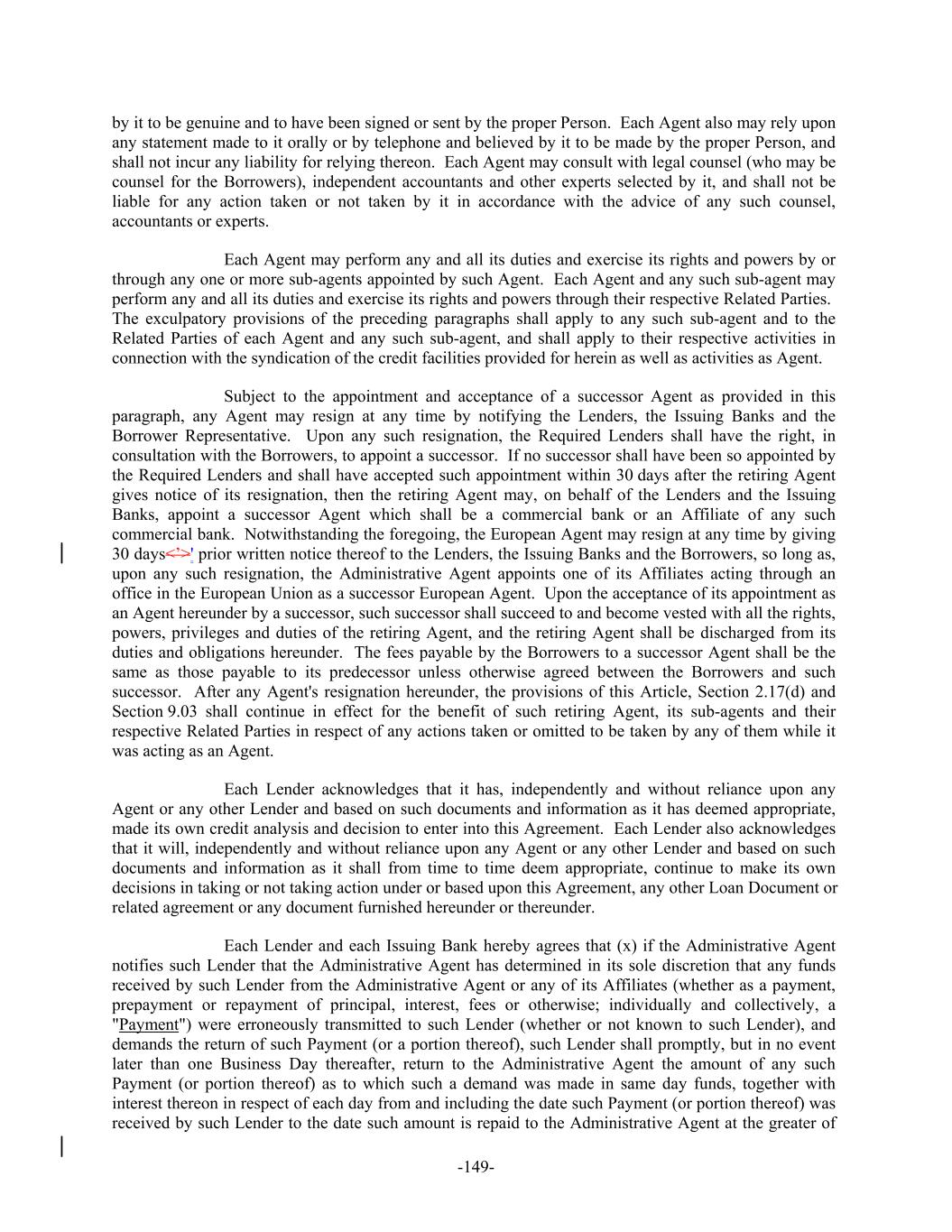 by it to be genuine and to have been signed or sent by the proper Person. Each Agent also may rely upon any statement made to it orally or by telephone and believed by it to be made by the proper Person, and shall not incur any liability for relying thereon. Each Agent may consult with legal counsel (who may be counsel for the Borrowers), independent accountants and other experts selected by it, and shall not be liable for any action taken or not taken by it in accordance with the advice of any such counsel, accountants or experts. Each Agent may perform any and all its duties and exercise its rights and powers by or through any one or more sub-agents appointed by such Agent. Each Agent and any such sub-agent may perform any and all its duties and exercise its rights and powers through their respective Related Parties. The exculpatory provisions of the preceding paragraphs shall apply to any such sub-agent and to the Related Parties of each Agent and any such sub-agent, and shall apply to their respective activities in connection with the syndication of the credit facilities provided for herein as well as activities as Agent. Subject to the appointment and acceptance of a successor Agent as provided in this paragraph, any Agent may resign at any time by notifying the Lenders, the Issuing Banks and the Borrower Representative. Upon any such resignation, the Required Lenders shall have the right, in consultation with the Borrowers, to appoint a successor. If no successor shall have been so appointed by the Required Lenders and shall have accepted such appointment within 30 days after the retiring Agent gives notice of its resignation, then the retiring Agent may, on behalf of the Lenders and the Issuing Banks, appoint a successor Agent which shall be a commercial bank or an Affiliate of any such commercial bank. Notwithstanding the foregoing, the European Agent may resign at any time by giving 30 days<’>' prior written notice thereof to the Lenders, the Issuing Banks and the Borrowers, so long as, upon any such resignation, the Administrative Agent appoints one of its Affiliates acting through an office in the European Union as a successor European Agent. Upon the acceptance of its appointment as an Agent hereunder by a successor, such successor shall succeed to and become vested with all the rights, powers, privileges and duties of the retiring Agent, and the retiring Agent shall be discharged from its duties and obligations hereunder. The fees payable by the Borrowers to a successor Agent shall be the same as those payable to its predecessor unless otherwise agreed between the Borrowers and such successor. After any Agent's resignation hereunder, the provisions of this Article, Section 2.17(d) and Section 9.03 shall continue in effect for the benefit of such retiring Agent, its sub-agents and their respective Related Parties in respect of any actions taken or omitted to be taken by any of them while it was acting as an Agent. Each Lender acknowledges that it has, independently and without reliance upon any Agent or any other Lender and based on such documents and information as it has deemed appropriate, made its own credit analysis and decision to enter into this Agreement. Each Lender also acknowledges that it will, independently and without reliance upon any Agent or any other Lender and based on such documents and information as it shall from time to time deem appropriate, continue to make its own decisions in taking or not taking action under or based upon this Agreement, any other Loan Document or related agreement or any document furnished hereunder or thereunder. Each Lender and each Issuing Bank hereby agrees that (x) if the Administrative Agent notifies such Lender that the Administrative Agent has determined in its sole discretion that any funds received by such Lender from the Administrative Agent or any of its Affiliates (whether as a payment, prepayment or repayment of principal, interest, fees or otherwise; individually and collectively, a "Payment") were erroneously transmitted to such Lender (whether or not known to such Lender), and demands the return of such Payment (or a portion thereof), such Lender shall promptly, but in no event later than one Business Day thereafter, return to the Administrative Agent the amount of any such Payment (or portion thereof) as to which such a demand was made in same day funds, together with interest thereon in respect of each day from and including the date such Payment (or portion thereof) was received by such Lender to the date such amount is repaid to the Administrative Agent at the greater of -149-