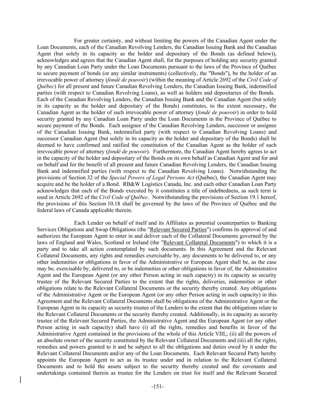 For greater certainty, and without limiting the powers of the Canadian Agent under the Loan Documents, each of the Canadian Revolving Lenders, the Canadian Issuing Bank and the Canadian Agent (but solely in its capacity as the holder and depositary of the Bonds (as defined below)), acknowledges and agrees that the Canadian Agent shall, for the purposes of holding any security granted by any Canadian Loan Party under the Loan Documents pursuant to the laws of the Province of Québec to secure payment of bonds (or any similar instruments) (collectively, the "Bonds"), be the holder of an irrevocable power of attorney (fondé de pouvoir) (within the meaning of Article 2692 of the Civil Code of Québec) for all present and future Canadian Revolving Lenders, the Canadian Issuing Bank, indemnified parties (with respect to Canadian Revolving Loans), as well as holders and depositaries of the Bonds. Each of the Canadian Revolving Lenders, the Canadian Issuing Bank and the Canadian Agent (but solely in its capacity as the holder and depositary of the Bonds) constitutes, to the extent necessary, the Canadian Agent as the holder of such irrevocable power of attorney (fondé de pouvoir) in order to hold security granted by any Canadian Loan Party under the Loan Documents in the Province of Québec to secure payment of the Bonds. Each assignee of the Canadian Revolving Lenders, successor or assignee of the Canadian Issuing Bank, indemnified party (with respect to Canadian Revolving Loans) and successor Canadian Agent (but solely in its capacity as the holder and depositary of the Bonds) shall be deemed to have confirmed and ratified the constitution of the Canadian Agent as the holder of such irrevocable power of attorney (fondé de pouvoir). Furthermore, the Canadian Agent hereby agrees to act in the capacity of the holder and depositary of the Bonds on its own behalf as Canadian Agent and for and on behalf and for the benefit of all present and future Canadian Revolving Lenders, the Canadian Issuing Bank and indemnified parties (with respect to the Canadian Revolving Loans). Notwithstanding the provisions of Section 32 of the Special Powers of Legal Persons Act (Québec), the Canadian Agent may acquire and be the holder of a Bond. RB&W Logistics Canada, Inc. and each other Canadian Loan Party acknowledges that each of the Bonds executed by it constitutes a title of indebtedness, as such term is used in Article 2692 of the Civil Code of Québec. Notwithstanding the provisions of Section 19.1 hereof, the provisions of this Section 10.18 shall be governed by the laws of the Province of Québec and the federal laws of Canada applicable therein. Each Lender on behalf of itself and its Affiliates as potential counterparties to Banking Services Obligations and Swap Obligations (the "Relevant Secured Parties") confirms its approval of and authorizes the European Agent to enter in and deliver each of the Collateral Documents governed by the laws of England and Wales, Scotland or Ireland (the "Relevant Collateral Documents") to which it is a party and to take all action contemplated by such documents. In this Agreement and the Relevant Collateral Documents, any rights and remedies exercisable by, any documents to be delivered to, or any other indemnities or obligations in favor of the Administrative or European Agent shall be, as the case may be, exercisable by, delivered to, or be indemnities or other obligations in favor of, the Administrative Agent and the European Agent (or any other Person acting in such capacity) in its capacity as security trustee of the Relevant Secured Parties to the extent that the rights, deliveries, indemnities or other obligations relate to the Relevant Collateral Documents or the security thereby created. Any obligations of the Administrative Agent or the European Agent (or any other Person acting in such capacity) in this Agreement and the Relevant Collateral Documents shall be obligations of the Administrative Agent or the European Agent in its capacity as security trustee of the Lenders to the extent that the obligations relate to the Relevant Collateral Documents or the security thereby created. Additionally, in its capacity as security trustee of the Relevant Secured Parties, the Administrative Agent and the European Agent (or any other Person acting in such capacity) shall have (i) all the rights, remedies and benefits in favor of the Administrative Agent contained in the provisions of the whole of this Article VIII,; (ii) all the powers of an absolute owner of the security constituted by the Relevant Collateral Documents and (iii) all the rights, remedies and powers granted to it and be subject to all the obligations and duties owed by it under the Relevant Collateral Documents and/or any of the Loan Documents. Each Relevant Secured Party hereby appoints the European Agent to act as its trustee under and in relation to the Relevant Collateral Documents and to hold the assets subject to the security thereby created and the covenants and undertakings contained therein as trustee for the Lenders on trust for itself and the Relevant Secured -151-