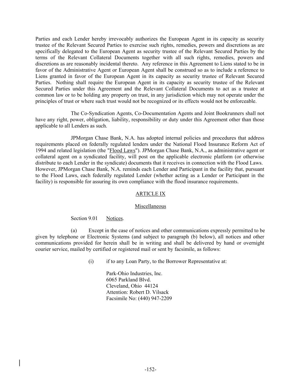 Parties and each Lender hereby irrevocably authorizes the European Agent in its capacity as security trustee of the Relevant Secured Parties to exercise such rights, remedies, powers and discretions as are specifically delegated to the European Agent as security trustee of the Relevant Secured Parties by the terms of the Relevant Collateral Documents together with all such rights, remedies, powers and discretions as are reasonably incidental thereto. Any reference in this Agreement to Liens stated to be in favor of the Administrative Agent or European Agent shall be construed so as to include a reference to Liens granted in favor of the European Agent in its capacity as security trustee of Relevant Secured Parties. Nothing shall require the European Agent in its capacity as security trustee of the Relevant Secured Parties under this Agreement and the Relevant Collateral Documents to act as a trustee at common law or to be holding any property on trust, in any jurisdiction which may not operate under the principles of trust or where such trust would not be recognized or its effects would not be enforceable. The Co-Syndication Agents, Co-Documentation Agents and Joint Bookrunners shall not have any right, power, obligation, liability, responsibility or duty under this Agreement other than those applicable to all Lenders as such. JPMorgan Chase Bank, N.A. has adopted internal policies and procedures that address requirements placed on federally regulated lenders under the National Flood Insurance Reform Act of 1994 and related legislation (the "Flood Laws"). JPMorgan Chase Bank, N.A., as administrative agent or collateral agent on a syndicated facility, will post on the applicable electronic platform (or otherwise distribute to each Lender in the syndicate) documents that it receives in connection with the Flood Laws. However, JPMorgan Chase Bank, N.A. reminds each Lender and Participant in the facility that, pursuant to the Flood Laws, each federally regulated Lender (whether acting as a Lender or Participant in the facility) is responsible for assuring its own compliance with the flood insurance requirements. ARTICLE IX Miscellaneous Section 9.01 Notices. (a) Except in the case of notices and other communications expressly permitted to be given by telephone or Electronic Systems (and subject to paragraph (b) below), all notices and other communications provided for herein shall be in writing and shall be delivered by hand or overnight courier service, mailed by certified or registered mail or sent by facsimile, as follows: (i) if to any Loan Party, to the Borrower Representative at: Park-Ohio Industries, Inc. 6065 Parkland Blvd. Cleveland, Ohio 44124 Attention: Robert D. Vilsack Facsimile No: (440) 947-2209 -152-