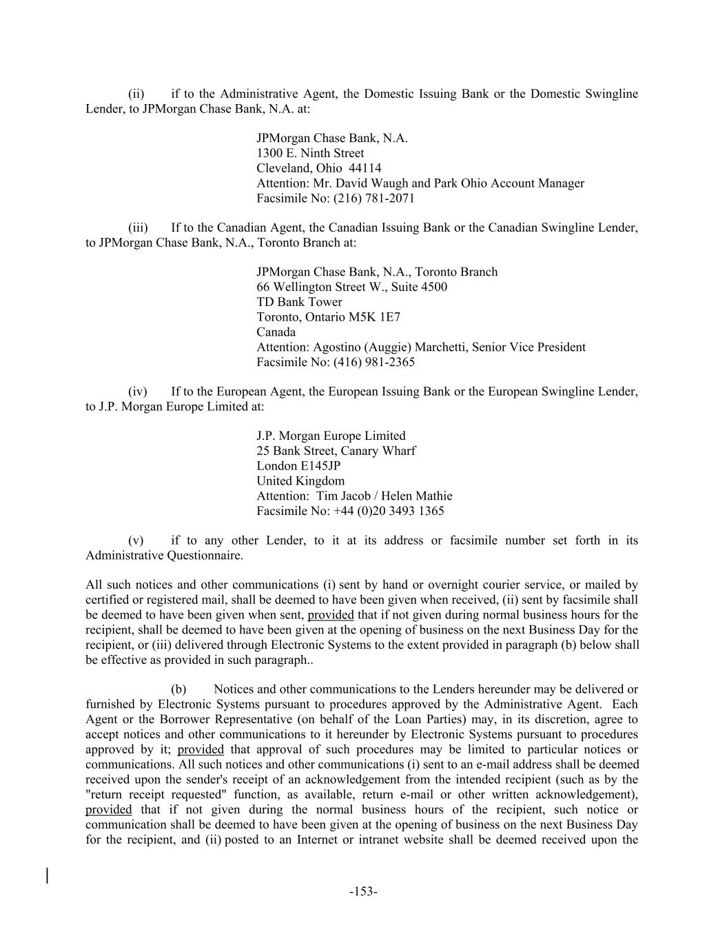 (ii) if to the Administrative Agent, the Domestic Issuing Bank or the Domestic Swingline Lender, to JPMorgan Chase Bank, N.A. at: JPMorgan Chase Bank, N.A. 1300 E. Ninth Street Cleveland, Ohio 44114 Attention: Mr. David Waugh and Park Ohio Account Manager Facsimile No: (216) 781-2071 (iii) If to the Canadian Agent, the Canadian Issuing Bank or the Canadian Swingline Lender, to JPMorgan Chase Bank, N.A., Toronto Branch at: JPMorgan Chase Bank, N.A., Toronto Branch 66 Wellington Street W., Suite 4500 TD Bank Tower Toronto, Ontario M5K 1E7 Canada Attention: Agostino (Auggie) Marchetti, Senior Vice President Facsimile No: (416) 981-2365 (iv) If to the European Agent, the European Issuing Bank or the European Swingline Lender, to J.P. Morgan Europe Limited at: J.P. Morgan Europe Limited 25 Bank Street, Canary Wharf London E145JP United Kingdom Attention: Tim Jacob / Helen Mathie Facsimile No: +44 (0)20 3493 1365 (v) if to any other Lender, to it at its address or facsimile number set forth in its Administrative Questionnaire. All such notices and other communications (i) sent by hand or overnight courier service, or mailed by certified or registered mail, shall be deemed to have been given when received, (ii) sent by facsimile shall be deemed to have been given when sent, provided that if not given during normal business hours for the recipient, shall be deemed to have been given at the opening of business on the next Business Day for the recipient, or (iii) delivered through Electronic Systems to the extent provided in paragraph (b) below shall be effective as provided in such paragraph.. (b) Notices and other communications to the Lenders hereunder may be delivered or furnished by Electronic Systems pursuant to procedures approved by the Administrative Agent. Each Agent or the Borrower Representative (on behalf of the Loan Parties) may, in its discretion, agree to accept notices and other communications to it hereunder by Electronic Systems pursuant to procedures approved by it; provided that approval of such procedures may be limited to particular notices or communications. All such notices and other communications (i) sent to an e-mail address shall be deemed received upon the sender's receipt of an acknowledgement from the intended recipient (such as by the "return receipt requested" function, as available, return e-mail or other written acknowledgement), provided that if not given during the normal business hours of the recipient, such notice or communication shall be deemed to have been given at the opening of business on the next Business Day for the recipient, and (ii) posted to an Internet or intranet website shall be deemed received upon the -153-
