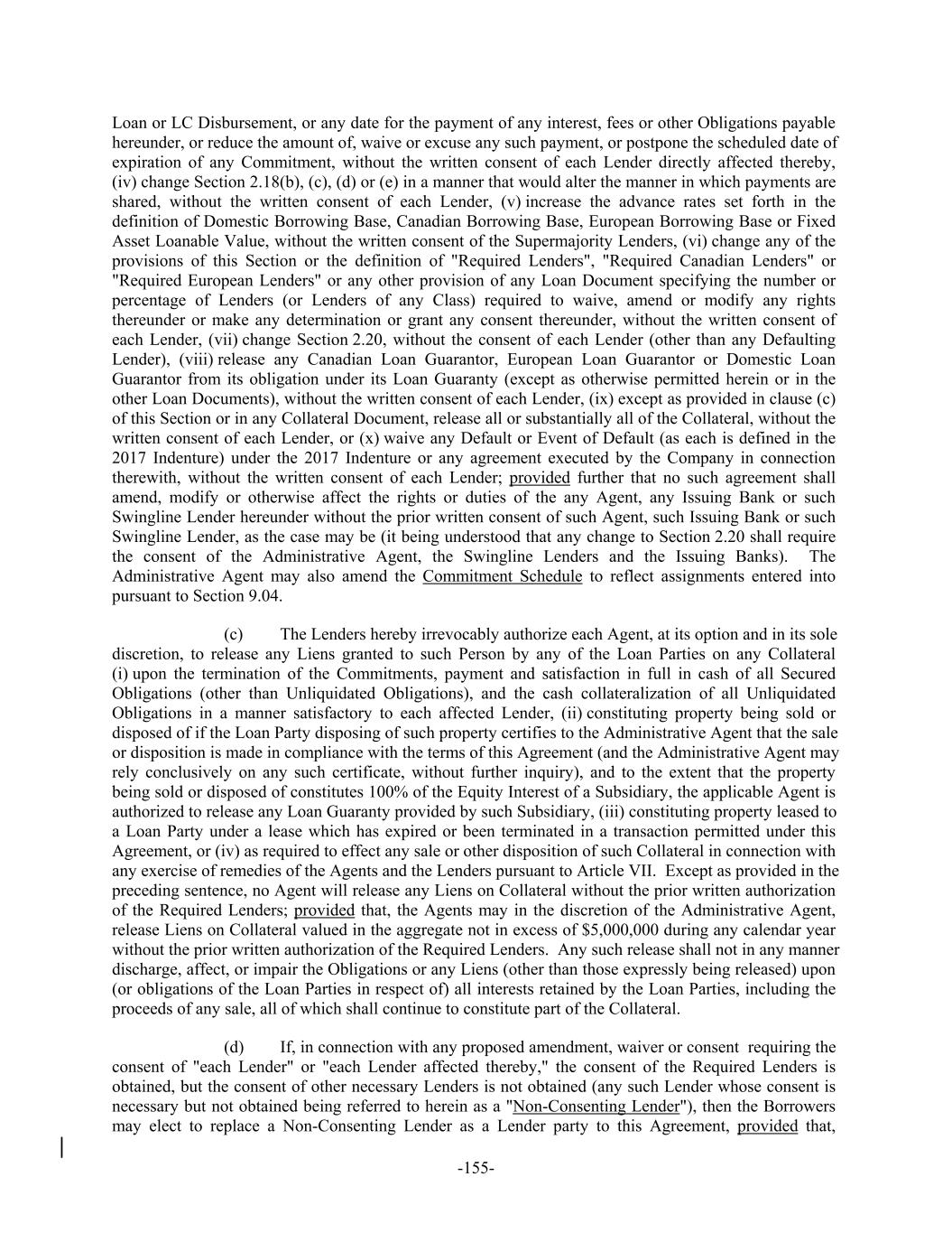 Loan or LC Disbursement, or any date for the payment of any interest, fees or other Obligations payable hereunder, or reduce the amount of, waive or excuse any such payment, or postpone the scheduled date of expiration of any Commitment, without the written consent of each Lender directly affected thereby, (iv) change Section 2.18(b), (c), (d) or (e) in a manner that would alter the manner in which payments are shared, without the written consent of each Lender, (v) increase the advance rates set forth in the definition of Domestic Borrowing Base, Canadian Borrowing Base, European Borrowing Base or Fixed Asset Loanable Value, without the written consent of the Supermajority Lenders, (vi) change any of the provisions of this Section or the definition of "Required Lenders", "Required Canadian Lenders" or "Required European Lenders" or any other provision of any Loan Document specifying the number or percentage of Lenders (or Lenders of any Class) required to waive, amend or modify any rights thereunder or make any determination or grant any consent thereunder, without the written consent of each Lender, (vii) change Section 2.20, without the consent of each Lender (other than any Defaulting Lender), (viii) release any Canadian Loan Guarantor, European Loan Guarantor or Domestic Loan Guarantor from its obligation under its Loan Guaranty (except as otherwise permitted herein or in the other Loan Documents), without the written consent of each Lender, (ix) except as provided in clause (c) of this Section or in any Collateral Document, release all or substantially all of the Collateral, without the written consent of each Lender, or (x) waive any Default or Event of Default (as each is defined in the 2017 Indenture) under the 2017 Indenture or any agreement executed by the Company in connection therewith, without the written consent of each Lender; provided further that no such agreement shall amend, modify or otherwise affect the rights or duties of the any Agent, any Issuing Bank or such Swingline Lender hereunder without the prior written consent of such Agent, such Issuing Bank or such Swingline Lender, as the case may be (it being understood that any change to Section 2.20 shall require the consent of the Administrative Agent, the Swingline Lenders and the Issuing Banks). The Administrative Agent may also amend the Commitment Schedule to reflect assignments entered into pursuant to Section 9.04. (c) The Lenders hereby irrevocably authorize each Agent, at its option and in its sole discretion, to release any Liens granted to such Person by any of the Loan Parties on any Collateral (i) upon the termination of the Commitments, payment and satisfaction in full in cash of all Secured Obligations (other than Unliquidated Obligations), and the cash collateralization of all Unliquidated Obligations in a manner satisfactory to each affected Lender, (ii) constituting property being sold or disposed of if the Loan Party disposing of such property certifies to the Administrative Agent that the sale or disposition is made in compliance with the terms of this Agreement (and the Administrative Agent may rely conclusively on any such certificate, without further inquiry), and to the extent that the property being sold or disposed of constitutes 100% of the Equity Interest of a Subsidiary, the applicable Agent is authorized to release any Loan Guaranty provided by such Subsidiary, (iii) constituting property leased to a Loan Party under a lease which has expired or been terminated in a transaction permitted under this Agreement, or (iv) as required to effect any sale or other disposition of such Collateral in connection with any exercise of remedies of the Agents and the Lenders pursuant to Article VII. Except as provided in the preceding sentence, no Agent will release any Liens on Collateral without the prior written authorization of the Required Lenders; provided that, the Agents may in the discretion of the Administrative Agent, release Liens on Collateral valued in the aggregate not in excess of $5,000,000 during any calendar year without the prior written authorization of the Required Lenders. Any such release shall not in any manner discharge, affect, or impair the Obligations or any Liens (other than those expressly being released) upon (or obligations of the Loan Parties in respect of) all interests retained by the Loan Parties, including the proceeds of any sale, all of which shall continue to constitute part of the Collateral. (d) If, in connection with any proposed amendment, waiver or consent requiring the consent of "each Lender" or "each Lender affected thereby," the consent of the Required Lenders is obtained, but the consent of other necessary Lenders is not obtained (any such Lender whose consent is necessary but not obtained being referred to herein as a "Non-Consenting Lender"), then the Borrowers may elect to replace a Non-Consenting Lender as a Lender party to this Agreement, provided that, -155-