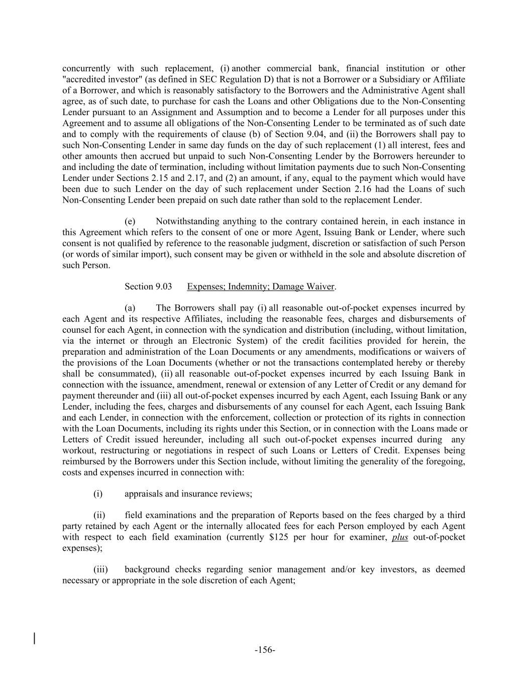 concurrently with such replacement, (i) another commercial bank, financial institution or other "accredited investor" (as defined in SEC Regulation D) that is not a Borrower or a Subsidiary or Affiliate of a Borrower, and which is reasonably satisfactory to the Borrowers and the Administrative Agent shall agree, as of such date, to purchase for cash the Loans and other Obligations due to the Non-Consenting Lender pursuant to an Assignment and Assumption and to become a Lender for all purposes under this Agreement and to assume all obligations of the Non-Consenting Lender to be terminated as of such date and to comply with the requirements of clause (b) of Section 9.04, and (ii) the Borrowers shall pay to such Non-Consenting Lender in same day funds on the day of such replacement (1) all interest, fees and other amounts then accrued but unpaid to such Non-Consenting Lender by the Borrowers hereunder to and including the date of termination, including without limitation payments due to such Non-Consenting Lender under Sections 2.15 and 2.17, and (2) an amount, if any, equal to the payment which would have been due to such Lender on the day of such replacement under Section 2.16 had the Loans of such Non-Consenting Lender been prepaid on such date rather than sold to the replacement Lender. (e) Notwithstanding anything to the contrary contained herein, in each instance in this Agreement which refers to the consent of one or more Agent, Issuing Bank or Lender, where such consent is not qualified by reference to the reasonable judgment, discretion or satisfaction of such Person (or words of similar import), such consent may be given or withheld in the sole and absolute discretion of such Person. Section 9.03 Expenses; Indemnity; Damage Waiver. (a) The Borrowers shall pay (i) all reasonable out-of-pocket expenses incurred by each Agent and its respective Affiliates, including the reasonable fees, charges and disbursements of counsel for each Agent, in connection with the syndication and distribution (including, without limitation, via the internet or through an Electronic System) of the credit facilities provided for herein, the preparation and administration of the Loan Documents or any amendments, modifications or waivers of the provisions of the Loan Documents (whether or not the transactions contemplated hereby or thereby shall be consummated), (ii) all reasonable out-of-pocket expenses incurred by each Issuing Bank in connection with the issuance, amendment, renewal or extension of any Letter of Credit or any demand for payment thereunder and (iii) all out-of-pocket expenses incurred by each Agent, each Issuing Bank or any Lender, including the fees, charges and disbursements of any counsel for each Agent, each Issuing Bank and each Lender, in connection with the enforcement, collection or protection of its rights in connection with the Loan Documents, including its rights under this Section, or in connection with the Loans made or Letters of Credit issued hereunder, including all such out-of-pocket expenses incurred during any workout, restructuring or negotiations in respect of such Loans or Letters of Credit. Expenses being reimbursed by the Borrowers under this Section include, without limiting the generality of the foregoing, costs and expenses incurred in connection with: (i) appraisals and insurance reviews; (ii) field examinations and the preparation of Reports based on the fees charged by a third party retained by each Agent or the internally allocated fees for each Person employed by each Agent with respect to each field examination (currently $125 per hour for examiner, plus out-of-pocket expenses); (iii) background checks regarding senior management and/or key investors, as deemed necessary or appropriate in the sole discretion of each Agent; -156-