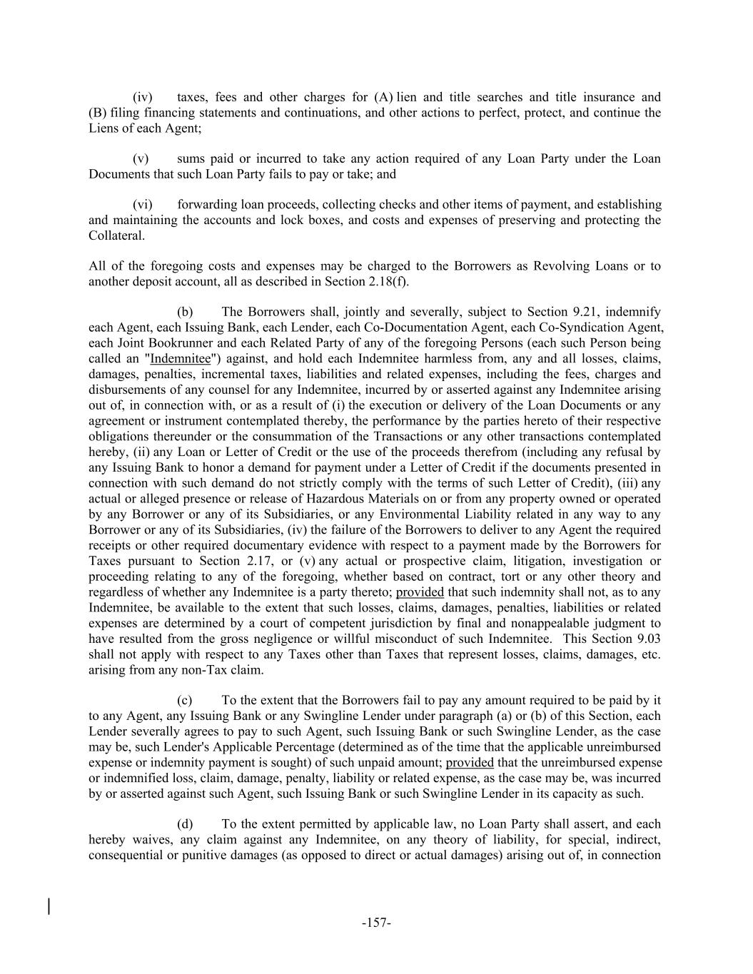 (iv) taxes, fees and other charges for (A) lien and title searches and title insurance and (B) filing financing statements and continuations, and other actions to perfect, protect, and continue the Liens of each Agent; (v) sums paid or incurred to take any action required of any Loan Party under the Loan Documents that such Loan Party fails to pay or take; and (vi) forwarding loan proceeds, collecting checks and other items of payment, and establishing and maintaining the accounts and lock boxes, and costs and expenses of preserving and protecting the Collateral. All of the foregoing costs and expenses may be charged to the Borrowers as Revolving Loans or to another deposit account, all as described in Section 2.18(f). (b) The Borrowers shall, jointly and severally, subject to Section 9.21, indemnify each Agent, each Issuing Bank, each Lender, each Co-Documentation Agent, each Co-Syndication Agent, each Joint Bookrunner and each Related Party of any of the foregoing Persons (each such Person being called an "Indemnitee") against, and hold each Indemnitee harmless from, any and all losses, claims, damages, penalties, incremental taxes, liabilities and related expenses, including the fees, charges and disbursements of any counsel for any Indemnitee, incurred by or asserted against any Indemnitee arising out of, in connection with, or as a result of (i) the execution or delivery of the Loan Documents or any agreement or instrument contemplated thereby, the performance by the parties hereto of their respective obligations thereunder or the consummation of the Transactions or any other transactions contemplated hereby, (ii) any Loan or Letter of Credit or the use of the proceeds therefrom (including any refusal by any Issuing Bank to honor a demand for payment under a Letter of Credit if the documents presented in connection with such demand do not strictly comply with the terms of such Letter of Credit), (iii) any actual or alleged presence or release of Hazardous Materials on or from any property owned or operated by any Borrower or any of its Subsidiaries, or any Environmental Liability related in any way to any Borrower or any of its Subsidiaries, (iv) the failure of the Borrowers to deliver to any Agent the required receipts or other required documentary evidence with respect to a payment made by the Borrowers for Taxes pursuant to Section 2.17, or (v) any actual or prospective claim, litigation, investigation or proceeding relating to any of the foregoing, whether based on contract, tort or any other theory and regardless of whether any Indemnitee is a party thereto; provided that such indemnity shall not, as to any Indemnitee, be available to the extent that such losses, claims, damages, penalties, liabilities or related expenses are determined by a court of competent jurisdiction by final and nonappealable judgment to have resulted from the gross negligence or willful misconduct of such Indemnitee. This Section 9.03 shall not apply with respect to any Taxes other than Taxes that represent losses, claims, damages, etc. arising from any non-Tax claim. (c) To the extent that the Borrowers fail to pay any amount required to be paid by it to any Agent, any Issuing Bank or any Swingline Lender under paragraph (a) or (b) of this Section, each Lender severally agrees to pay to such Agent, such Issuing Bank or such Swingline Lender, as the case may be, such Lender's Applicable Percentage (determined as of the time that the applicable unreimbursed expense or indemnity payment is sought) of such unpaid amount; provided that the unreimbursed expense or indemnified loss, claim, damage, penalty, liability or related expense, as the case may be, was incurred by or asserted against such Agent, such Issuing Bank or such Swingline Lender in its capacity as such. (d) To the extent permitted by applicable law, no Loan Party shall assert, and each hereby waives, any claim against any Indemnitee, on any theory of liability, for special, indirect, consequential or punitive damages (as opposed to direct or actual damages) arising out of, in connection -157-