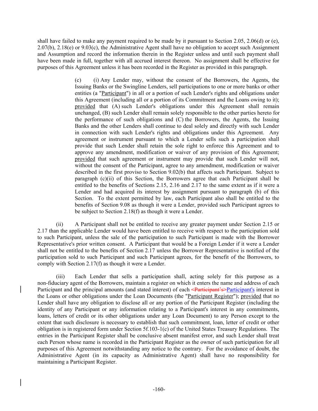 shall have failed to make any payment required to be made by it pursuant to Section 2.05, 2.06(d) or (e), 2.07(b), 2.18(e) or 9.03(c), the Administrative Agent shall have no obligation to accept such Assignment and Assumption and record the information therein in the Register unless and until such payment shall have been made in full, together with all accrued interest thereon. No assignment shall be effective for purposes of this Agreement unless it has been recorded in the Register as provided in this paragraph. (c) (i) Any Lender may, without the consent of the Borrowers, the Agents, the Issuing Banks or the Swingline Lenders, sell participations to one or more banks or other entities (a "Participant") in all or a portion of such Lender's rights and obligations under this Agreement (including all or a portion of its Commitment and the Loans owing to it); provided that (A) such Lender's obligations under this Agreement shall remain unchanged, (B) such Lender shall remain solely responsible to the other parties hereto for the performance of such obligations and (C) the Borrowers, the Agents, the Issuing Banks and the other Lenders shall continue to deal solely and directly with such Lender in connection with such Lender's rights and obligations under this Agreement. Any agreement or instrument pursuant to which a Lender sells such a participation shall provide that such Lender shall retain the sole right to enforce this Agreement and to approve any amendment, modification or waiver of any provision of this Agreement; provided that such agreement or instrument may provide that such Lender will not, without the consent of the Participant, agree to any amendment, modification or waiver described in the first proviso to Section 9.02(b) that affects such Participant. Subject to paragraph (c)(ii) of this Section, the Borrowers agree that each Participant shall be entitled to the benefits of Sections 2.15, 2.16 and 2.17 to the same extent as if it were a Lender and had acquired its interest by assignment pursuant to paragraph (b) of this Section. To the extent permitted by law, each Participant also shall be entitled to the benefits of Section 9.08 as though it were a Lender, provided such Participant agrees to be subject to Section 2.18(f) as though it were a Lender. (ii) A Participant shall not be entitled to receive any greater payment under Section 2.15 or 2.17 than the applicable Lender would have been entitled to receive with respect to the participation sold to such Participant, unless the sale of the participation to such Participant is made with the Borrower Representative's prior written consent. A Participant that would be a Foreign Lender if it were a Lender shall not be entitled to the benefits of Section 2.17 unless the Borrower Representative is notified of the participation sold to such Participant and such Participant agrees, for the benefit of the Borrowers, to comply with Section 2.17(f) as though it were a Lender. (iii) Each Lender that sells a participation shall, acting solely for this purpose as a non-fiduciary agent of the Borrowers, maintain a register on which it enters the name and address of each Participant and the principal amounts (and stated interest) of each <Participant’s>Participant's interest in the Loans or other obligations under the Loan Documents (the "Participant Register"); provided that no Lender shall have any obligation to disclose all or any portion of the Participant Register (including the identity of any Participant or any information relating to a Participant's interest in any commitments, loans, letters of credit or its other obligations under any Loan Document) to any Person except to the extent that such disclosure is necessary to establish that such commitment, loan, letter of credit or other obligation is in registered form under Section 5f.103-1(c) of the United States Treasury Regulations. The entries in the Participant Register shall be conclusive absent manifest error, and such Lender shall treat each Person whose name is recorded in the Participant Register as the owner of such participation for all purposes of this Agreement notwithstanding any notice to the contrary. For the avoidance of doubt, the Administrative Agent (in its capacity as Administrative Agent) shall have no responsibility for maintaining a Participant Register. -160-