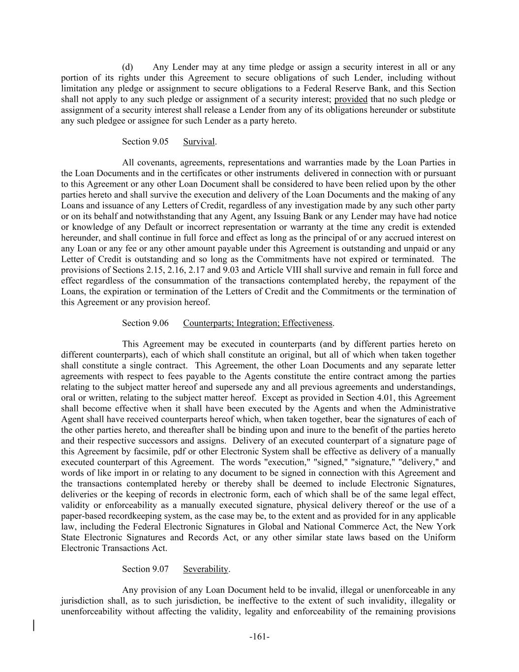 (d) Any Lender may at any time pledge or assign a security interest in all or any portion of its rights under this Agreement to secure obligations of such Lender, including without limitation any pledge or assignment to secure obligations to a Federal Reserve Bank, and this Section shall not apply to any such pledge or assignment of a security interest; provided that no such pledge or assignment of a security interest shall release a Lender from any of its obligations hereunder or substitute any such pledgee or assignee for such Lender as a party hereto. Section 9.05 Survival. All covenants, agreements, representations and warranties made by the Loan Parties in the Loan Documents and in the certificates or other instruments delivered in connection with or pursuant to this Agreement or any other Loan Document shall be considered to have been relied upon by the other parties hereto and shall survive the execution and delivery of the Loan Documents and the making of any Loans and issuance of any Letters of Credit, regardless of any investigation made by any such other party or on its behalf and notwithstanding that any Agent, any Issuing Bank or any Lender may have had notice or knowledge of any Default or incorrect representation or warranty at the time any credit is extended hereunder, and shall continue in full force and effect as long as the principal of or any accrued interest on any Loan or any fee or any other amount payable under this Agreement is outstanding and unpaid or any Letter of Credit is outstanding and so long as the Commitments have not expired or terminated. The provisions of Sections 2.15, 2.16, 2.17 and 9.03 and Article VIII shall survive and remain in full force and effect regardless of the consummation of the transactions contemplated hereby, the repayment of the Loans, the expiration or termination of the Letters of Credit and the Commitments or the termination of this Agreement or any provision hereof. Section 9.06 Counterparts; Integration; Effectiveness. This Agreement may be executed in counterparts (and by different parties hereto on different counterparts), each of which shall constitute an original, but all of which when taken together shall constitute a single contract. This Agreement, the other Loan Documents and any separate letter agreements with respect to fees payable to the Agents constitute the entire contract among the parties relating to the subject matter hereof and supersede any and all previous agreements and understandings, oral or written, relating to the subject matter hereof. Except as provided in Section 4.01, this Agreement shall become effective when it shall have been executed by the Agents and when the Administrative Agent shall have received counterparts hereof which, when taken together, bear the signatures of each of the other parties hereto, and thereafter shall be binding upon and inure to the benefit of the parties hereto and their respective successors and assigns. Delivery of an executed counterpart of a signature page of this Agreement by facsimile, pdf or other Electronic System shall be effective as delivery of a manually executed counterpart of this Agreement. The words "execution," "signed," "signature," "delivery," and words of like import in or relating to any document to be signed in connection with this Agreement and the transactions contemplated hereby or thereby shall be deemed to include Electronic Signatures, deliveries or the keeping of records in electronic form, each of which shall be of the same legal effect, validity or enforceability as a manually executed signature, physical delivery thereof or the use of a paper-based recordkeeping system, as the case may be, to the extent and as provided for in any applicable law, including the Federal Electronic Signatures in Global and National Commerce Act, the New York State Electronic Signatures and Records Act, or any other similar state laws based on the Uniform Electronic Transactions Act. Section 9.07 Severability. Any provision of any Loan Document held to be invalid, illegal or unenforceable in any jurisdiction shall, as to such jurisdiction, be ineffective to the extent of such invalidity, illegality or unenforceability without affecting the validity, legality and enforceability of the remaining provisions -161-