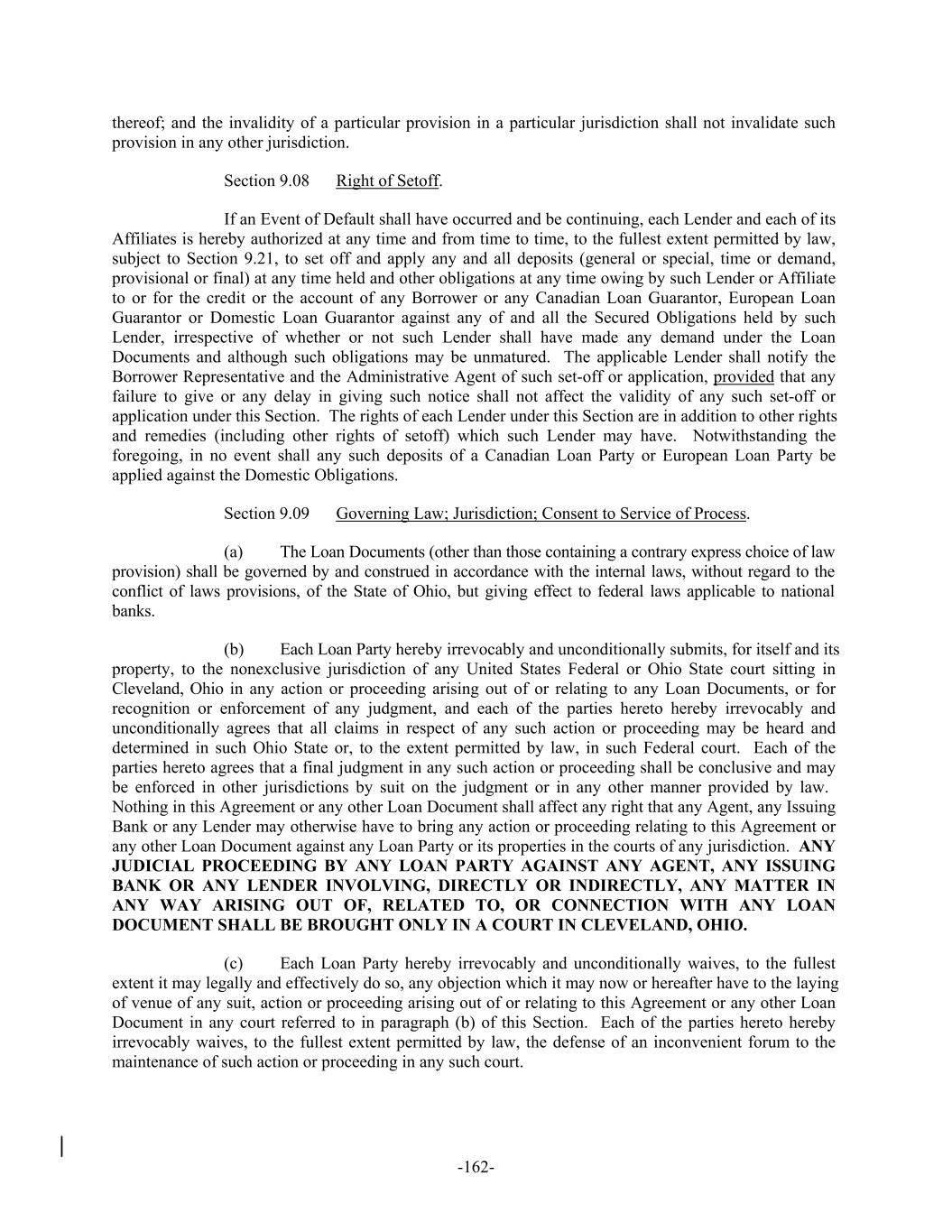 thereof; and the invalidity of a particular provision in a particular jurisdiction shall not invalidate such provision in any other jurisdiction. Section 9.08 Right of Setoff. If an Event of Default shall have occurred and be continuing, each Lender and each of its Affiliates is hereby authorized at any time and from time to time, to the fullest extent permitted by law, subject to Section 9.21, to set off and apply any and all deposits (general or special, time or demand, provisional or final) at any time held and other obligations at any time owing by such Lender or Affiliate to or for the credit or the account of any Borrower or any Canadian Loan Guarantor, European Loan Guarantor or Domestic Loan Guarantor against any of and all the Secured Obligations held by such Lender, irrespective of whether or not such Lender shall have made any demand under the Loan Documents and although such obligations may be unmatured. The applicable Lender shall notify the Borrower Representative and the Administrative Agent of such set-off or application, provided that any failure to give or any delay in giving such notice shall not affect the validity of any such set-off or application under this Section. The rights of each Lender under this Section are in addition to other rights and remedies (including other rights of setoff) which such Lender may have. Notwithstanding the foregoing, in no event shall any such deposits of a Canadian Loan Party or European Loan Party be applied against the Domestic Obligations. Section 9.09 Governing Law; Jurisdiction; Consent to Service of Process. (a) The Loan Documents (other than those containing a contrary express choice of law provision) shall be governed by and construed in accordance with the internal laws, without regard to the conflict of laws provisions, of the State of Ohio, but giving effect to federal laws applicable to national banks. (b) Each Loan Party hereby irrevocably and unconditionally submits, for itself and its property, to the nonexclusive jurisdiction of any United States Federal or Ohio State court sitting in Cleveland, Ohio in any action or proceeding arising out of or relating to any Loan Documents, or for recognition or enforcement of any judgment, and each of the parties hereto hereby irrevocably and unconditionally agrees that all claims in respect of any such action or proceeding may be heard and determined in such Ohio State or, to the extent permitted by law, in such Federal court. Each of the parties hereto agrees that a final judgment in any such action or proceeding shall be conclusive and may be enforced in other jurisdictions by suit on the judgment or in any other manner provided by law. Nothing in this Agreement or any other Loan Document shall affect any right that any Agent, any Issuing Bank or any Lender may otherwise have to bring any action or proceeding relating to this Agreement or any other Loan Document against any Loan Party or its properties in the courts of any jurisdiction. ANY JUDICIAL PROCEEDING BY ANY LOAN PARTY AGAINST ANY AGENT, ANY ISSUING BANK OR ANY LENDER INVOLVING, DIRECTLY OR INDIRECTLY, ANY MATTER IN ANY WAY ARISING OUT OF, RELATED TO, OR CONNECTION WITH ANY LOAN DOCUMENT SHALL BE BROUGHT ONLY IN A COURT IN CLEVELAND, OHIO. (c) Each Loan Party hereby irrevocably and unconditionally waives, to the fullest extent it may legally and effectively do so, any objection which it may now or hereafter have to the laying of venue of any suit, action or proceeding arising out of or relating to this Agreement or any other Loan Document in any court referred to in paragraph (b) of this Section. Each of the parties hereto hereby irrevocably waives, to the fullest extent permitted by law, the defense of an inconvenient forum to the maintenance of such action or proceeding in any such court. -162-