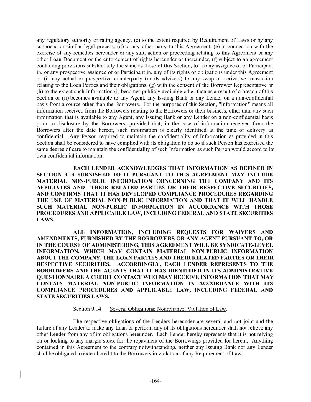 any regulatory authority or rating agency, (c) to the extent required by Requirement of Laws or by any subpoena or similar legal process, (d) to any other party to this Agreement, (e) in connection with the exercise of any remedies hereunder or any suit, action or proceeding relating to this Agreement or any other Loan Document or the enforcement of rights hereunder or thereunder, (f) subject to an agreement containing provisions substantially the same as those of this Section, to (i) any assignee of or Participant in, or any prospective assignee of or Participant in, any of its rights or obligations under this Agreement or (ii) any actual or prospective counterparty (or its advisors) to any swap or derivative transaction relating to the Loan Parties and their obligations, (g) with the consent of the Borrower Representative or (h) to the extent such Information (i) becomes publicly available other than as a result of a breach of this Section or (ii) becomes available to any Agent, any Issuing Bank or any Lender on a non-confidential basis from a source other than the Borrowers. For the purposes of this Section, "Information" means all information received from the Borrowers relating to the Borrowers or their business, other than any such information that is available to any Agent, any Issuing Bank or any Lender on a non-confidential basis prior to disclosure by the Borrowers; provided that, in the case of information received from the Borrowers after the date hereof, such information is clearly identified at the time of delivery as confidential. Any Person required to maintain the confidentiality of Information as provided in this Section shall be considered to have complied with its obligation to do so if such Person has exercised the same degree of care to maintain the confidentiality of such Information as such Person would accord to its own confidential information. EACH LENDER ACKNOWLEDGES THAT INFORMATION AS DEFINED IN SECTION 9.13 FURNISHED TO IT PURSUANT TO THIS AGREEMENT MAY INCLUDE MATERIAL NON-PUBLIC INFORMATION CONCERNING THE COMPANY AND ITS AFFILIATES AND THEIR RELATED PARTIES OR THEIR RESPECTIVE SECURITIES, AND CONFIRMS THAT IT HAS DEVELOPED COMPLIANCE PROCEDURES REGARDING THE USE OF MATERIAL NON-PUBLIC INFORMATION AND THAT IT WILL HANDLE SUCH MATERIAL NON-PUBLIC INFORMATION IN ACCORDANCE WITH THOSE PROCEDURES AND APPLICABLE LAW, INCLUDING FEDERAL AND STATE SECURITIES LAWS. ALL INFORMATION, INCLUDING REQUESTS FOR WAIVERS AND AMENDMENTS, FURNISHED BY THE BORROWERS OR ANY AGENT PURSUANT TO, OR IN THE COURSE OF ADMINISTERING, THIS AGREEMENT WILL BE SYNDICATE-LEVEL INFORMATION, WHICH MAY CONTAIN MATERIAL NON-PUBLIC INFORMATION ABOUT THE COMPANY, THE LOAN PARTIES AND THEIR RELATED PARTIES OR THEIR RESPECTIVE SECURITIES. ACCORDINGLY, EACH LENDER REPRESENTS TO THE BORROWERS AND THE AGENTS THAT IT HAS IDENTIFIED IN ITS ADMINISTRATIVE QUESTIONNAIRE A CREDIT CONTACT WHO MAY RECEIVE INFORMATION THAT MAY CONTAIN MATERIAL NON-PUBLIC INFORMATION IN ACCORDANCE WITH ITS COMPLIANCE PROCEDURES AND APPLICABLE LAW, INCLUDING FEDERAL AND STATE SECURITIES LAWS. Section 9.14 Several Obligations; Nonreliance; Violation of Law. The respective obligations of the Lenders hereunder are several and not joint and the failure of any Lender to make any Loan or perform any of its obligations hereunder shall not relieve any other Lender from any of its obligations hereunder. Each Lender hereby represents that it is not relying on or looking to any margin stock for the repayment of the Borrowings provided for herein. Anything contained in this Agreement to the contrary notwithstanding, neither any Issuing Bank nor any Lender shall be obligated to extend credit to the Borrowers in violation of any Requirement of Law. -164-