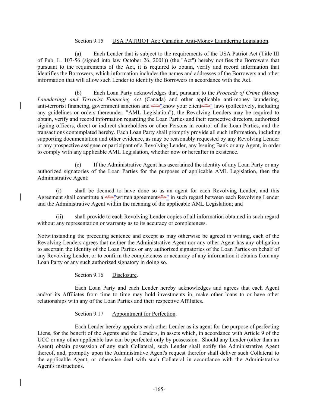 Section 9.15 USA PATRIOT Act; Canadian Anti-Money Laundering Legislation. (a) Each Lender that is subject to the requirements of the USA Patriot Act (Title III of Pub. L. 107-56 (signed into law October 26, 2001)) (the "Act") hereby notifies the Borrowers that pursuant to the requirements of the Act, it is required to obtain, verify and record information that identifies the Borrowers, which information includes the names and addresses of the Borrowers and other information that will allow such Lender to identify the Borrowers in accordance with the Act. (b) Each Loan Party acknowledges that, pursuant to the Proceeds of Crime (Money Laundering) and Terrorist Financing Act (Canada) and other applicable anti-money laundering, anti-terrorist financing, government sanction and <“>"know your client<”>" laws (collectively, including any guidelines or orders thereunder, "AML Legislation"), the Revolving Lenders may be required to obtain, verify and record information regarding the Loan Parties and their respective directors, authorized signing officers, direct or indirect shareholders or other Persons in control of the Loan Parties, and the transactions contemplated hereby. Each Loan Party shall promptly provide all such information, including supporting documentation and other evidence, as may be reasonably requested by any Revolving Lender or any prospective assignee or participant of a Revolving Lender, any Issuing Bank or any Agent, in order to comply with any applicable AML Legislation, whether now or hereafter in existence. (c) If the Administrative Agent has ascertained the identity of any Loan Party or any authorized signatories of the Loan Parties for the purposes of applicable AML Legislation, then the Administrative Agent: (i) shall be deemed to have done so as an agent for each Revolving Lender, and this Agreement shall constitute a <“>"written agreement<”>" in such regard between each Revolving Lender and the Administrative Agent within the meaning of the applicable AML Legislation; and (ii) shall provide to each Revolving Lender copies of all information obtained in such regard without any representation or warranty as to its accuracy or completeness. Notwithstanding the preceding sentence and except as may otherwise be agreed in writing, each of the Revolving Lenders agrees that neither the Administrative Agent nor any other Agent has any obligation to ascertain the identity of the Loan Parties or any authorized signatories of the Loan Parties on behalf of any Revolving Lender, or to confirm the completeness or accuracy of any information it obtains from any Loan Party or any such authorized signatory in doing so. Section 9.16 Disclosure. Each Loan Party and each Lender hereby acknowledges and agrees that each Agent and/or its Affiliates from time to time may hold investments in, make other loans to or have other relationships with any of the Loan Parties and their respective Affiliates. Section 9.17 Appointment for Perfection. Each Lender hereby appoints each other Lender as its agent for the purpose of perfecting Liens, for the benefit of the Agents and the Lenders, in assets which, in accordance with Article 9 of the UCC or any other applicable law can be perfected only by possession. Should any Lender (other than an Agent) obtain possession of any such Collateral, such Lender shall notify the Administrative Agent thereof, and, promptly upon the Administrative Agent's request therefor shall deliver such Collateral to the applicable Agent, or otherwise deal with such Collateral in accordance with the Administrative Agent's instructions. -165-