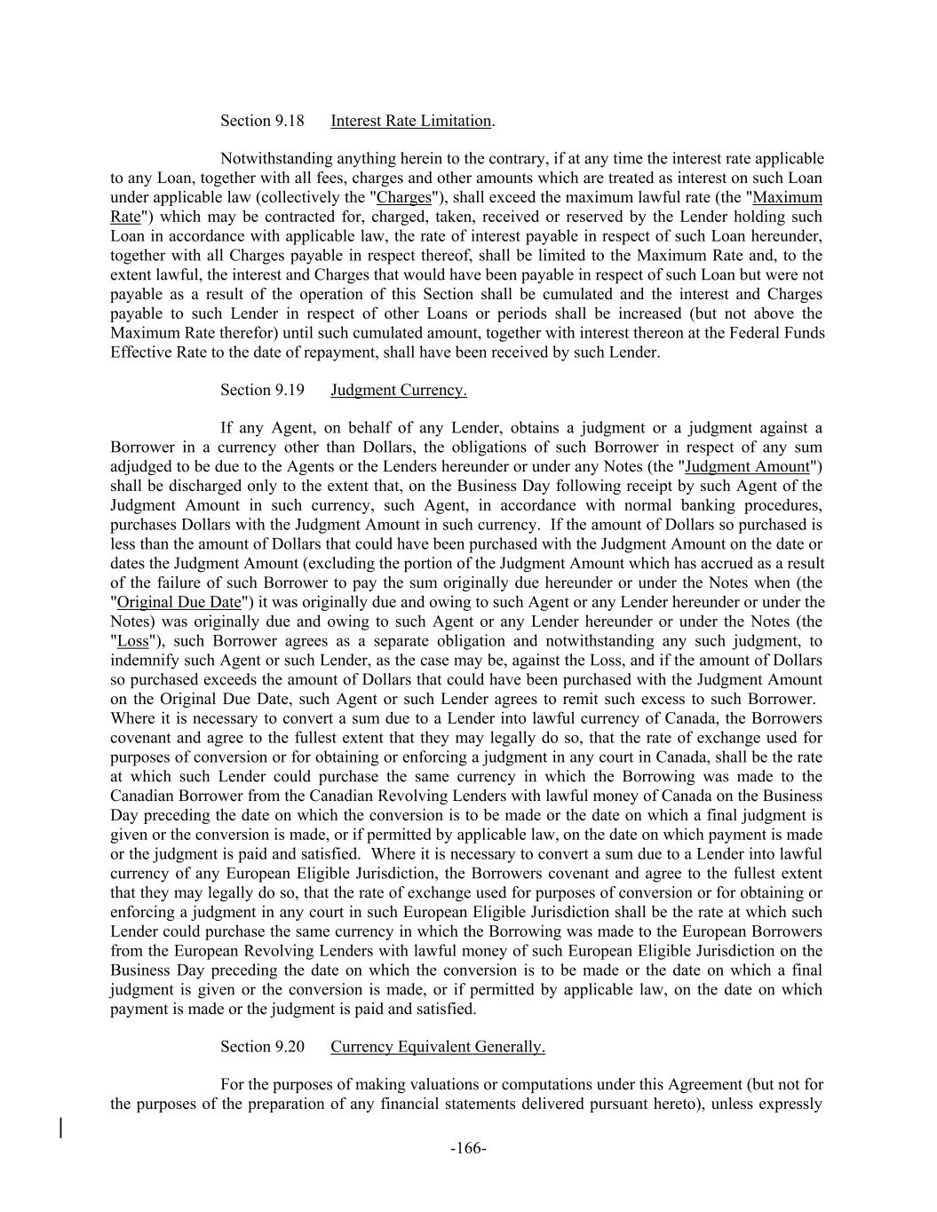 Section 9.18 Interest Rate Limitation. Notwithstanding anything herein to the contrary, if at any time the interest rate applicable to any Loan, together with all fees, charges and other amounts which are treated as interest on such Loan under applicable law (collectively the "Charges"), shall exceed the maximum lawful rate (the "Maximum Rate") which may be contracted for, charged, taken, received or reserved by the Lender holding such Loan in accordance with applicable law, the rate of interest payable in respect of such Loan hereunder, together with all Charges payable in respect thereof, shall be limited to the Maximum Rate and, to the extent lawful, the interest and Charges that would have been payable in respect of such Loan but were not payable as a result of the operation of this Section shall be cumulated and the interest and Charges payable to such Lender in respect of other Loans or periods shall be increased (but not above the Maximum Rate therefor) until such cumulated amount, together with interest thereon at the Federal Funds Effective Rate to the date of repayment, shall have been received by such Lender. Section 9.19 Judgment Currency. If any Agent, on behalf of any Lender, obtains a judgment or a judgment against a Borrower in a currency other than Dollars, the obligations of such Borrower in respect of any sum adjudged to be due to the Agents or the Lenders hereunder or under any Notes (the "Judgment Amount") shall be discharged only to the extent that, on the Business Day following receipt by such Agent of the Judgment Amount in such currency, such Agent, in accordance with normal banking procedures, purchases Dollars with the Judgment Amount in such currency. If the amount of Dollars so purchased is less than the amount of Dollars that could have been purchased with the Judgment Amount on the date or dates the Judgment Amount (excluding the portion of the Judgment Amount which has accrued as a result of the failure of such Borrower to pay the sum originally due hereunder or under the Notes when (the "Original Due Date") it was originally due and owing to such Agent or any Lender hereunder or under the Notes) was originally due and owing to such Agent or any Lender hereunder or under the Notes (the "Loss"), such Borrower agrees as a separate obligation and notwithstanding any such judgment, to indemnify such Agent or such Lender, as the case may be, against the Loss, and if the amount of Dollars so purchased exceeds the amount of Dollars that could have been purchased with the Judgment Amount on the Original Due Date, such Agent or such Lender agrees to remit such excess to such Borrower. Where it is necessary to convert a sum due to a Lender into lawful currency of Canada, the Borrowers covenant and agree to the fullest extent that they may legally do so, that the rate of exchange used for purposes of conversion or for obtaining or enforcing a judgment in any court in Canada, shall be the rate at which such Lender could purchase the same currency in which the Borrowing was made to the Canadian Borrower from the Canadian Revolving Lenders with lawful money of Canada on the Business Day preceding the date on which the conversion is to be made or the date on which a final judgment is given or the conversion is made, or if permitted by applicable law, on the date on which payment is made or the judgment is paid and satisfied. Where it is necessary to convert a sum due to a Lender into lawful currency of any European Eligible Jurisdiction, the Borrowers covenant and agree to the fullest extent that they may legally do so, that the rate of exchange used for purposes of conversion or for obtaining or enforcing a judgment in any court in such European Eligible Jurisdiction shall be the rate at which such Lender could purchase the same currency in which the Borrowing was made to the European Borrowers from the European Revolving Lenders with lawful money of such European Eligible Jurisdiction on the Business Day preceding the date on which the conversion is to be made or the date on which a final judgment is given or the conversion is made, or if permitted by applicable law, on the date on which payment is made or the judgment is paid and satisfied. Section 9.20 Currency Equivalent Generally. For the purposes of making valuations or computations under this Agreement (but not for the purposes of the preparation of any financial statements delivered pursuant hereto), unless expressly -166-