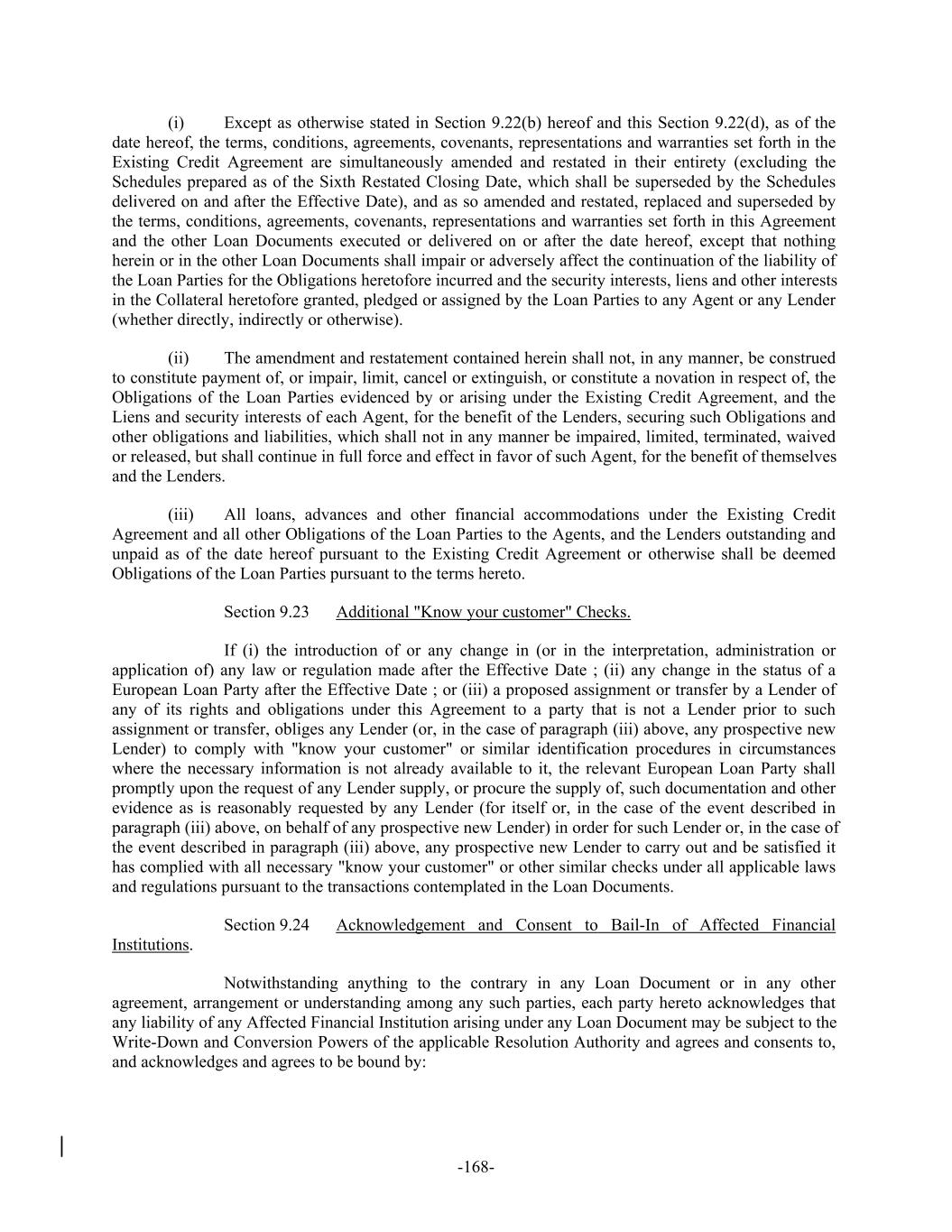 (i) Except as otherwise stated in Section 9.22(b) hereof and this Section 9.22(d), as of the date hereof, the terms, conditions, agreements, covenants, representations and warranties set forth in the Existing Credit Agreement are simultaneously amended and restated in their entirety (excluding the Schedules prepared as of the Sixth Restated Closing Date, which shall be superseded by the Schedules delivered on and after the Effective Date), and as so amended and restated, replaced and superseded by the terms, conditions, agreements, covenants, representations and warranties set forth in this Agreement and the other Loan Documents executed or delivered on or after the date hereof, except that nothing herein or in the other Loan Documents shall impair or adversely affect the continuation of the liability of the Loan Parties for the Obligations heretofore incurred and the security interests, liens and other interests in the Collateral heretofore granted, pledged or assigned by the Loan Parties to any Agent or any Lender (whether directly, indirectly or otherwise). (ii) The amendment and restatement contained herein shall not, in any manner, be construed to constitute payment of, or impair, limit, cancel or extinguish, or constitute a novation in respect of, the Obligations of the Loan Parties evidenced by or arising under the Existing Credit Agreement, and the Liens and security interests of each Agent, for the benefit of the Lenders, securing such Obligations and other obligations and liabilities, which shall not in any manner be impaired, limited, terminated, waived or released, but shall continue in full force and effect in favor of such Agent, for the benefit of themselves and the Lenders. (iii) All loans, advances and other financial accommodations under the Existing Credit Agreement and all other Obligations of the Loan Parties to the Agents, and the Lenders outstanding and unpaid as of the date hereof pursuant to the Existing Credit Agreement or otherwise shall be deemed Obligations of the Loan Parties pursuant to the terms hereto. Section 9.23 Additional "Know your customer" Checks. If (i) the introduction of or any change in (or in the interpretation, administration or application of) any law or regulation made after the Effective Date ; (ii) any change in the status of a European Loan Party after the Effective Date ; or (iii) a proposed assignment or transfer by a Lender of any of its rights and obligations under this Agreement to a party that is not a Lender prior to such assignment or transfer, obliges any Lender (or, in the case of paragraph (iii) above, any prospective new Lender) to comply with "know your customer" or similar identification procedures in circumstances where the necessary information is not already available to it, the relevant European Loan Party shall promptly upon the request of any Lender supply, or procure the supply of, such documentation and other evidence as is reasonably requested by any Lender (for itself or, in the case of the event described in paragraph (iii) above, on behalf of any prospective new Lender) in order for such Lender or, in the case of the event described in paragraph (iii) above, any prospective new Lender to carry out and be satisfied it has complied with all necessary "know your customer" or other similar checks under all applicable laws and regulations pursuant to the transactions contemplated in the Loan Documents. Section 9.24 Acknowledgement and Consent to Bail-In of Affected Financial Institutions. Notwithstanding anything to the contrary in any Loan Document or in any other agreement, arrangement or understanding among any such parties, each party hereto acknowledges that any liability of any Affected Financial Institution arising under any Loan Document may be subject to the Write-Down and Conversion Powers of the applicable Resolution Authority and agrees and consents to, and acknowledges and agrees to be bound by: -168-