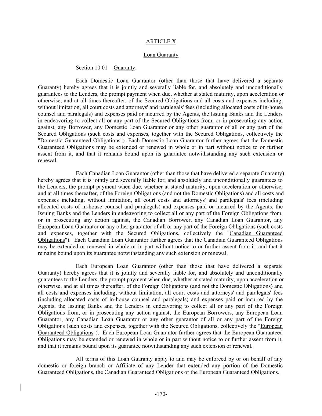 ARTICLE X Loan Guaranty Section 10.01 Guaranty. Each Domestic Loan Guarantor (other than those that have delivered a separate Guaranty) hereby agrees that it is jointly and severally liable for, and absolutely and unconditionally guarantees to the Lenders, the prompt payment when due, whether at stated maturity, upon acceleration or otherwise, and at all times thereafter, of the Secured Obligations and all costs and expenses including, without limitation, all court costs and attorneys' and paralegals' fees (including allocated costs of in-house counsel and paralegals) and expenses paid or incurred by the Agents, the Issuing Banks and the Lenders in endeavoring to collect all or any part of the Secured Obligations from, or in prosecuting any action against, any Borrower, any Domestic Loan Guarantor or any other guarantor of all or any part of the Secured Obligations (such costs and expenses, together with the Secured Obligations, collectively the "Domestic Guaranteed Obligations"). Each Domestic Loan Guarantor further agrees that the Domestic Guaranteed Obligations may be extended or renewed in whole or in part without notice to or further assent from it, and that it remains bound upon its guarantee notwithstanding any such extension or renewal. Each Canadian Loan Guarantor (other than those that have delivered a separate Guaranty) hereby agrees that it is jointly and severally liable for, and absolutely and unconditionally guarantees to the Lenders, the prompt payment when due, whether at stated maturity, upon acceleration or otherwise, and at all times thereafter, of the Foreign Obligations (and not the Domestic Obligations) and all costs and expenses including, without limitation, all court costs and attorneys' and paralegals' fees (including allocated costs of in-house counsel and paralegals) and expenses paid or incurred by the Agents, the Issuing Banks and the Lenders in endeavoring to collect all or any part of the Foreign Obligations from, or in prosecuting any action against, the Canadian Borrower, any Canadian Loan Guarantor, any European Loan Guarantor or any other guarantor of all or any part of the Foreign Obligations (such costs and expenses, together with the Secured Obligations, collectively the "Canadian Guaranteed Obligations"). Each Canadian Loan Guarantor further agrees that the Canadian Guaranteed Obligations may be extended or renewed in whole or in part without notice to or further assent from it, and that it remains bound upon its guarantee notwithstanding any such extension or renewal. Each European Loan Guarantor (other than those that have delivered a separate Guaranty) hereby agrees that it is jointly and severally liable for, and absolutely and unconditionally guarantees to the Lenders, the prompt payment when due, whether at stated maturity, upon acceleration or otherwise, and at all times thereafter, of the Foreign Obligations (and not the Domestic Obligations) and all costs and expenses including, without limitation, all court costs and attorneys' and paralegals' fees (including allocated costs of in-house counsel and paralegals) and expenses paid or incurred by the Agents, the Issuing Banks and the Lenders in endeavoring to collect all or any part of the Foreign Obligations from, or in prosecuting any action against, the European Borrowers, any European Loan Guarantor, any Canadian Loan Guarantor or any other guarantor of all or any part of the Foreign Obligations (such costs and expenses, together with the Secured Obligations, collectively the "European Guaranteed Obligations"). Each European Loan Guarantor further agrees that the European Guaranteed Obligations may be extended or renewed in whole or in part without notice to or further assent from it, and that it remains bound upon its guarantee notwithstanding any such extension or renewal. All terms of this Loan Guaranty apply to and may be enforced by or on behalf of any domestic or foreign branch or Affiliate of any Lender that extended any portion of the Domestic Guaranteed Obligations, the Canadian Guaranteed Obligations or the European Guaranteed Obligations. -170-