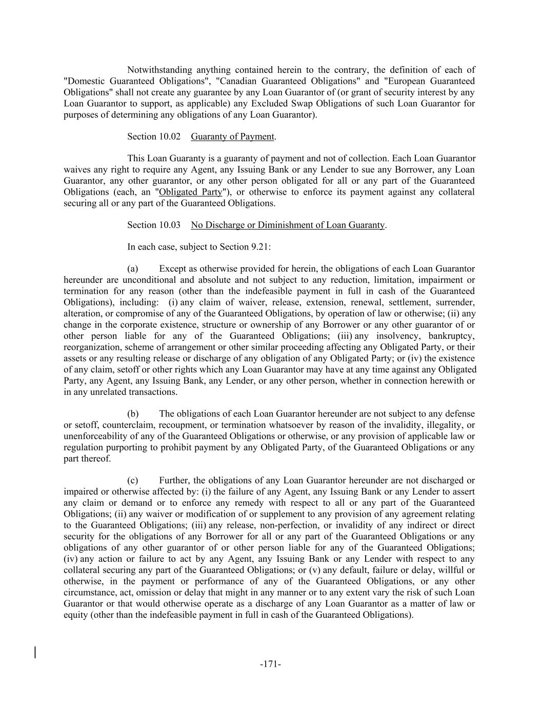 Notwithstanding anything contained herein to the contrary, the definition of each of "Domestic Guaranteed Obligations", "Canadian Guaranteed Obligations" and "European Guaranteed Obligations" shall not create any guarantee by any Loan Guarantor of (or grant of security interest by any Loan Guarantor to support, as applicable) any Excluded Swap Obligations of such Loan Guarantor for purposes of determining any obligations of any Loan Guarantor). Section 10.02 Guaranty of Payment. This Loan Guaranty is a guaranty of payment and not of collection. Each Loan Guarantor waives any right to require any Agent, any Issuing Bank or any Lender to sue any Borrower, any Loan Guarantor, any other guarantor, or any other person obligated for all or any part of the Guaranteed Obligations (each, an "Obligated Party"), or otherwise to enforce its payment against any collateral securing all or any part of the Guaranteed Obligations. Section 10.03 No Discharge or Diminishment of Loan Guaranty. In each case, subject to Section 9.21: (a) Except as otherwise provided for herein, the obligations of each Loan Guarantor hereunder are unconditional and absolute and not subject to any reduction, limitation, impairment or termination for any reason (other than the indefeasible payment in full in cash of the Guaranteed Obligations), including: (i) any claim of waiver, release, extension, renewal, settlement, surrender, alteration, or compromise of any of the Guaranteed Obligations, by operation of law or otherwise; (ii) any change in the corporate existence, structure or ownership of any Borrower or any other guarantor of or other person liable for any of the Guaranteed Obligations; (iii) any insolvency, bankruptcy, reorganization, scheme of arrangement or other similar proceeding affecting any Obligated Party, or their assets or any resulting release or discharge of any obligation of any Obligated Party; or (iv) the existence of any claim, setoff or other rights which any Loan Guarantor may have at any time against any Obligated Party, any Agent, any Issuing Bank, any Lender, or any other person, whether in connection herewith or in any unrelated transactions. (b) The obligations of each Loan Guarantor hereunder are not subject to any defense or setoff, counterclaim, recoupment, or termination whatsoever by reason of the invalidity, illegality, or unenforceability of any of the Guaranteed Obligations or otherwise, or any provision of applicable law or regulation purporting to prohibit payment by any Obligated Party, of the Guaranteed Obligations or any part thereof. (c) Further, the obligations of any Loan Guarantor hereunder are not discharged or impaired or otherwise affected by: (i) the failure of any Agent, any Issuing Bank or any Lender to assert any claim or demand or to enforce any remedy with respect to all or any part of the Guaranteed Obligations; (ii) any waiver or modification of or supplement to any provision of any agreement relating to the Guaranteed Obligations; (iii) any release, non-perfection, or invalidity of any indirect or direct security for the obligations of any Borrower for all or any part of the Guaranteed Obligations or any obligations of any other guarantor of or other person liable for any of the Guaranteed Obligations; (iv) any action or failure to act by any Agent, any Issuing Bank or any Lender with respect to any collateral securing any part of the Guaranteed Obligations; or (v) any default, failure or delay, willful or otherwise, in the payment or performance of any of the Guaranteed Obligations, or any other circumstance, act, omission or delay that might in any manner or to any extent vary the risk of such Loan Guarantor or that would otherwise operate as a discharge of any Loan Guarantor as a matter of law or equity (other than the indefeasible payment in full in cash of the Guaranteed Obligations). -171-