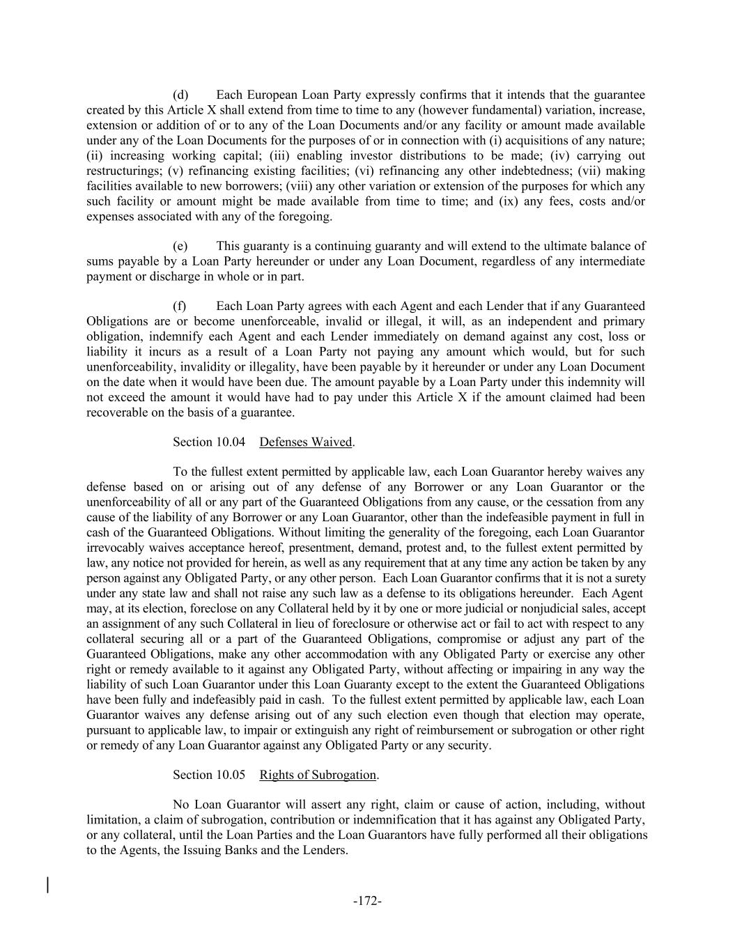 (d) Each European Loan Party expressly confirms that it intends that the guarantee created by this Article X shall extend from time to time to any (however fundamental) variation, increase, extension or addition of or to any of the Loan Documents and/or any facility or amount made available under any of the Loan Documents for the purposes of or in connection with (i) acquisitions of any nature; (ii) increasing working capital; (iii) enabling investor distributions to be made; (iv) carrying out restructurings; (v) refinancing existing facilities; (vi) refinancing any other indebtedness; (vii) making facilities available to new borrowers; (viii) any other variation or extension of the purposes for which any such facility or amount might be made available from time to time; and (ix) any fees, costs and/or expenses associated with any of the foregoing. (e) This guaranty is a continuing guaranty and will extend to the ultimate balance of sums payable by a Loan Party hereunder or under any Loan Document, regardless of any intermediate payment or discharge in whole or in part. (f) Each Loan Party agrees with each Agent and each Lender that if any Guaranteed Obligations are or become unenforceable, invalid or illegal, it will, as an independent and primary obligation, indemnify each Agent and each Lender immediately on demand against any cost, loss or liability it incurs as a result of a Loan Party not paying any amount which would, but for such unenforceability, invalidity or illegality, have been payable by it hereunder or under any Loan Document on the date when it would have been due. The amount payable by a Loan Party under this indemnity will not exceed the amount it would have had to pay under this Article X if the amount claimed had been recoverable on the basis of a guarantee. Section 10.04 Defenses Waived. To the fullest extent permitted by applicable law, each Loan Guarantor hereby waives any defense based on or arising out of any defense of any Borrower or any Loan Guarantor or the unenforceability of all or any part of the Guaranteed Obligations from any cause, or the cessation from any cause of the liability of any Borrower or any Loan Guarantor, other than the indefeasible payment in full in cash of the Guaranteed Obligations. Without limiting the generality of the foregoing, each Loan Guarantor irrevocably waives acceptance hereof, presentment, demand, protest and, to the fullest extent permitted by law, any notice not provided for herein, as well as any requirement that at any time any action be taken by any person against any Obligated Party, or any other person. Each Loan Guarantor confirms that it is not a surety under any state law and shall not raise any such law as a defense to its obligations hereunder. Each Agent may, at its election, foreclose on any Collateral held by it by one or more judicial or nonjudicial sales, accept an assignment of any such Collateral in lieu of foreclosure or otherwise act or fail to act with respect to any collateral securing all or a part of the Guaranteed Obligations, compromise or adjust any part of the Guaranteed Obligations, make any other accommodation with any Obligated Party or exercise any other right or remedy available to it against any Obligated Party, without affecting or impairing in any way the liability of such Loan Guarantor under this Loan Guaranty except to the extent the Guaranteed Obligations have been fully and indefeasibly paid in cash. To the fullest extent permitted by applicable law, each Loan Guarantor waives any defense arising out of any such election even though that election may operate, pursuant to applicable law, to impair or extinguish any right of reimbursement or subrogation or other right or remedy of any Loan Guarantor against any Obligated Party or any security. Section 10.05 Rights of Subrogation. No Loan Guarantor will assert any right, claim or cause of action, including, without limitation, a claim of subrogation, contribution or indemnification that it has against any Obligated Party, or any collateral, until the Loan Parties and the Loan Guarantors have fully performed all their obligations to the Agents, the Issuing Banks and the Lenders. -172-