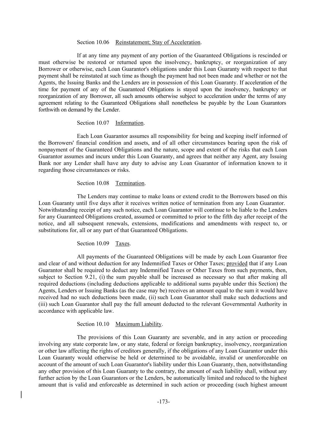 Section 10.06 Reinstatement; Stay of Acceleration. If at any time any payment of any portion of the Guaranteed Obligations is rescinded or must otherwise be restored or returned upon the insolvency, bankruptcy, or reorganization of any Borrower or otherwise, each Loan Guarantor's obligations under this Loan Guaranty with respect to that payment shall be reinstated at such time as though the payment had not been made and whether or not the Agents, the Issuing Banks and the Lenders are in possession of this Loan Guaranty. If acceleration of the time for payment of any of the Guaranteed Obligations is stayed upon the insolvency, bankruptcy or reorganization of any Borrower, all such amounts otherwise subject to acceleration under the terms of any agreement relating to the Guaranteed Obligations shall nonetheless be payable by the Loan Guarantors forthwith on demand by the Lender. Section 10.07 Information. Each Loan Guarantor assumes all responsibility for being and keeping itself informed of the Borrowers' financial condition and assets, and of all other circumstances bearing upon the risk of nonpayment of the Guaranteed Obligations and the nature, scope and extent of the risks that each Loan Guarantor assumes and incurs under this Loan Guaranty, and agrees that neither any Agent, any Issuing Bank nor any Lender shall have any duty to advise any Loan Guarantor of information known to it regarding those circumstances or risks. Section 10.08 Termination. The Lenders may continue to make loans or extend credit to the Borrowers based on this Loan Guaranty until five days after it receives written notice of termination from any Loan Guarantor. Notwithstanding receipt of any such notice, each Loan Guarantor will continue to be liable to the Lenders for any Guaranteed Obligations created, assumed or committed to prior to the fifth day after receipt of the notice, and all subsequent renewals, extensions, modifications and amendments with respect to, or substitutions for, all or any part of that Guaranteed Obligations. Section 10.09 Taxes. All payments of the Guaranteed Obligations will be made by each Loan Guarantor free and clear of and without deduction for any Indemnified Taxes or Other Taxes; provided that if any Loan Guarantor shall be required to deduct any Indemnified Taxes or Other Taxes from such payments, then, subject to Section 9.21, (i) the sum payable shall be increased as necessary so that after making all required deductions (including deductions applicable to additional sums payable under this Section) the Agents, Lenders or Issuing Banks (as the case may be) receives an amount equal to the sum it would have received had no such deductions been made, (ii) such Loan Guarantor shall make such deductions and (iii) such Loan Guarantor shall pay the full amount deducted to the relevant Governmental Authority in accordance with applicable law. Section 10.10 Maximum Liability. The provisions of this Loan Guaranty are severable, and in any action or proceeding involving any state corporate law, or any state, federal or foreign bankruptcy, insolvency, reorganization or other law affecting the rights of creditors generally, if the obligations of any Loan Guarantor under this Loan Guaranty would otherwise be held or determined to be avoidable, invalid or unenforceable on account of the amount of such Loan Guarantor's liability under this Loan Guaranty, then, notwithstanding any other provision of this Loan Guaranty to the contrary, the amount of such liability shall, without any further action by the Loan Guarantors or the Lenders, be automatically limited and reduced to the highest amount that is valid and enforceable as determined in such action or proceeding (such highest amount -173-