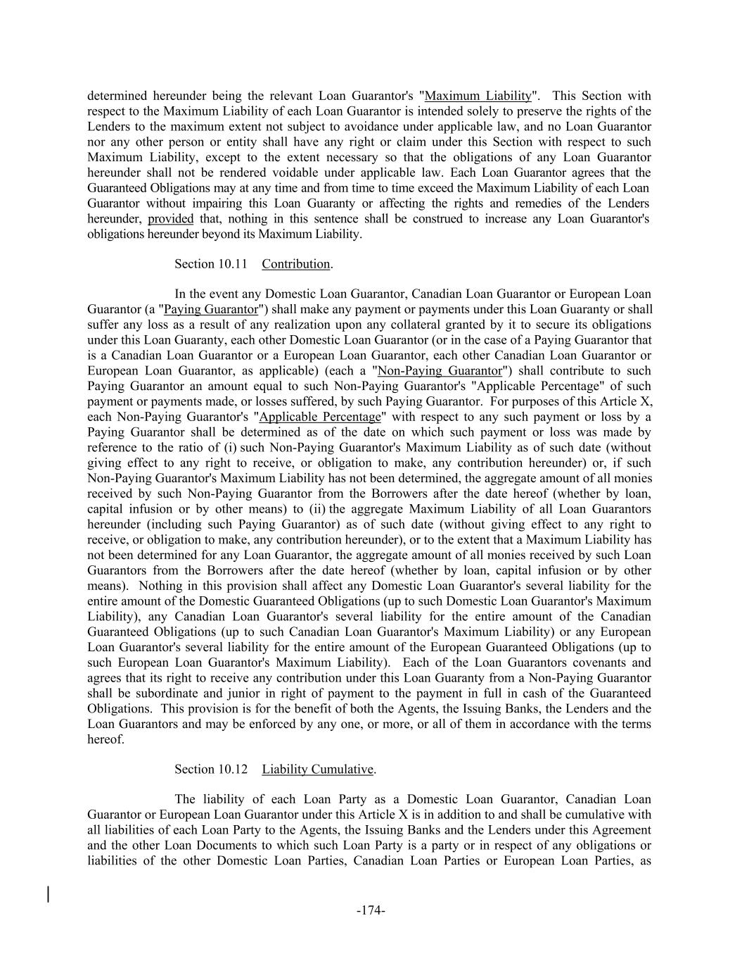 determined hereunder being the relevant Loan Guarantor's "Maximum Liability". This Section with respect to the Maximum Liability of each Loan Guarantor is intended solely to preserve the rights of the Lenders to the maximum extent not subject to avoidance under applicable law, and no Loan Guarantor nor any other person or entity shall have any right or claim under this Section with respect to such Maximum Liability, except to the extent necessary so that the obligations of any Loan Guarantor hereunder shall not be rendered voidable under applicable law. Each Loan Guarantor agrees that the Guaranteed Obligations may at any time and from time to time exceed the Maximum Liability of each Loan Guarantor without impairing this Loan Guaranty or affecting the rights and remedies of the Lenders hereunder, provided that, nothing in this sentence shall be construed to increase any Loan Guarantor's obligations hereunder beyond its Maximum Liability. Section 10.11 Contribution. In the event any Domestic Loan Guarantor, Canadian Loan Guarantor or European Loan Guarantor (a "Paying Guarantor") shall make any payment or payments under this Loan Guaranty or shall suffer any loss as a result of any realization upon any collateral granted by it to secure its obligations under this Loan Guaranty, each other Domestic Loan Guarantor (or in the case of a Paying Guarantor that is a Canadian Loan Guarantor or a European Loan Guarantor, each other Canadian Loan Guarantor or European Loan Guarantor, as applicable) (each a "Non-Paying Guarantor") shall contribute to such Paying Guarantor an amount equal to such Non-Paying Guarantor's "Applicable Percentage" of such payment or payments made, or losses suffered, by such Paying Guarantor. For purposes of this Article X, each Non-Paying Guarantor's "Applicable Percentage" with respect to any such payment or loss by a Paying Guarantor shall be determined as of the date on which such payment or loss was made by reference to the ratio of (i) such Non-Paying Guarantor's Maximum Liability as of such date (without giving effect to any right to receive, or obligation to make, any contribution hereunder) or, if such Non-Paying Guarantor's Maximum Liability has not been determined, the aggregate amount of all monies received by such Non-Paying Guarantor from the Borrowers after the date hereof (whether by loan, capital infusion or by other means) to (ii) the aggregate Maximum Liability of all Loan Guarantors hereunder (including such Paying Guarantor) as of such date (without giving effect to any right to receive, or obligation to make, any contribution hereunder), or to the extent that a Maximum Liability has not been determined for any Loan Guarantor, the aggregate amount of all monies received by such Loan Guarantors from the Borrowers after the date hereof (whether by loan, capital infusion or by other means). Nothing in this provision shall affect any Domestic Loan Guarantor's several liability for the entire amount of the Domestic Guaranteed Obligations (up to such Domestic Loan Guarantor's Maximum Liability), any Canadian Loan Guarantor's several liability for the entire amount of the Canadian Guaranteed Obligations (up to such Canadian Loan Guarantor's Maximum Liability) or any European Loan Guarantor's several liability for the entire amount of the European Guaranteed Obligations (up to such European Loan Guarantor's Maximum Liability). Each of the Loan Guarantors covenants and agrees that its right to receive any contribution under this Loan Guaranty from a Non-Paying Guarantor shall be subordinate and junior in right of payment to the payment in full in cash of the Guaranteed Obligations. This provision is for the benefit of both the Agents, the Issuing Banks, the Lenders and the Loan Guarantors and may be enforced by any one, or more, or all of them in accordance with the terms hereof. Section 10.12 Liability Cumulative. The liability of each Loan Party as a Domestic Loan Guarantor, Canadian Loan Guarantor or European Loan Guarantor under this Article X is in addition to and shall be cumulative with all liabilities of each Loan Party to the Agents, the Issuing Banks and the Lenders under this Agreement and the other Loan Documents to which such Loan Party is a party or in respect of any obligations or liabilities of the other Domestic Loan Parties, Canadian Loan Parties or European Loan Parties, as -174-
