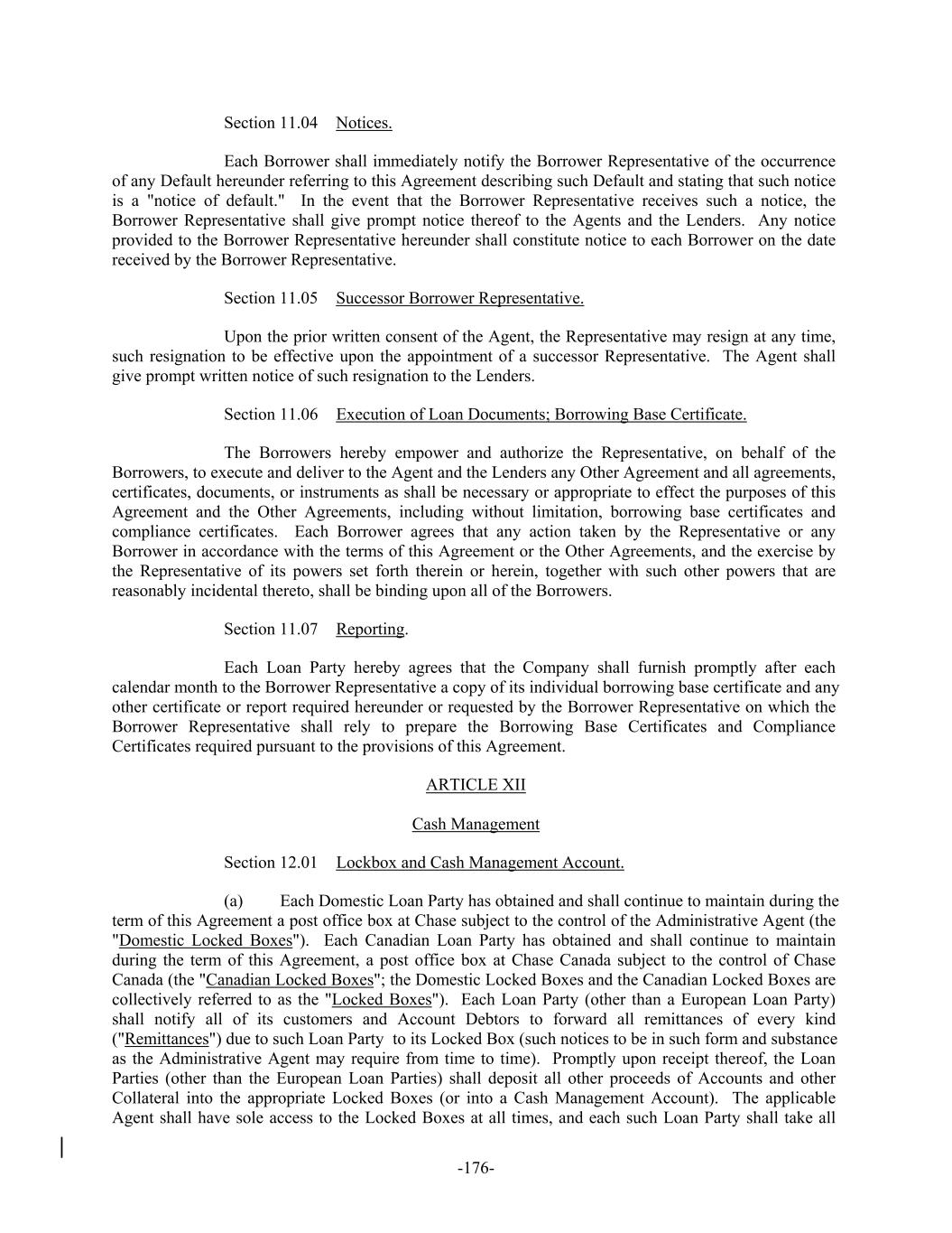 Section 11.04 Notices. Each Borrower shall immediately notify the Borrower Representative of the occurrence of any Default hereunder referring to this Agreement describing such Default and stating that such notice is a "notice of default." In the event that the Borrower Representative receives such a notice, the Borrower Representative shall give prompt notice thereof to the Agents and the Lenders. Any notice provided to the Borrower Representative hereunder shall constitute notice to each Borrower on the date received by the Borrower Representative. Section 11.05 Successor Borrower Representative. Upon the prior written consent of the Agent, the Representative may resign at any time, such resignation to be effective upon the appointment of a successor Representative. The Agent shall give prompt written notice of such resignation to the Lenders. Section 11.06 Execution of Loan Documents; Borrowing Base Certificate. The Borrowers hereby empower and authorize the Representative, on behalf of the Borrowers, to execute and deliver to the Agent and the Lenders any Other Agreement and all agreements, certificates, documents, or instruments as shall be necessary or appropriate to effect the purposes of this Agreement and the Other Agreements, including without limitation, borrowing base certificates and compliance certificates. Each Borrower agrees that any action taken by the Representative or any Borrower in accordance with the terms of this Agreement or the Other Agreements, and the exercise by the Representative of its powers set forth therein or herein, together with such other powers that are reasonably incidental thereto, shall be binding upon all of the Borrowers. Section 11.07 Reporting. Each Loan Party hereby agrees that the Company shall furnish promptly after each calendar month to the Borrower Representative a copy of its individual borrowing base certificate and any other certificate or report required hereunder or requested by the Borrower Representative on which the Borrower Representative shall rely to prepare the Borrowing Base Certificates and Compliance Certificates required pursuant to the provisions of this Agreement. ARTICLE XII Cash Management Section 12.01 Lockbox and Cash Management Account. (a) Each Domestic Loan Party has obtained and shall continue to maintain during the term of this Agreement a post office box at Chase subject to the control of the Administrative Agent (the "Domestic Locked Boxes"). Each Canadian Loan Party has obtained and shall continue to maintain during the term of this Agreement, a post office box at Chase Canada subject to the control of Chase Canada (the "Canadian Locked Boxes"; the Domestic Locked Boxes and the Canadian Locked Boxes are collectively referred to as the "Locked Boxes"). Each Loan Party (other than a European Loan Party) shall notify all of its customers and Account Debtors to forward all remittances of every kind ("Remittances") due to such Loan Party to its Locked Box (such notices to be in such form and substance as the Administrative Agent may require from time to time). Promptly upon receipt thereof, the Loan Parties (other than the European Loan Parties) shall deposit all other proceeds of Accounts and other Collateral into the appropriate Locked Boxes (or into a Cash Management Account). The applicable Agent shall have sole access to the Locked Boxes at all times, and each such Loan Party shall take all -176-