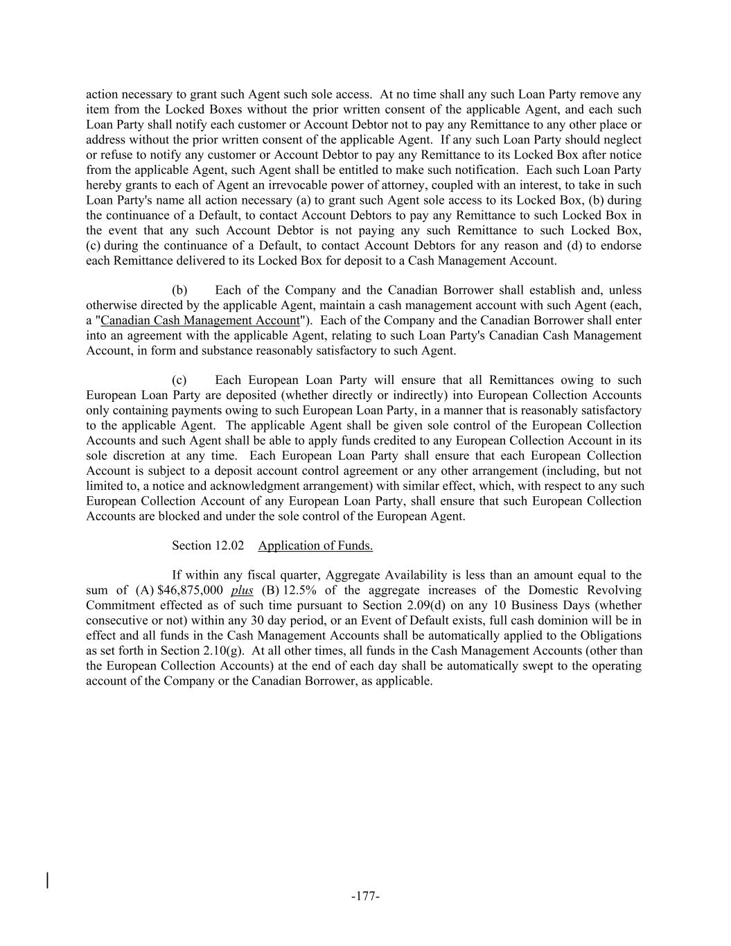 action necessary to grant such Agent such sole access. At no time shall any such Loan Party remove any item from the Locked Boxes without the prior written consent of the applicable Agent, and each such Loan Party shall notify each customer or Account Debtor not to pay any Remittance to any other place or address without the prior written consent of the applicable Agent. If any such Loan Party should neglect or refuse to notify any customer or Account Debtor to pay any Remittance to its Locked Box after notice from the applicable Agent, such Agent shall be entitled to make such notification. Each such Loan Party hereby grants to each of Agent an irrevocable power of attorney, coupled with an interest, to take in such Loan Party's name all action necessary (a) to grant such Agent sole access to its Locked Box, (b) during the continuance of a Default, to contact Account Debtors to pay any Remittance to such Locked Box in the event that any such Account Debtor is not paying any such Remittance to such Locked Box, (c) during the continuance of a Default, to contact Account Debtors for any reason and (d) to endorse each Remittance delivered to its Locked Box for deposit to a Cash Management Account. (b) Each of the Company and the Canadian Borrower shall establish and, unless otherwise directed by the applicable Agent, maintain a cash management account with such Agent (each, a "Canadian Cash Management Account"). Each of the Company and the Canadian Borrower shall enter into an agreement with the applicable Agent, relating to such Loan Party's Canadian Cash Management Account, in form and substance reasonably satisfactory to such Agent. (c) Each European Loan Party will ensure that all Remittances owing to such European Loan Party are deposited (whether directly or indirectly) into European Collection Accounts only containing payments owing to such European Loan Party, in a manner that is reasonably satisfactory to the applicable Agent. The applicable Agent shall be given sole control of the European Collection Accounts and such Agent shall be able to apply funds credited to any European Collection Account in its sole discretion at any time. Each European Loan Party shall ensure that each European Collection Account is subject to a deposit account control agreement or any other arrangement (including, but not limited to, a notice and acknowledgment arrangement) with similar effect, which, with respect to any such European Collection Account of any European Loan Party, shall ensure that such European Collection Accounts are blocked and under the sole control of the European Agent. Section 12.02 Application of Funds. If within any fiscal quarter, Aggregate Availability is less than an amount equal to the sum of (A) $46,875,000 plus (B) 12.5% of the aggregate increases of the Domestic Revolving Commitment effected as of such time pursuant to Section 2.09(d) on any 10 Business Days (whether consecutive or not) within any 30 day period, or an Event of Default exists, full cash dominion will be in effect and all funds in the Cash Management Accounts shall be automatically applied to the Obligations as set forth in Section 2.10(g). At all other times, all funds in the Cash Management Accounts (other than the European Collection Accounts) at the end of each day shall be automatically swept to the operating account of the Company or the Canadian Borrower, as applicable. -177-
