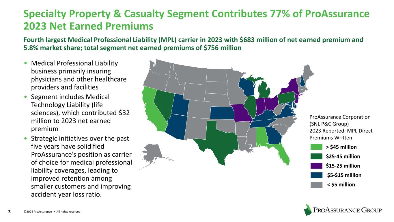 ©2024 ProAssurance • All rights reserved. 2 Our Shared Vision We will be the best in the world at understanding and providing solutions for the risks our customers encounter as healers, innovators, employers, and professionals. Through an integrated family of specialty companies, products, and services, we will be a trusted partner enabling those we serve to focus on their vital work. As the Employer of Choice, we embrace every day as a singular opportunity to reach for extraordinary outcomes, build and deepen superior relationships, advance diversity, equity, and inclusion, and accomplish our mission with infectious enthusiasm and unbending integrity. Our Core Values • Unbending Integrity • Leadership That Works • Superior Relationships • Infectious Enthusiasm The ProAssurance Mission: We protect others. Over 1,000 Team Members Serving Insureds in 50 states and Washington, D.C. 2023 Net Earned Premium $977M Total Assets at Year-end 2023 $5.6B Shareholders’ Equity at Year-end 2023 $1.1B A.M. Best “A” (Excellent)