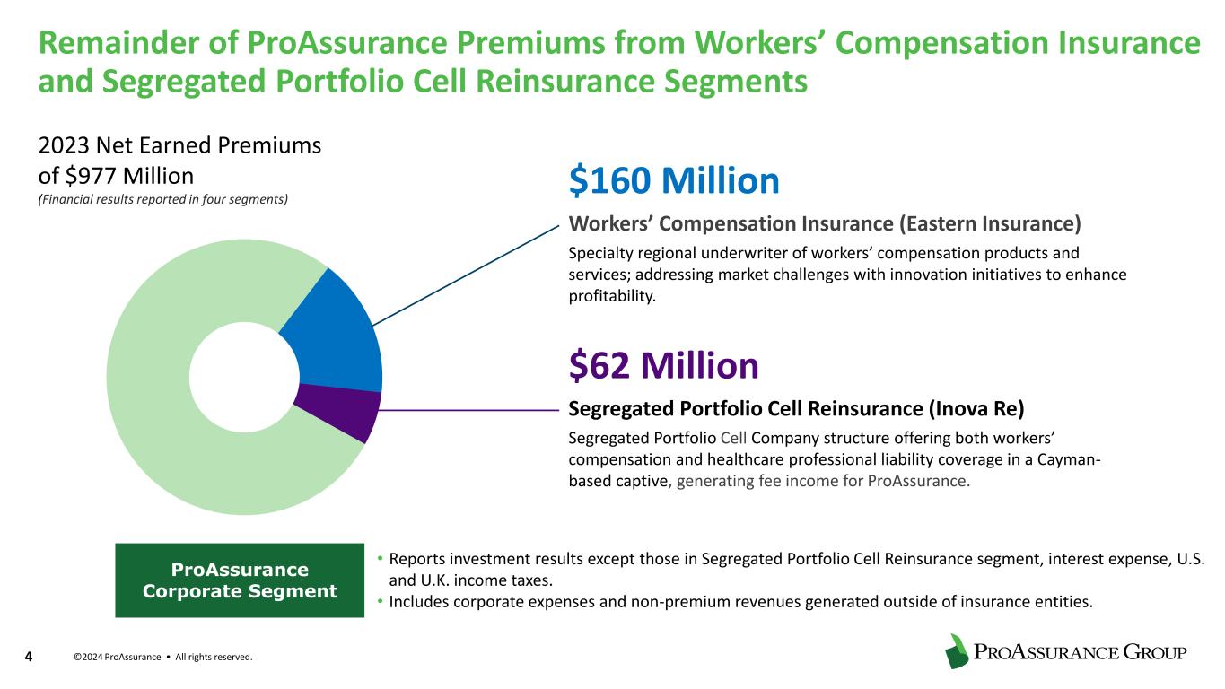 ©2024 ProAssurance • All rights reserved. 3 ProAssurance Corporation (SNL P&C Group) 2023 Reported: MPL Direct Premiums Written > $45 million $25-45 million $15-25 million $5-$15 million < $5 million Fourth largest Medical Professional Liability (MPL) carrier in 2023 with $683 million of net earned premium and 5.8% market share; total segment net earned premiums of $756 million Specialty Property & Casualty Segment Contributes 77% of ProAssurance 2023 Net Earned Premiums • Medical Professional Liability business primarily insuring physicians and other healthcare providers and facilities • Segment includes Medical Technology Liability (life sciences), which contributed $32 million to 2023 net earned premium • Strategic initiatives over the past five years have solidified ProAssurance’s position as carrier of choice for medical professional liability coverages, leading to improved retention among smaller customers and improving accident year loss ratio.