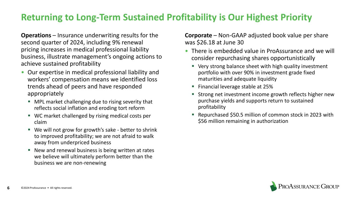 ©2024 ProAssurance • All rights reserved. 6 Operations – Insurance underwriting results for the second quarter of 2024, including 9% renewal pricing increases in medical professional liability business, illustrate management’s ongoing actions to achieve sustained profitability • Our expertise in medical professional liability and workers’ compensation means we identified loss trends ahead of peers and have responded appropriately ▪ MPL market challenging due to rising severity that reflects social inflation and eroding tort reform ▪ WC market challenged by rising medical costs per claim ▪ We will not grow for growth’s sake - better to shrink to improved profitability; we are not afraid to walk away from underpriced business ▪ New and renewal business is being written at rates we believe will ultimately perform better than the business we are non-renewing Corporate – Non-GAAP adjusted book value per share was $26.18 at June 30 • There is embedded value in ProAssurance and we will consider repurchasing shares opportunistically ▪ Very strong balance sheet with high quality investment portfolio with over 90% in investment grade fixed maturities and adequate liquidity ▪ Financial leverage stable at 25% ▪ Strong net investment income growth reflects higher new purchase yields and supports return to sustained profitability ▪ Repurchased $50.5 million of common stock in 2023 with $56 million remaining in authorization Returning to Long-Term Sustained Profitability is Our Highest Priority