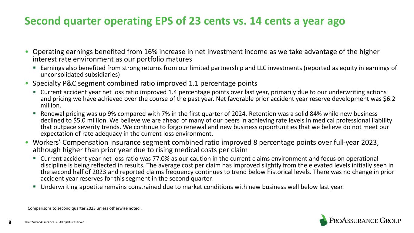 ©2024 ProAssurance • All rights reserved. 7 Specialty Property & Casualty – Restore profitability and support appropriate growth • Obtain rate beyond loss cost trend • Distinguish ProAssurance as carrier of choice for medical professional liability coverages ▪ Use technology to support superior customer experiences for our distribution partners and policyholders ▪ Prioritize needs of more profitable small to mid-size accounts ▪ Launch state-of-the-art workflow solution and online portal ▪ Implement straight-through processing technologies to reduce costs • Invest in innovation solutions that enhance risk selection, pricing accuracy and workflows ▪ Leverage our data science and predictive analytics capabilities to support growth in appropriate markets and subsectors • Assist insureds with strategies to mitigate future losses Corporate – Provide strong net investment income stream to bolster underwriting contribution • Leverage higher interest rate environment to increase portfolio yield • Consolidate statutory entities to maximize efficiency and capital utilization • Manage talent-acquisition and retention strategies to maximize value of work force Workers’ Compensation – Minimize impact of medical inflation • Improve efficiency with newly implemented integrated policy, claims, risk management, and billing systems • Reduce loss costs by managing selection of providers and implementing cost management programs • Leverage investments in InsurTech underwriting, AI and claims data analytics to: ▪ Improve penetration in more profitable small account market segment ▪ Improve efficiency by expanding use of AI in underwriting and claims Strategic Initiatives - Addressing Challenging Markets