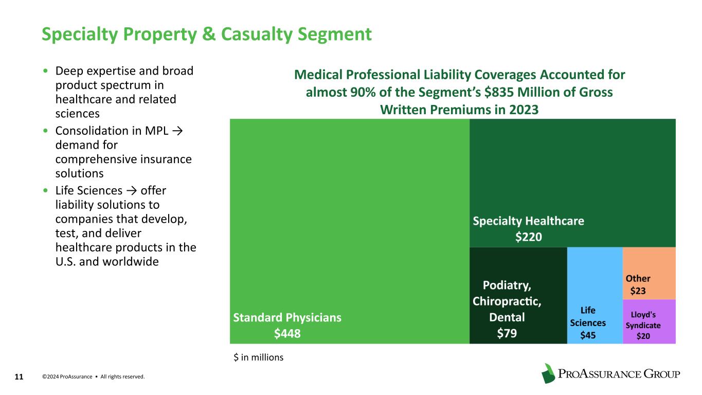 ©2024 ProAssurance • All rights reserved. 10 A Foundation in Excellence SUPERIOR BRAND IDENTITY AND REPUTATION IN THE MARKET SCOPE & SCALE Regional hubs combined with local knowledge of market dynamics and regulatory environments HISTORY OF SUCCESSFUL MERGERS & ACQUISITIONS Selective M&A with best-in-class partners, and nearly 20 transactions in our 47-year history EXPERIENCED & COLLABORATIVE LEADERSHIP Average executive leadership tenure of 20 years with PRA or subsidiaries SPECIALIZATION Deep expertise and commitment to our customers throughout the insurance cycles enable us to outperform our peers over time “Our long history in our markets makes us confident that the cyclical lines of insurance where we do business will respond to our focused efforts” -Ned Rand President & CEO