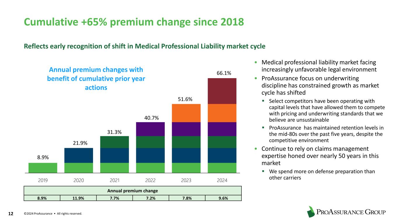 ©2024 ProAssurance • All rights reserved. 11 • Deep expertise and broad product spectrum in healthcare and related sciences • Consolidation in MPL → demand for comprehensive insurance solutions • Life Sciences → offer liability solutions to companies that develop, test, and deliver healthcare products in the U.S. and worldwide Specialty Property & Casualty Segment $ in millions Medical Professional Liability Coverages Accounted for almost 90% of the Segment’s $835 Million of Gross Written Premiums in 2023