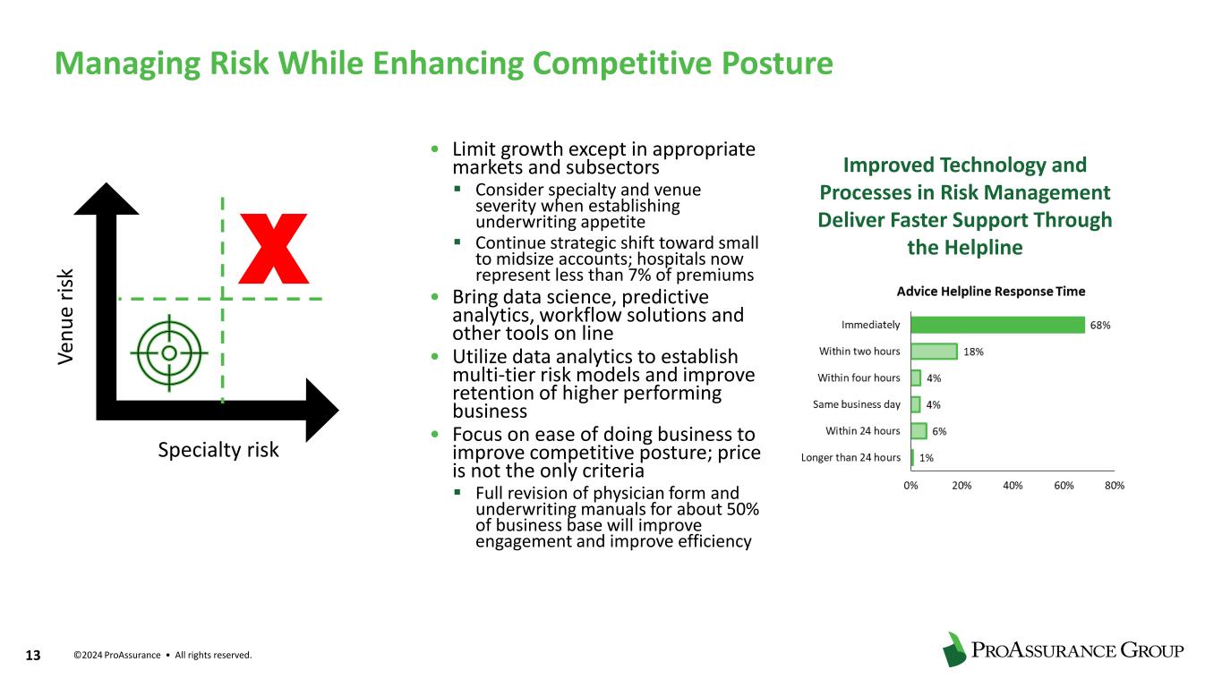 ©2024 ProAssurance • All rights reserved. 12 Cumulative +65% premium change since 2018 2019 2020 2021 2022 2023 2024 • Medical professional liability market facing increasingly unfavorable legal environment • ProAssurance focus on underwriting discipline has constrained growth as market cycle has shifted ▪ Select competitors have been operating with capital levels that have allowed them to compete with pricing and underwriting standards that we believe are unsustainable ▪ ProAssurance has maintained retention levels in the mid-80s over the past five years, despite the competitive environment • Continue to rely on claims management expertise honed over nearly 50 years in this market ▪ We spend more on defense preparation than other carriers Annual premium change 8.9% 11.9% 7.7% 7.2% 7.8% 9.6% Reflects early recognition of shift in Medical Professional Liability market cycle 8.9% 21.9% 31.3% 40.7% 51.6% 66.1% Annual premium changes with benefit of cumulative prior year actions