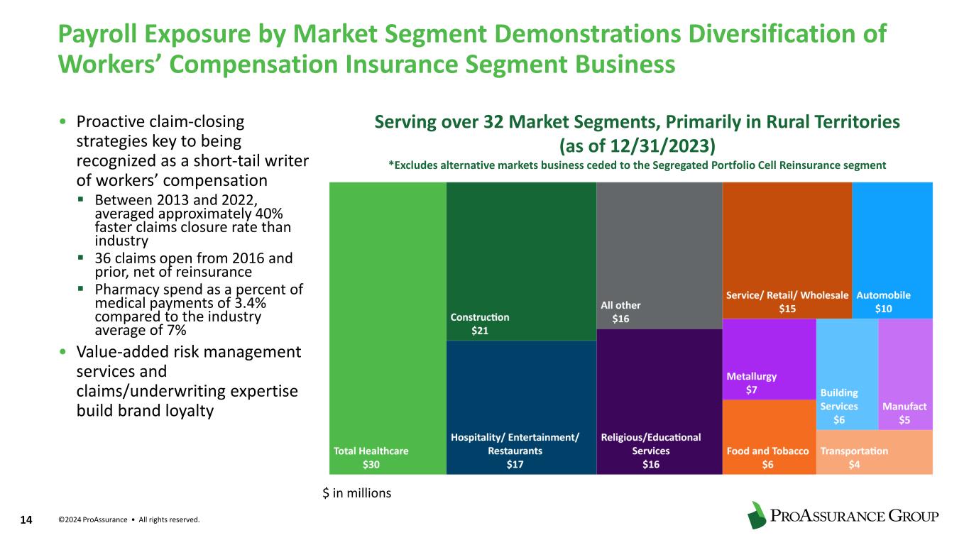 ©2024 ProAssurance • All rights reserved. 13 Managing Risk While Enhancing Competitive Posture • Limit growth except in appropriate markets and subsectors ▪ Consider specialty and venue severity when establishing underwriting appetite ▪ Continue strategic shift toward small to midsize accounts; hospitals now represent less than 7% of premiums • Bring data science, predictive analytics, workflow solutions and other tools on line • Utilize data analytics to establish multi-tier risk models and improve retention of higher performing business • Focus on ease of doing business to improve competitive posture; price is not the only criteria ▪ Full revision of physician form and underwriting manuals for about 50% of business base will improve engagement and improve efficiency Improved Technology and Processes in Risk Management Deliver Faster Support Through the Helpline V en u e r is k Specialty risk X
