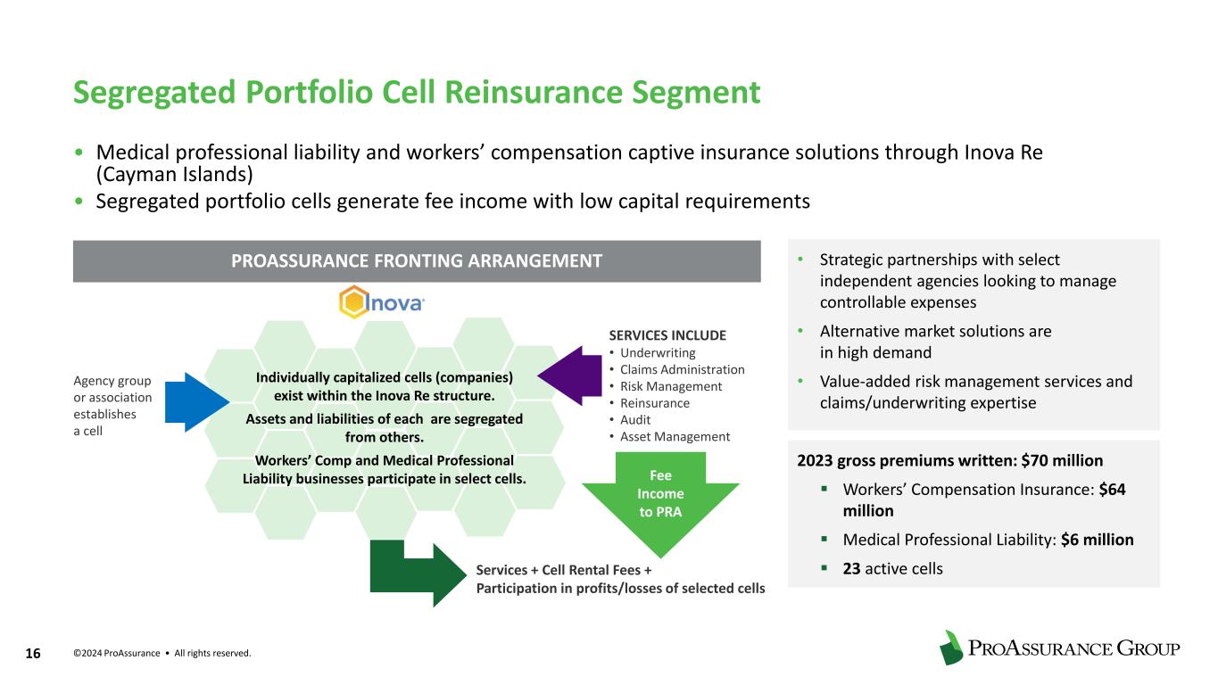 ©2024 ProAssurance • All rights reserved. 15 Workers’ Compensation Insurance Segment Addressing Market Challenges With Innovation Initiatives • Implemented new integrated policy, claims, risk management and billing systems, paving the way for innovation initiatives • Expand use of data analytics to guide and support operational decisions in underwriting and claims, focusing on improving ease of doing business for agency partners and insureds • Capitalize on InsurTech investments, including AI, underwriting and claims data analytics, to enhance profitability, productivity and efficiency ▪ Adopting Clara Analytics AI Platform to lower medical costs and achieve better outcomes ▪ Implementing GuideWire for underwriting of more profitable small account business ▪ Adding Roots Automation “digital co-workers” capabilities to improve efficiency and effectiveness of underwriting and claims teams Use cases for Clara Analytics, a real-time augmented intelligence partner with workers’ comp expertise focused on providing optimal insurance claims outcomes, include: • Lower medical and indemnity costs with the best providers • Predict severity and balance adjuster caseload at first notice of loss • Gain insights and save expense by collating, searching and analyzing claim medical bills and records with treatment timelines and smart alerts • Grading defense and plaintiff attorneys on their outcomes in past similar claims