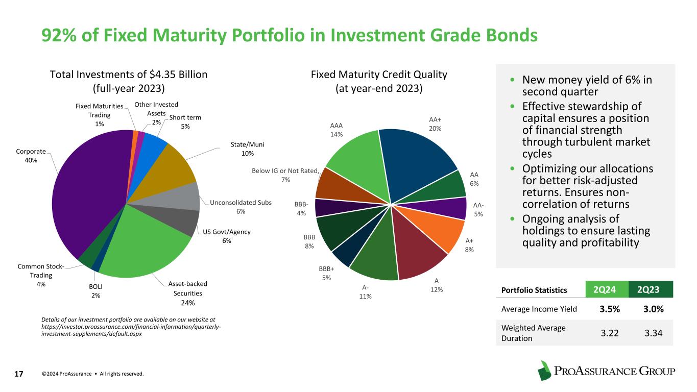 ©2024 ProAssurance • All rights reserved. 16 Agency group or association establishes a cell SERVICES INCLUDE • Underwriting • Claims Administration • Risk Management • Reinsurance • Audit • Asset Management Services + Cell Rental Fees + Participation in profits/losses of selected cells Fee Income to PRA • Strategic partnerships with select independent agencies looking to manage controllable expenses • Alternative market solutions are in high demand • Value-added risk management services and claims/underwriting expertise Individually capitalized cells (companies) exist within the Inova Re structure. Assets and liabilities of each are segregated from others. Workers’ Comp and Medical Professional Liability businesses participate in select cells. PROASSURANCE FRONTING ARRANGEMENT Segregated Portfolio Cell Reinsurance Segment • Medical professional liability and workers’ compensation captive insurance solutions through Inova Re (Cayman Islands) • Segregated portfolio cells generate fee income with low capital requirements 2023 gross premiums written: $70 million ▪ Workers’ Compensation Insurance: $64 million ▪ Medical Professional Liability: $6 million ▪ 23 active cells