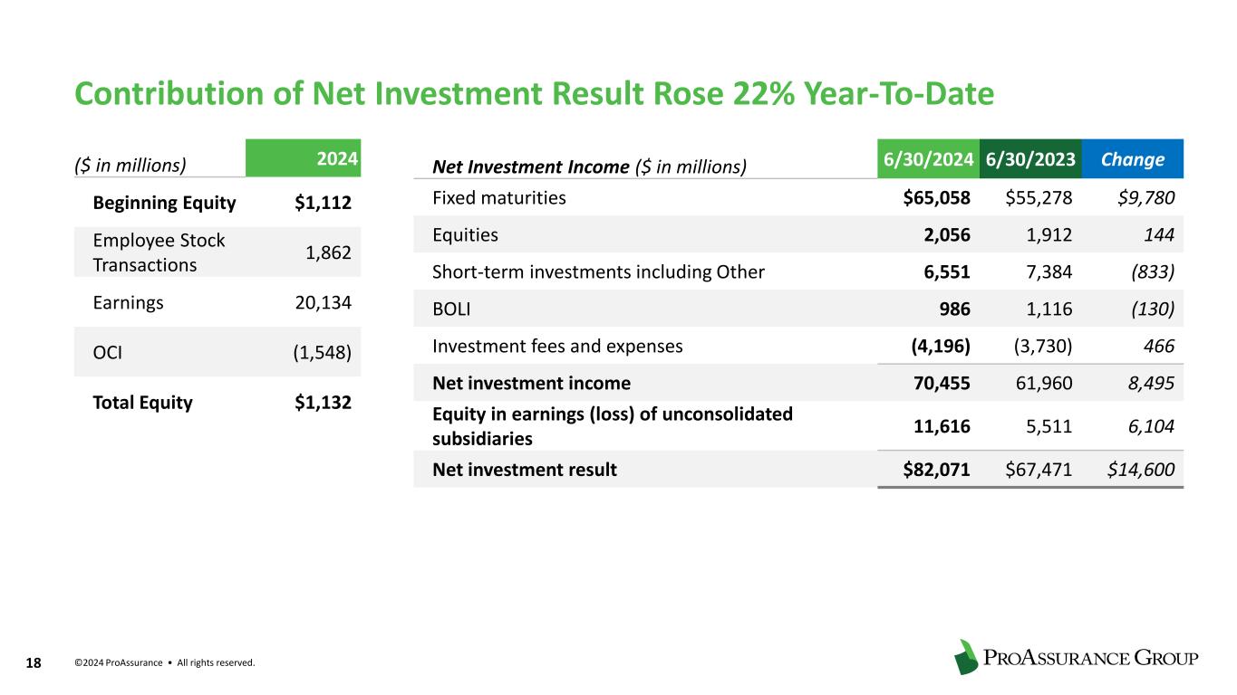 ©2024 ProAssurance • All rights reserved. 17 AAA 14% AA+ 20% AA 6% AA- 5% A+ 8% A 12%A- 11% BBB+ 5% BBB 8% BBB- 4% Below IG or Not Rated, 7% Details of our investment portfolio are available on our website at https://investor.proassurance.com/financial-information/quarterly- investment-supplements/default.aspx 92% of Fixed Maturity Portfolio in Investment Grade Bonds • New money yield of 6% in second quarter • Effective stewardship of capital ensures a position of financial strength through turbulent market cycles • Optimizing our allocations for better risk-adjusted returns. Ensures non- correlation of returns • Ongoing analysis of holdings to ensure lasting quality and profitability Total Investments of $4.35 Billion (full-year 2023) Portfolio Statistics 2Q24 2Q23 Average Income Yield 3.5% 3.0% Weighted Average Duration 3.22 3.34 Fixed Maturity Credit Quality (at year-end 2023) Asset-backed Securities 24% BOLI 2% Common Stock- Trading 4% Corporate 40% Fixed Maturities Trading 1% Other Invested Assets 2% Short term 5% State/Muni 10% Unconsolidated Subs 6% US Govt/Agency 6%