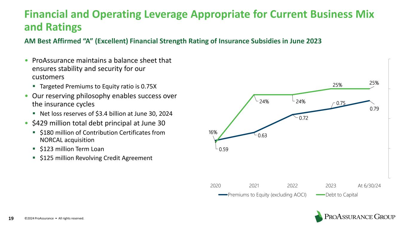 ©2024 ProAssurance • All rights reserved. 18 Contribution of Net Investment Result Rose 22% Year-To-Date ($ in millions) 2024 Beginning Equity $1,112 Employee Stock Transactions 1,862 Earnings 20,134 OCI (1,548) Total Equity $1,132 Net Investment Income ($ in millions) 6/30/2024 6/30/2023 Change Fixed maturities $65,058 $55,278 $9,780 Equities 2,056 1,912 144 Short-term investments including Other 6,551 7,384 (833) BOLI 986 1,116 (130) Investment fees and expenses (4,196) (3,730) 466 Net investment income 70,455 61,960 8,495 Equity in earnings (loss) of unconsolidated subsidiaries 11,616 5,511 6,104 Net investment result $82,071 $67,471 $14,600