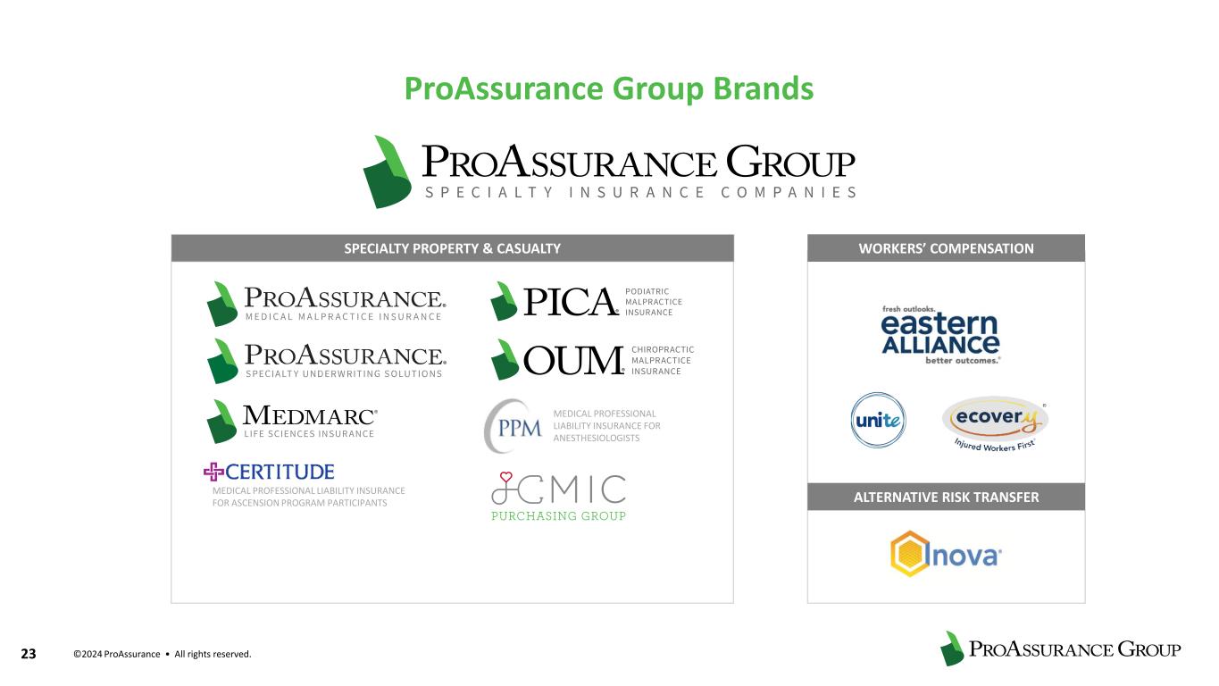 23 ©2024 ProAssurance • All rights reserved. ProAssurance Group Brands ALTERNATIVE RISK TRANSFER WORKERS’ COMPENSATIONSPECIALTY PROPERTY & CASUALTY MEDICAL PROFESSIONAL LIABILITY INSURANCE FOR ANESTHESIOLOGISTS MEDICAL PROFESSIONAL LIABILITY INSURANCE FOR ASCENSION PROGRAM PARTICIPANTS