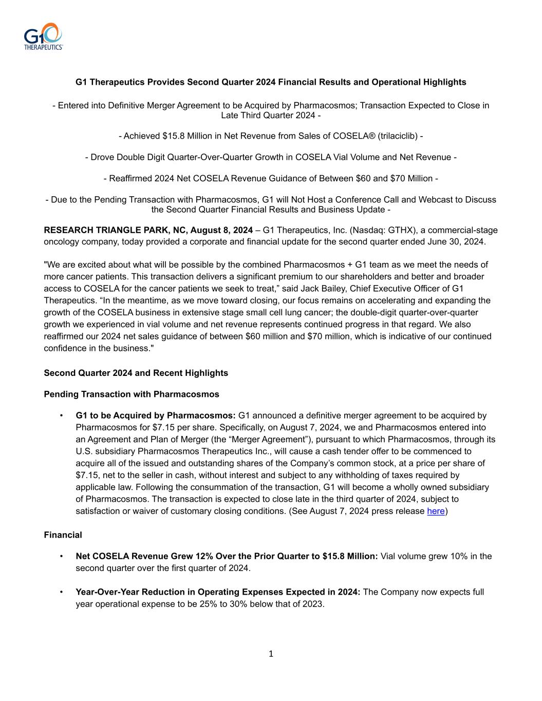 1 G1 Therapeutics Provides Second Quarter 2024 Financial Results and Operational Highlights - Entered into Definitive Merger Agreement to be Acquired by Pharmacosmos; Transaction Expected to Close in Late Third Quarter 2024 - - Achieved $15.8 Million in Net Revenue from Sales of COSELA® (trilaciclib) - - Drove Double Digit Quarter-Over-Quarter Growth in COSELA Vial Volume and Net Revenue - - Reaffirmed 2024 Net COSELA Revenue Guidance of Between $60 and $70 Million - - Due to the Pending Transaction with Pharmacosmos, G1 will Not Host a Conference Call and Webcast to Discuss the Second Quarter Financial Results and Business Update - RESEARCH TRIANGLE PARK, NC, August 8, 2024 – G1 Therapeutics, Inc. (Nasdaq: GTHX), a commercial-stage oncology company, today provided a corporate and financial update for the second quarter ended June 30, 2024. "We are excited about what will be possible by the combined Pharmacosmos + G1 team as we meet the needs of more cancer patients. This transaction delivers a significant premium to our shareholders and better and broader access to COSELA for the cancer patients we seek to treat,” said Jack Bailey, Chief Executive Officer of G1 Therapeutics. “In the meantime, as we move toward closing, our focus remains on accelerating and expanding the growth of the COSELA business in extensive stage small cell lung cancer; the double-digit quarter-over-quarter growth we experienced in vial volume and net revenue represents continued progress in that regard. We also reaffirmed our 2024 net sales guidance of between $60 million and $70 million, which is indicative of our continued confidence in the business." Second Quarter 2024 and Recent Highlights Pending Transaction with Pharmacosmos • G1 to be Acquired by Pharmacosmos: G1 announced a definitive merger agreement to be acquired by Pharmacosmos for $7.15 per share. Specifically, on August 7, 2024, we and Pharmacosmos entered into an Agreement and Plan of Merger (the “Merger Agreement”), pursuant to which Pharmacosmos, through its U.S. subsidiary Pharmacosmos Therapeutics Inc., will cause a cash tender offer to be commenced to acquire all of the issued and outstanding shares of the Company’s common stock, at a price per share of $7.15, net to the seller in cash, without interest and subject to any withholding of taxes required by applicable law. Following the consummation of the transaction, G1 will become a wholly owned subsidiary of Pharmacosmos. The transaction is expected to close late in the third quarter of 2024, subject to satisfaction or waiver of customary closing conditions. (See August 7, 2024 press release here) Financial • Net COSELA Revenue Grew 12% Over the Prior Quarter to $15.8 Million: Vial volume grew 10% in the second quarter over the first quarter of 2024. • Year-Over-Year Reduction in Operating Expenses Expected in 2024: The Company now expects full year operational expense to be 25% to 30% below that of 2023.