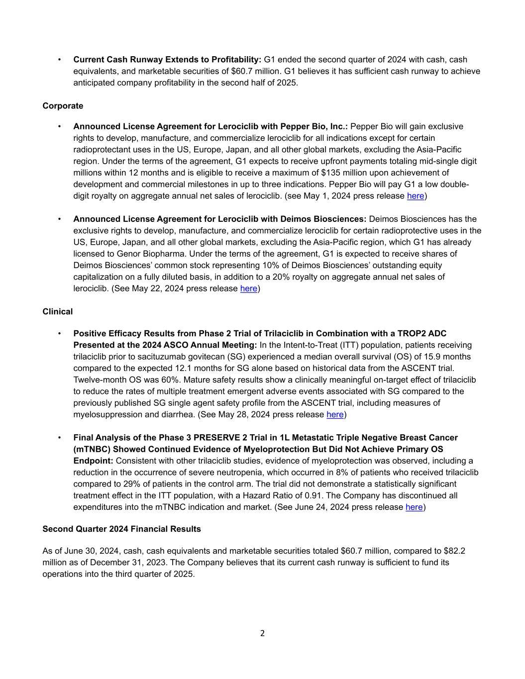 2 • Current Cash Runway Extends to Profitability: G1 ended the second quarter of 2024 with cash, cash equivalents, and marketable securities of $60.7 million. G1 believes it has sufficient cash runway to achieve anticipated company profitability in the second half of 2025. Corporate • Announced License Agreement for Lerociclib with Pepper Bio, Inc.: Pepper Bio will gain exclusive rights to develop, manufacture, and commercialize lerociclib for all indications except for certain radioprotectant uses in the US, Europe, Japan, and all other global markets, excluding the Asia-Pacific region. Under the terms of the agreement, G1 expects to receive upfront payments totaling mid-single digit millions within 12 months and is eligible to receive a maximum of $135 million upon achievement of development and commercial milestones in up to three indications. Pepper Bio will pay G1 a low double- digit royalty on aggregate annual net sales of lerociclib. (see May 1, 2024 press release here) • Announced License Agreement for Lerociclib with Deimos Biosciences: Deimos Biosciences has the exclusive rights to develop, manufacture, and commercialize lerociclib for certain radioprotective uses in the US, Europe, Japan, and all other global markets, excluding the Asia-Pacific region, which G1 has already licensed to Genor Biopharma. Under the terms of the agreement, G1 is expected to receive shares of Deimos Biosciences’ common stock representing 10% of Deimos Biosciences’ outstanding equity capitalization on a fully diluted basis, in addition to a 20% royalty on aggregate annual net sales of lerociclib. (See May 22, 2024 press release here) Clinical • Positive Efficacy Results from Phase 2 Trial of Trilaciclib in Combination with a TROP2 ADC Presented at the 2024 ASCO Annual Meeting: In the Intent-to-Treat (ITT) population, patients receiving trilaciclib prior to sacituzumab govitecan (SG) experienced a median overall survival (OS) of 15.9 months compared to the expected 12.1 months for SG alone based on historical data from the ASCENT trial. Twelve-month OS was 60%. Mature safety results show a clinically meaningful on-target effect of trilaciclib to reduce the rates of multiple treatment emergent adverse events associated with SG compared to the previously published SG single agent safety profile from the ASCENT trial, including measures of myelosuppression and diarrhea. (See May 28, 2024 press release here) • Final Analysis of the Phase 3 PRESERVE 2 Trial in 1L Metastatic Triple Negative Breast Cancer (mTNBC) Showed Continued Evidence of Myeloprotection But Did Not Achieve Primary OS Endpoint: Consistent with other trilaciclib studies, evidence of myeloprotection was observed, including a reduction in the occurrence of severe neutropenia, which occurred in 8% of patients who received trilaciclib compared to 29% of patients in the control arm. The trial did not demonstrate a statistically significant treatment effect in the ITT population, with a Hazard Ratio of 0.91. The Company has discontinued all expenditures into the mTNBC indication and market. (See June 24, 2024 press release here) Second Quarter 2024 Financial Results As of June 30, 2024, cash, cash equivalents and marketable securities totaled $60.7 million, compared to $82.2 million as of December 31, 2023. The Company believes that its current cash runway is sufficient to fund its operations into the third quarter of 2025.