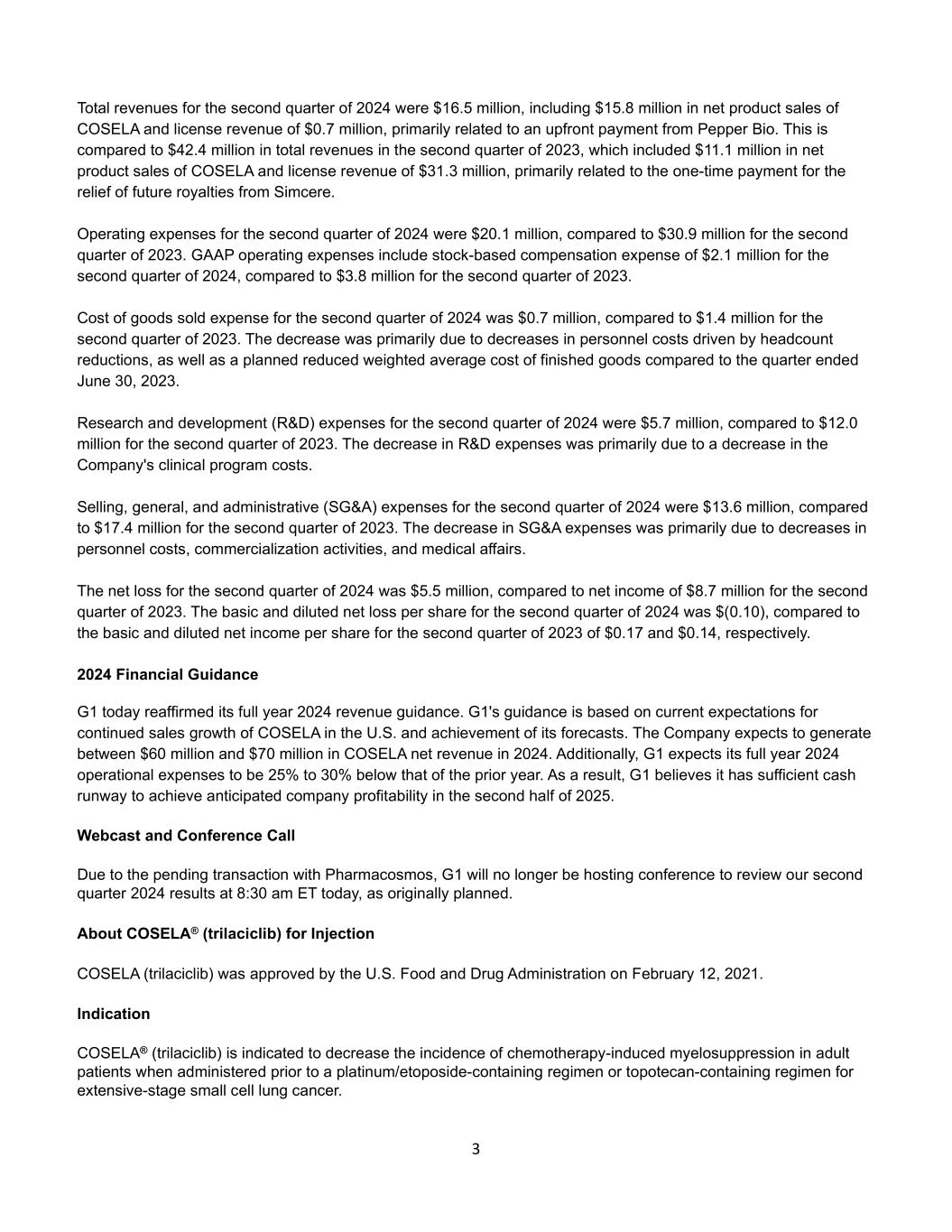 3 Total revenues for the second quarter of 2024 were $16.5 million, including $15.8 million in net product sales of COSELA and license revenue of $0.7 million, primarily related to an upfront payment from Pepper Bio. This is compared to $42.4 million in total revenues in the second quarter of 2023, which included $11.1 million in net product sales of COSELA and license revenue of $31.3 million, primarily related to the one-time payment for the relief of future royalties from Simcere. Operating expenses for the second quarter of 2024 were $20.1 million, compared to $30.9 million for the second quarter of 2023. GAAP operating expenses include stock-based compensation expense of $2.1 million for the second quarter of 2024, compared to $3.8 million for the second quarter of 2023. Cost of goods sold expense for the second quarter of 2024 was $0.7 million, compared to $1.4 million for the second quarter of 2023. The decrease was primarily due to decreases in personnel costs driven by headcount reductions, as well as a planned reduced weighted average cost of finished goods compared to the quarter ended June 30, 2023. Research and development (R&D) expenses for the second quarter of 2024 were $5.7 million, compared to $12.0 million for the second quarter of 2023. The decrease in R&D expenses was primarily due to a decrease in the Company's clinical program costs. Selling, general, and administrative (SG&A) expenses for the second quarter of 2024 were $13.6 million, compared to $17.4 million for the second quarter of 2023. The decrease in SG&A expenses was primarily due to decreases in personnel costs, commercialization activities, and medical affairs. The net loss for the second quarter of 2024 was $5.5 million, compared to net income of $8.7 million for the second quarter of 2023. The basic and diluted net loss per share for the second quarter of 2024 was $(0.10), compared to the basic and diluted net income per share for the second quarter of 2023 of $0.17 and $0.14, respectively. 2024 Financial Guidance G1 today reaffirmed its full year 2024 revenue guidance. G1's guidance is based on current expectations for continued sales growth of COSELA in the U.S. and achievement of its forecasts. The Company expects to generate between $60 million and $70 million in COSELA net revenue in 2024. Additionally, G1 expects its full year 2024 operational expenses to be 25% to 30% below that of the prior year. As a result, G1 believes it has sufficient cash runway to achieve anticipated company profitability in the second half of 2025. Webcast and Conference Call Due to the pending transaction with Pharmacosmos, G1 will no longer be hosting conference to review our second quarter 2024 results at 8:30 am ET today, as originally planned. About COSELA® (trilaciclib) for Injection COSELA (trilaciclib) was approved by the U.S. Food and Drug Administration on February 12, 2021. Indication COSELA® (trilaciclib) is indicated to decrease the incidence of chemotherapy-induced myelosuppression in adult patients when administered prior to a platinum/etoposide-containing regimen or topotecan-containing regimen for extensive-stage small cell lung cancer.