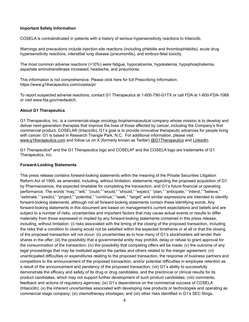 4 Important Safety Information COSELA is contraindicated in patients with a history of serious hypersensitivity reactions to trilaciclib. Warnings and precautions include injection-site reactions (including phlebitis and thrombophlebitis), acute drug hypersensitivity reactions, interstitial lung disease (pneumonitis), and embryo-fetal toxicity. The most common adverse reactions (>10%) were fatigue, hypocalcemia, hypokalemia, hypophosphatemia, aspartate aminotransferase increased, headache, and pneumonia. This information is not comprehensive. Please click here for full Prescribing Information. https://www.g1therapeutics.com/cosela/pi/ To report suspected adverse reactions, contact G1 Therapeutics at 1-800-790-G1TX or call FDA at 1-800-FDA-1088 or visit www.fda.gov/medwatch. About G1 Therapeutics G1 Therapeutics, Inc. is a commercial-stage oncology biopharmaceutical company whose mission is to develop and deliver next-generation therapies that improve the lives of those affected by cancer, including the Company’s first commercial product, COSELA® (trilaciclib). G1’s goal is to provide innovative therapeutic advances for people living with cancer. G1 is based in Research Triangle Park, N.C. For additional information, please visit www.g1therapeutics.com and follow us on X (formerly known as Twitter) @G1Therapeutics and LinkedIn. G1 Therapeutics® and the G1 Therapeutics logo and COSELA® and the COSELA logo are trademarks of G1 Therapeutics, Inc. Forward-Looking Statements This press release contains forward-looking statements within the meaning of the Private Securities Litigation Reform Act of 1995, as amended, including, without limitation, statements regarding the proposed acquisition of G1 by Pharmacosmos, the expected timetable for completing the transaction, and G1’s future financial or operating performance. The words “may,” “will,” “could,” “would,” “should,” “expect,” “plan,” “anticipate,” “intend,” “believe,” “estimate,” “predict,” “project,” “potential,” “continue,” “seek,” “target” and similar expressions are intended to identify forward-looking statements, although not all forward-looking statements contain these identifying words. Any forward-looking statements in this document are based on management’s current expectations and beliefs and are subject to a number of risks, uncertainties and important factors that may cause actual events or results to differ materially from those expressed or implied by any forward-looking statements contained in this press release, including, without limitation: (i) risks associated with the timing of the closing of the proposed transaction, including the risks that a condition to closing would not be satisfied within the expected timeframe or at all or that the closing of the proposed transaction will not occur; (ii) uncertainties as to how many of G1’s stockholders will tender their shares in the offer; (iii) the possibility that a governmental entity may prohibit, delay or refuse to grant approval for the consummation of the transaction; (iv) the possibility that competing offers will be made; (v) the outcome of any legal proceedings that may be instituted against the parties and others related to the merger agreement; (vi) unanticipated difficulties or expenditures relating to the proposed transaction, the response of business partners and competitors to the announcement of the proposed transaction, and/or potential difficulties in employee retention as a result of the announcement and pendency of the proposed transaction; (vii) G1’s ability to successfully demonstrate the efficacy and safety of its drug or drug candidates, and the preclinical or clinical results for its product candidates, which may not support further development of such product candidates; (viii) comments, feedback and actions of regulatory agencies; (ix) G1’s dependence on the commercial success of COSELA (trilaciclib); (x) the inherent uncertainties associated with developing new products or technologies and operating as commercial stage company; (xi) chemotherapy shortages; and (xii) other risks identified in G1’s SEC filings,