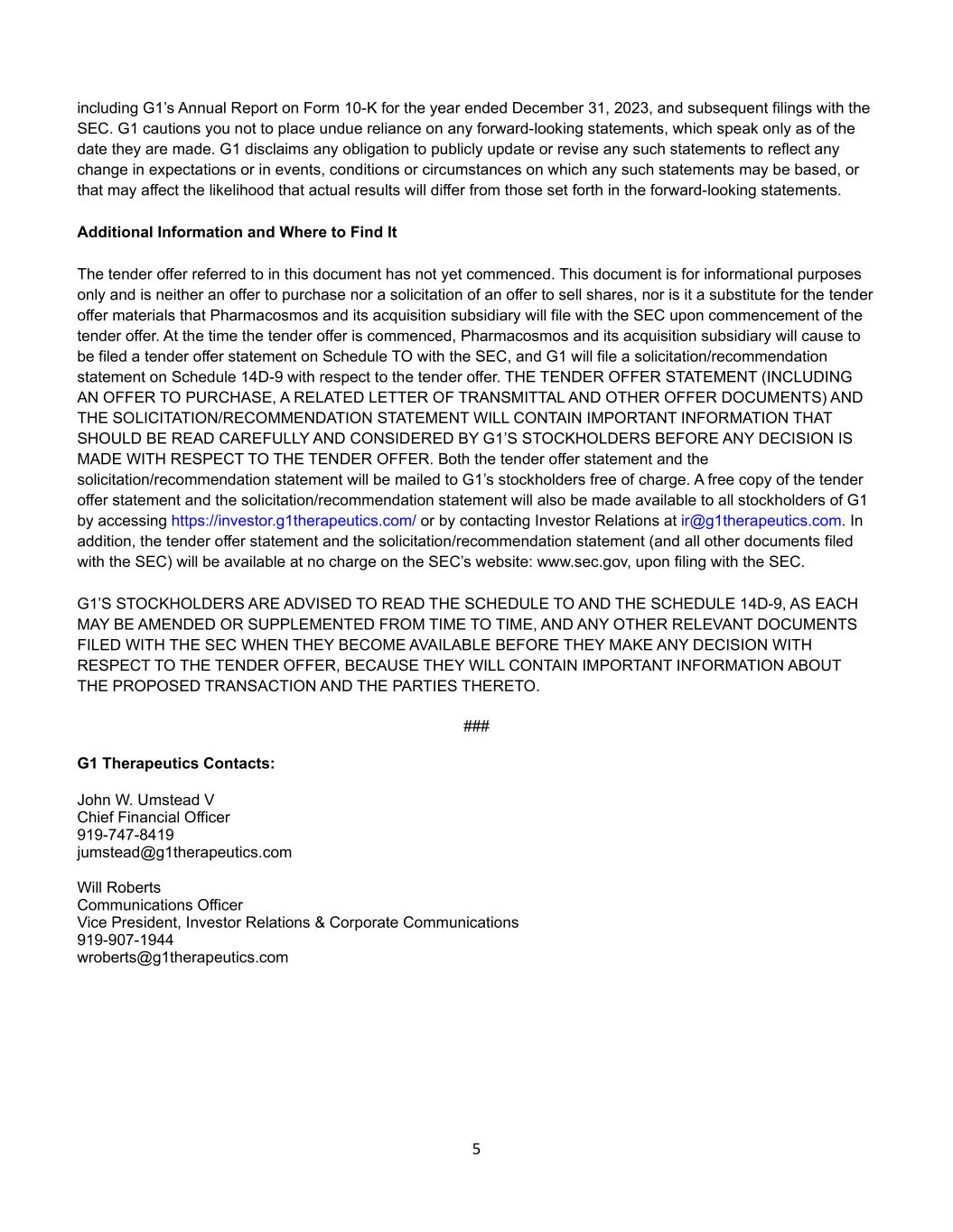 5 including G1’s Annual Report on Form 10-K for the year ended December 31, 2023, and subsequent filings with the SEC. G1 cautions you not to place undue reliance on any forward-looking statements, which speak only as of the date they are made. G1 disclaims any obligation to publicly update or revise any such statements to reflect any change in expectations or in events, conditions or circumstances on which any such statements may be based, or that may affect the likelihood that actual results will differ from those set forth in the forward-looking statements. Additional Information and Where to Find It The tender offer referred to in this document has not yet commenced. This document is for informational purposes only and is neither an offer to purchase nor a solicitation of an offer to sell shares, nor is it a substitute for the tender offer materials that Pharmacosmos and its acquisition subsidiary will file with the SEC upon commencement of the tender offer. At the time the tender offer is commenced, Pharmacosmos and its acquisition subsidiary will cause to be filed a tender offer statement on Schedule TO with the SEC, and G1 will file a solicitation/recommendation statement on Schedule 14D-9 with respect to the tender offer. THE TENDER OFFER STATEMENT (INCLUDING AN OFFER TO PURCHASE, A RELATED LETTER OF TRANSMITTAL AND OTHER OFFER DOCUMENTS) AND THE SOLICITATION/RECOMMENDATION STATEMENT WILL CONTAIN IMPORTANT INFORMATION THAT SHOULD BE READ CAREFULLY AND CONSIDERED BY G1’S STOCKHOLDERS BEFORE ANY DECISION IS MADE WITH RESPECT TO THE TENDER OFFER. Both the tender offer statement and the solicitation/recommendation statement will be mailed to G1’s stockholders free of charge. A free copy of the tender offer statement and the solicitation/recommendation statement will also be made available to all stockholders of G1 by accessing https://investor.g1therapeutics.com/ or by contacting Investor Relations at ir@g1therapeutics.com. In addition, the tender offer statement and the solicitation/recommendation statement (and all other documents filed with the SEC) will be available at no charge on the SEC’s website: www.sec.gov, upon filing with the SEC. G1’S STOCKHOLDERS ARE ADVISED TO READ THE SCHEDULE TO AND THE SCHEDULE 14D-9, AS EACH MAY BE AMENDED OR SUPPLEMENTED FROM TIME TO TIME, AND ANY OTHER RELEVANT DOCUMENTS FILED WITH THE SEC WHEN THEY BECOME AVAILABLE BEFORE THEY MAKE ANY DECISION WITH RESPECT TO THE TENDER OFFER, BECAUSE THEY WILL CONTAIN IMPORTANT INFORMATION ABOUT THE PROPOSED TRANSACTION AND THE PARTIES THERETO. ### G1 Therapeutics Contacts: John W. Umstead V Chief Financial Officer 919-747-8419 jumstead@g1therapeutics.com Will Roberts Communications Officer Vice President, Investor Relations & Corporate Communications 919-907-1944 wroberts@g1therapeutics.com