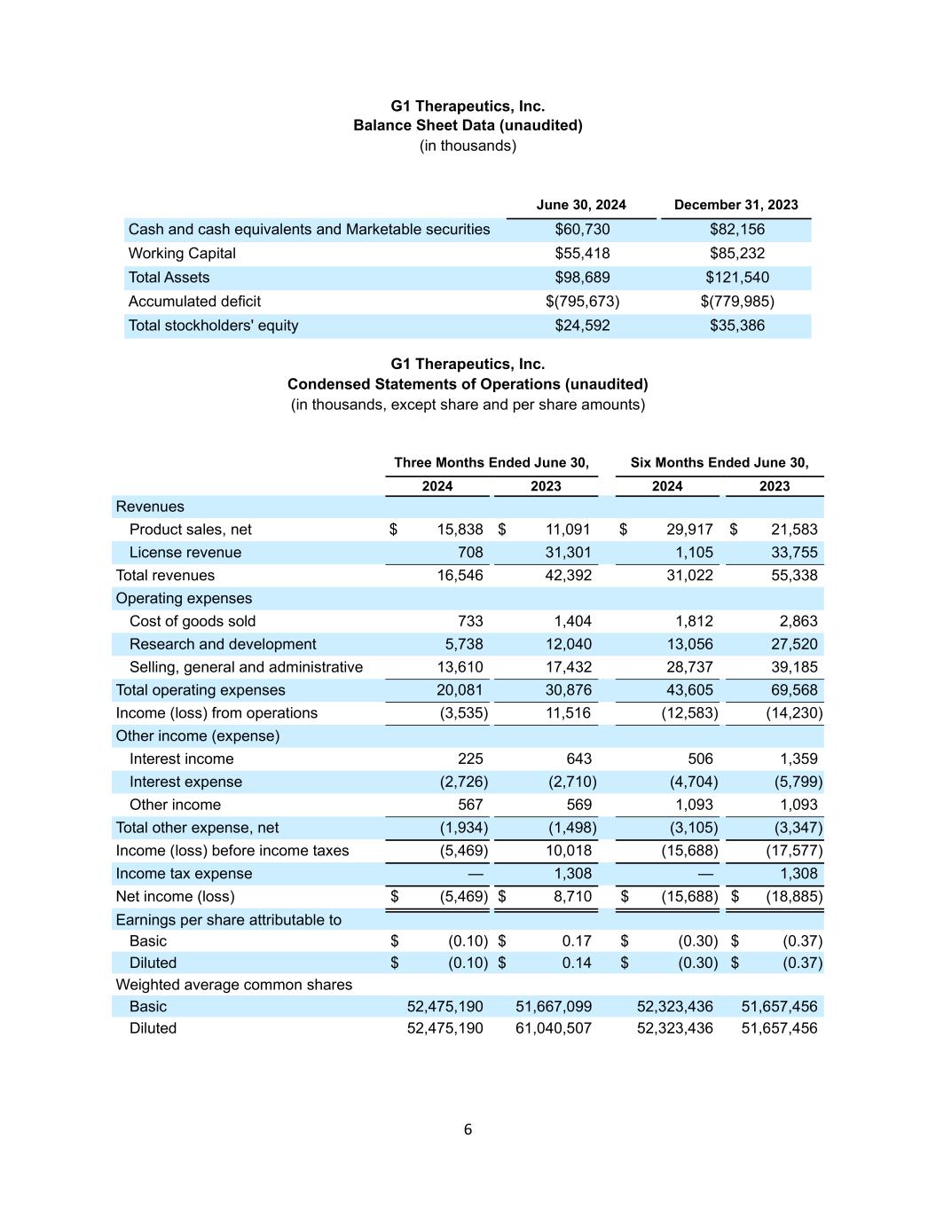 6 G1 Therapeutics, Inc. Balance Sheet Data (unaudited) (in thousands) June 30, 2024 December 31, 2023 Cash and cash equivalents and Marketable securities $60,730 $82,156 Working Capital $55,418 $85,232 Total Assets $98,689 $121,540 Accumulated deficit $(795,673) $(779,985) Total stockholders' equity $24,592 $35,386 G1 Therapeutics, Inc. Condensed Statements of Operations (unaudited) (in thousands, except share and per share amounts) Three Months Ended June 30, Six Months Ended June 30, 2024 2023 2024 2023 Revenues Product sales, net $ 15,838 $ 11,091 $ 29,917 $ 21,583 License revenue 708 31,301 1,105 33,755 Total revenues 16,546 42,392 31,022 55,338 Operating expenses Cost of goods sold 733 1,404 1,812 2,863 Research and development 5,738 12,040 13,056 27,520 Selling, general and administrative 13,610 17,432 28,737 39,185 Total operating expenses 20,081 30,876 43,605 69,568 Income (loss) from operations (3,535) 11,516 (12,583) (14,230) Other income (expense) Interest income 225 643 506 1,359 Interest expense (2,726) (2,710) (4,704) (5,799) Other income 567 569 1,093 1,093 Total other expense, net (1,934) (1,498) (3,105) (3,347) Income (loss) before income taxes (5,469) 10,018 (15,688) (17,577) Income tax expense — 1,308 — 1,308 Net income (loss) $ (5,469) $ 8,710 $ (15,688) $ (18,885) Earnings per share attributable to Basic $ (0.10) $ 0.17 $ (0.30) $ (0.37) Diluted $ (0.10) $ 0.14 $ (0.30) $ (0.37) Weighted average common shares Basic 52,475,190 51,667,099 52,323,436 51,657,456 Diluted 52,475,190 61,040,507 52,323,436 51,657,456