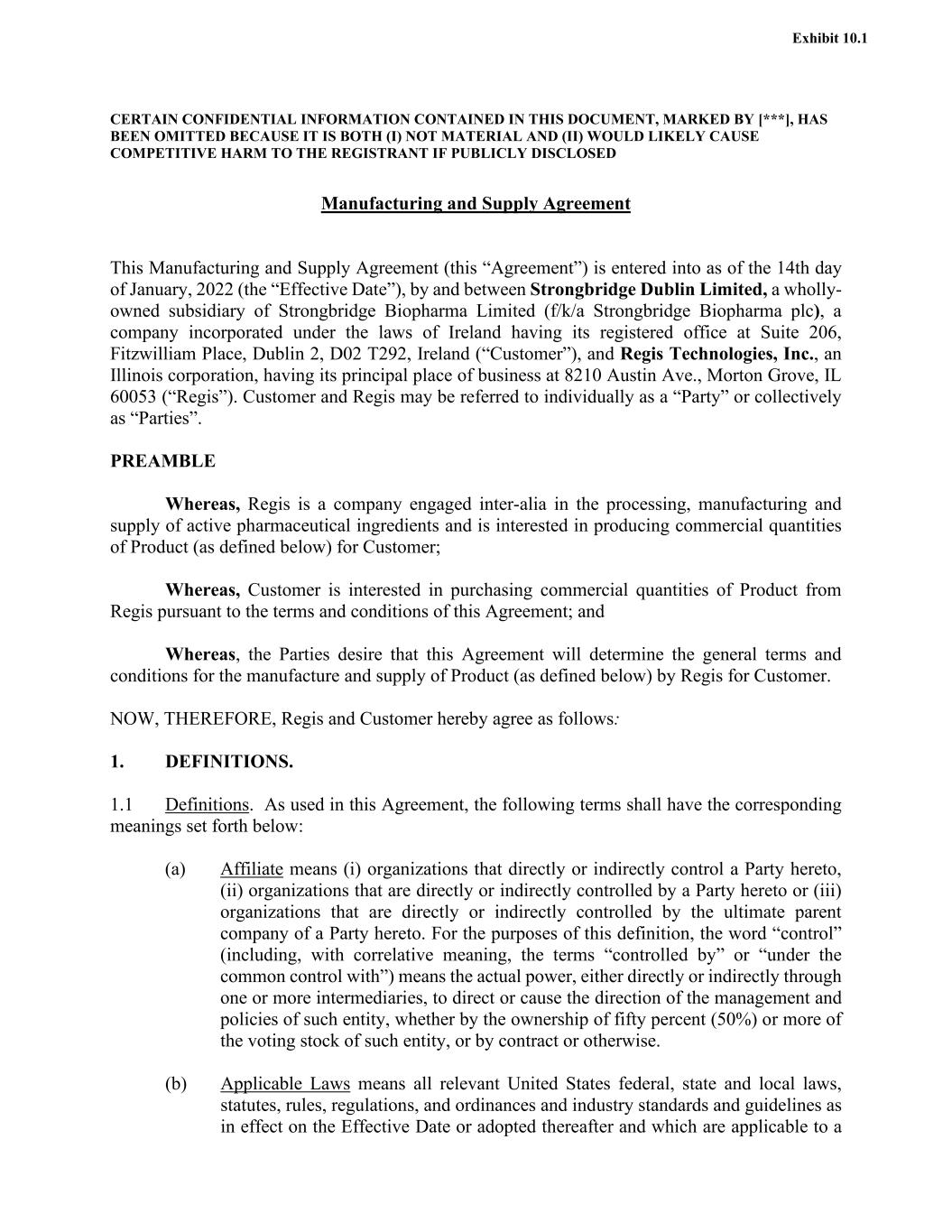 CERTAIN CONFIDENTIAL INFORMATION CONTAINED IN THIS DOCUMENT, MARKED BY [***], HAS BEEN OMITTED BECAUSE IT IS BOTH (I) NOT MATERIAL AND (II) WOULD LIKELY CAUSE COMPETITIVE HARM TO THE REGISTRANT IF PUBLICLY DISCLOSED Manufacturing and Supply Agreement This Manufacturing and Supply Agreement (this “Agreement”) is entered into as of the 14th day of January, 2022 (the “Effective Date”), by and between Strongbridge Dublin Limited, a wholly- owned subsidiary of Strongbridge Biopharma Limited (f/k/a Strongbridge Biopharma plc), a company incorporated under the laws of Ireland having its registered office at Suite 206, Fitzwilliam Place, Dublin 2, D02 T292, Ireland (“Customer”), and Regis Technologies, Inc., an Illinois corporation, having its principal place of business at 8210 Austin Ave., Morton Grove, IL 60053 (“Regis”). Customer and Regis may be referred to individually as a “Party” or collectively as “Parties”. PREAMBLE Whereas, Regis is a company engaged inter-alia in the processing, manufacturing and supply of active pharmaceutical ingredients and is interested in producing commercial quantities of Product (as defined below) for Customer; Whereas, Customer is interested in purchasing commercial quantities of Product from Regis pursuant to the terms and conditions of this Agreement; and Whereas, the Parties desire that this Agreement will determine the general terms and conditions for the manufacture and supply of Product (as defined below) by Regis for Customer. NOW, THEREFORE, Regis and Customer hereby agree as follows: 1. DEFINITIONS. 1.1 Definitions. As used in this Agreement, the following terms shall have the corresponding meanings set forth below: (a) Affiliate means (i) organizations that directly or indirectly control a Party hereto, (ii) organizations that are directly or indirectly controlled by a Party hereto or (iii) organizations that are directly or indirectly controlled by the ultimate parent company of a Party hereto. For the purposes of this definition, the word “control” (including, with correlative meaning, the terms “controlled by” or “under the common control with”) means the actual power, either directly or indirectly through one or more intermediaries, to direct or cause the direction of the management and policies of such entity, whether by the ownership of fifty percent (50%) or more of the voting stock of such entity, or by contract or otherwise. (b) Applicable Laws means all relevant United States federal, state and local laws, statutes, rules, regulations, and ordinances and industry standards and guidelines as in effect on the Effective Date or adopted thereafter and which are applicable to a Exhibit 10.1
