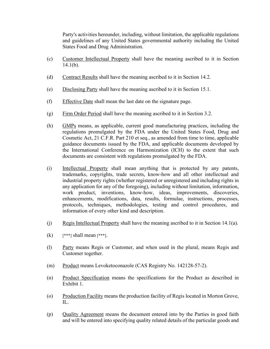 Party's activities hereunder, including, without limitation, the applicable regulations and guidelines of any United States governmental authority including the United States Food and Drug Administration. (c) Customer Intellectual Property shall have the meaning ascribed to it in Section 14.1(b). (d) Contract Results shall have the meaning ascribed to it in Section 14.2. (e) Disclosing Party shall have the meaning ascribed to it in Section 15.1. (f) Effective Date shall mean the last date on the signature page. (g) Firm Order Period shall have the meaning ascribed to it in Section 3.2. (h) GMPs means, as applicable, current good manufacturing practices, including the regulations promulgated by the FDA under the United States Food, Drug and Cosmetic Act, 21 C.F.R. Part 210 et seq., as amended from time to time, applicable guidance documents issued by the FDA, and applicable documents developed by the International Conference on Harmonization (ICH) to the extent that such documents are consistent with regulations promulgated by the FDA. (i) Intellectual Property shall mean anything that is protected by any patents, trademarks, copyrights, trade secrets, know-how and all other intellectual and industrial property rights (whether registered or unregistered and including rights in any application for any of the foregoing), including without limitation, information, work product, inventions, know-how, ideas, improvements, discoveries, enhancements, modifications, data, results, formulae, instructions, processes, protocols, techniques, methodologies, testing and control procedures, and information of every other kind and description. (j) Regis Intellectual Property shall have the meaning ascribed to it in Section 14.1(a). (k) [***] shall mean [***]. (l) Party means Regis or Customer, and when used in the plural, means Regis and Customer together. (m) Product means Levoketoconazole (CAS Registry No. 142128-57-2). (n) Product Specification means the specifications for the Product as described in Exhibit 1. (o) Production Facility means the production facility of Regis located in Morton Grove, IL. (p) Quality Agreement means the document entered into by the Parties in good faith and will be entered into specifying quality related details of the particular goods and