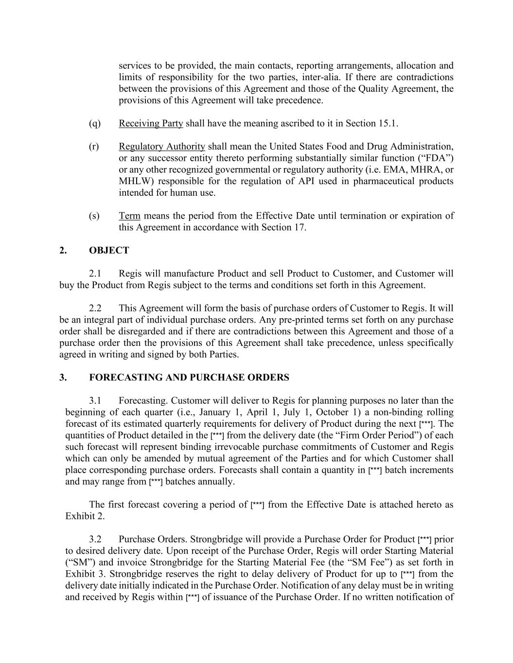 services to be provided, the main contacts, reporting arrangements, allocation and limits of responsibility for the two parties, inter-alia. If there are contradictions between the provisions of this Agreement and those of the Quality Agreement, the provisions of this Agreement will take precedence. (q) Receiving Party shall have the meaning ascribed to it in Section 15.1. (r) Regulatory Authority shall mean the United States Food and Drug Administration, or any successor entity thereto performing substantially similar function (“FDA”) or any other recognized governmental or regulatory authority (i.e. EMA, MHRA, or MHLW) responsible for the regulation of API used in pharmaceutical products intended for human use. (s) Term means the period from the Effective Date until termination or expiration of this Agreement in accordance with Section 17. 2. OBJECT 2.1 Regis will manufacture Product and sell Product to Customer, and Customer will buy the Product from Regis subject to the terms and conditions set forth in this Agreement. 2.2 This Agreement will form the basis of purchase orders of Customer to Regis. It will be an integral part of individual purchase orders. Any pre-printed terms set forth on any purchase order shall be disregarded and if there are contradictions between this Agreement and those of a purchase order then the provisions of this Agreement shall take precedence, unless specifically agreed in writing and signed by both Parties. 3. FORECASTING AND PURCHASE ORDERS 3.1 Forecasting. Customer will deliver to Regis for planning purposes no later than the beginning of each quarter (i.e., January 1, April 1, July 1, October 1) a non-binding rolling forecast of its estimated quarterly requirements for delivery of Product during the next [***]. The quantities of Product detailed in the [***] from the delivery date (the “Firm Order Period”) of each such forecast will represent binding irrevocable purchase commitments of Customer and Regis which can only be amended by mutual agreement of the Parties and for which Customer shall place corresponding purchase orders. Forecasts shall contain a quantity in [***] batch increments and may range from [***] batches annually. The first forecast covering a period of [***] from the Effective Date is attached hereto as Exhibit 2. 3.2 Purchase Orders. Strongbridge will provide a Purchase Order for Product [***] prior to desired delivery date. Upon receipt of the Purchase Order, Regis will order Starting Material (“SM”) and invoice Strongbridge for the Starting Material Fee (the “SM Fee”) as set forth in Exhibit 3. Strongbridge reserves the right to delay delivery of Product for up to [***] from the delivery date initially indicated in the Purchase Order. Notification of any delay must be in writing and received by Regis within [***] of issuance of the Purchase Order. If no written notification of