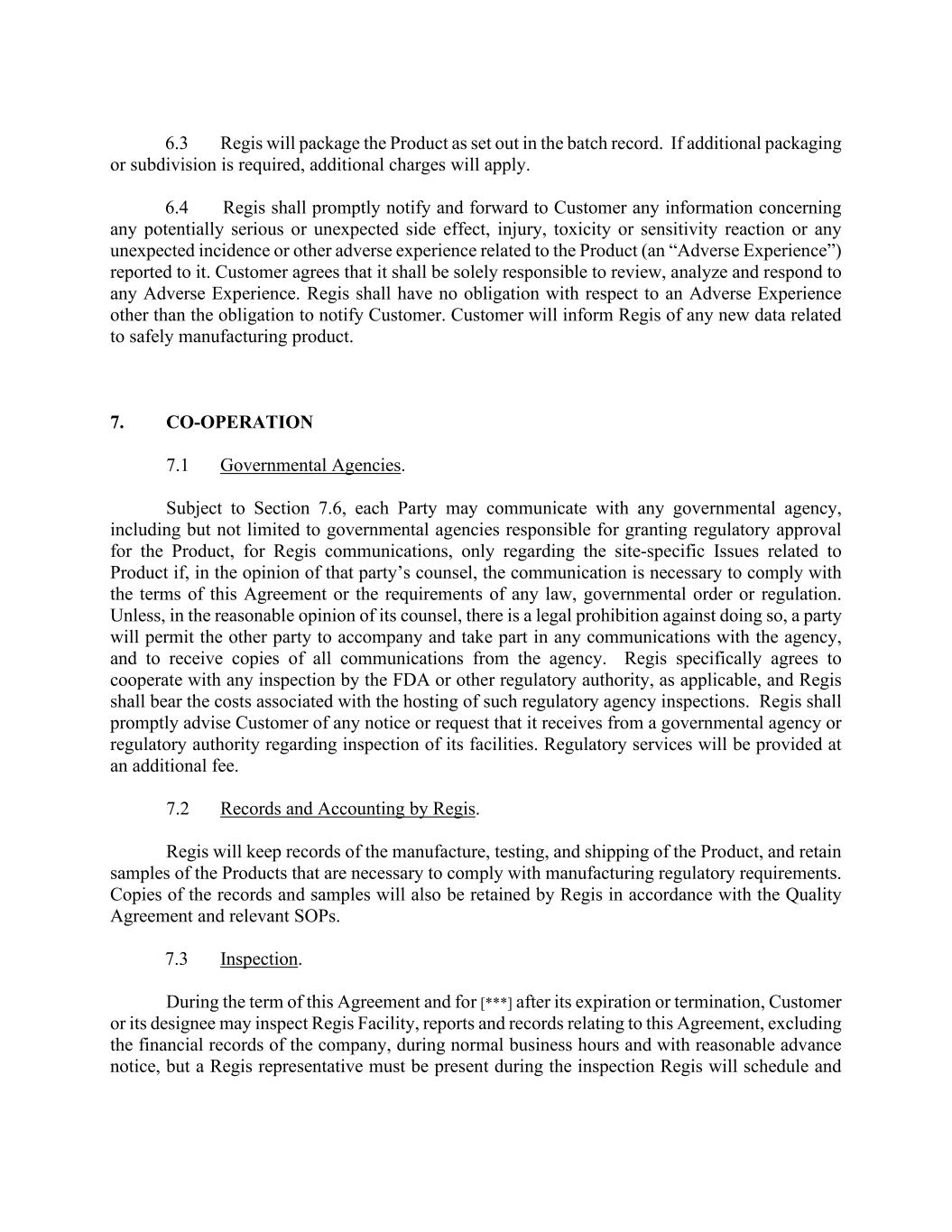 6.3 Regis will package the Product as set out in the batch record. If additional packaging or subdivision is required, additional charges will apply. 6.4 Regis shall promptly notify and forward to Customer any information concerning any potentially serious or unexpected side effect, injury, toxicity or sensitivity reaction or any unexpected incidence or other adverse experience related to the Product (an “Adverse Experience”) reported to it. Customer agrees that it shall be solely responsible to review, analyze and respond to any Adverse Experience. Regis shall have no obligation with respect to an Adverse Experience other than the obligation to notify Customer. Customer will inform Regis of any new data related to safely manufacturing product. 7. CO-OPERATION 7.1 Governmental Agencies. Subject to Section 7.6, each Party may communicate with any governmental agency, including but not limited to governmental agencies responsible for granting regulatory approval for the Product, for Regis communications, only regarding the site-specific Issues related to Product if, in the opinion of that party’s counsel, the communication is necessary to comply with the terms of this Agreement or the requirements of any law, governmental order or regulation. Unless, in the reasonable opinion of its counsel, there is a legal prohibition against doing so, a party will permit the other party to accompany and take part in any communications with the agency, and to receive copies of all communications from the agency. Regis specifically agrees to cooperate with any inspection by the FDA or other regulatory authority, as applicable, and Regis shall bear the costs associated with the hosting of such regulatory agency inspections. Regis shall promptly advise Customer of any notice or request that it receives from a governmental agency or regulatory authority regarding inspection of its facilities. Regulatory services will be provided at an additional fee. 7.2 Records and Accounting by Regis. Regis will keep records of the manufacture, testing, and shipping of the Product, and retain samples of the Products that are necessary to comply with manufacturing regulatory requirements. Copies of the records and samples will also be retained by Regis in accordance with the Quality Agreement and relevant SOPs. 7.3 Inspection. During the term of this Agreement and for [***] after its expiration or termination, Customer or its designee may inspect Regis Facility, reports and records relating to this Agreement, excluding the financial records of the company, during normal business hours and with reasonable advance notice, but a Regis representative must be present during the inspection Regis will schedule and