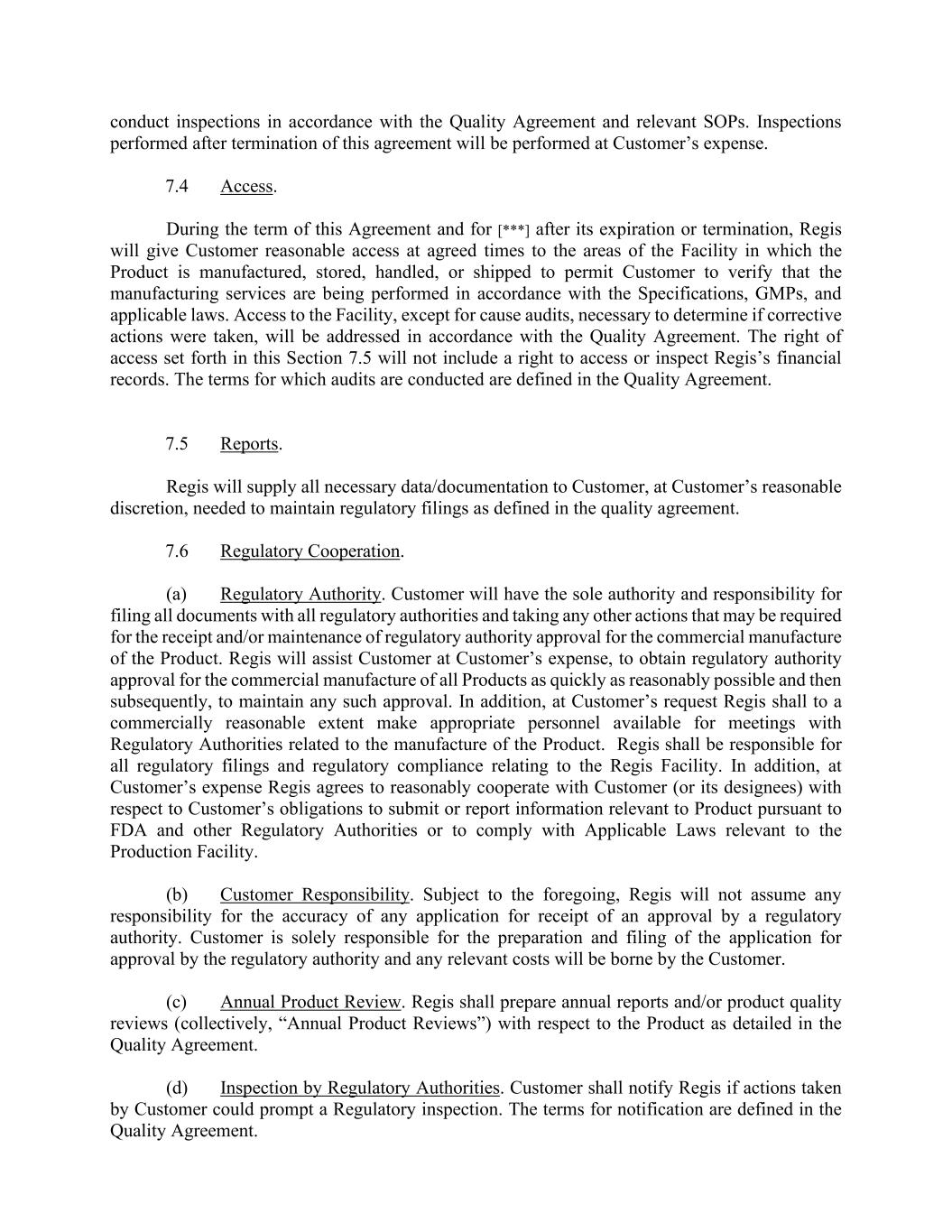 conduct inspections in accordance with the Quality Agreement and relevant SOPs. Inspections performed after termination of this agreement will be performed at Customer’s expense. 7.4 Access. During the term of this Agreement and for [***] after its expiration or termination, Regis will give Customer reasonable access at agreed times to the areas of the Facility in which the Product is manufactured, stored, handled, or shipped to permit Customer to verify that the manufacturing services are being performed in accordance with the Specifications, GMPs, and applicable laws. Access to the Facility, except for cause audits, necessary to determine if corrective actions were taken, will be addressed in accordance with the Quality Agreement. The right of access set forth in this Section 7.5 will not include a right to access or inspect Regis’s financial records. The terms for which audits are conducted are defined in the Quality Agreement. 7.5 Reports. Regis will supply all necessary data/documentation to Customer, at Customer’s reasonable discretion, needed to maintain regulatory filings as defined in the quality agreement. 7.6 Regulatory Cooperation. (a) Regulatory Authority. Customer will have the sole authority and responsibility for filing all documents with all regulatory authorities and taking any other actions that may be required for the receipt and/or maintenance of regulatory authority approval for the commercial manufacture of the Product. Regis will assist Customer at Customer’s expense, to obtain regulatory authority approval for the commercial manufacture of all Products as quickly as reasonably possible and then subsequently, to maintain any such approval. In addition, at Customer’s request Regis shall to a commercially reasonable extent make appropriate personnel available for meetings with Regulatory Authorities related to the manufacture of the Product. Regis shall be responsible for all regulatory filings and regulatory compliance relating to the Regis Facility. In addition, at Customer’s expense Regis agrees to reasonably cooperate with Customer (or its designees) with respect to Customer’s obligations to submit or report information relevant to Product pursuant to FDA and other Regulatory Authorities or to comply with Applicable Laws relevant to the Production Facility. (b) Customer Responsibility. Subject to the foregoing, Regis will not assume any responsibility for the accuracy of any application for receipt of an approval by a regulatory authority. Customer is solely responsible for the preparation and filing of the application for approval by the regulatory authority and any relevant costs will be borne by the Customer. (c) Annual Product Review. Regis shall prepare annual reports and/or product quality reviews (collectively, “Annual Product Reviews”) with respect to the Product as detailed in the Quality Agreement. (d) Inspection by Regulatory Authorities. Customer shall notify Regis if actions taken by Customer could prompt a Regulatory inspection. The terms for notification are defined in the Quality Agreement.