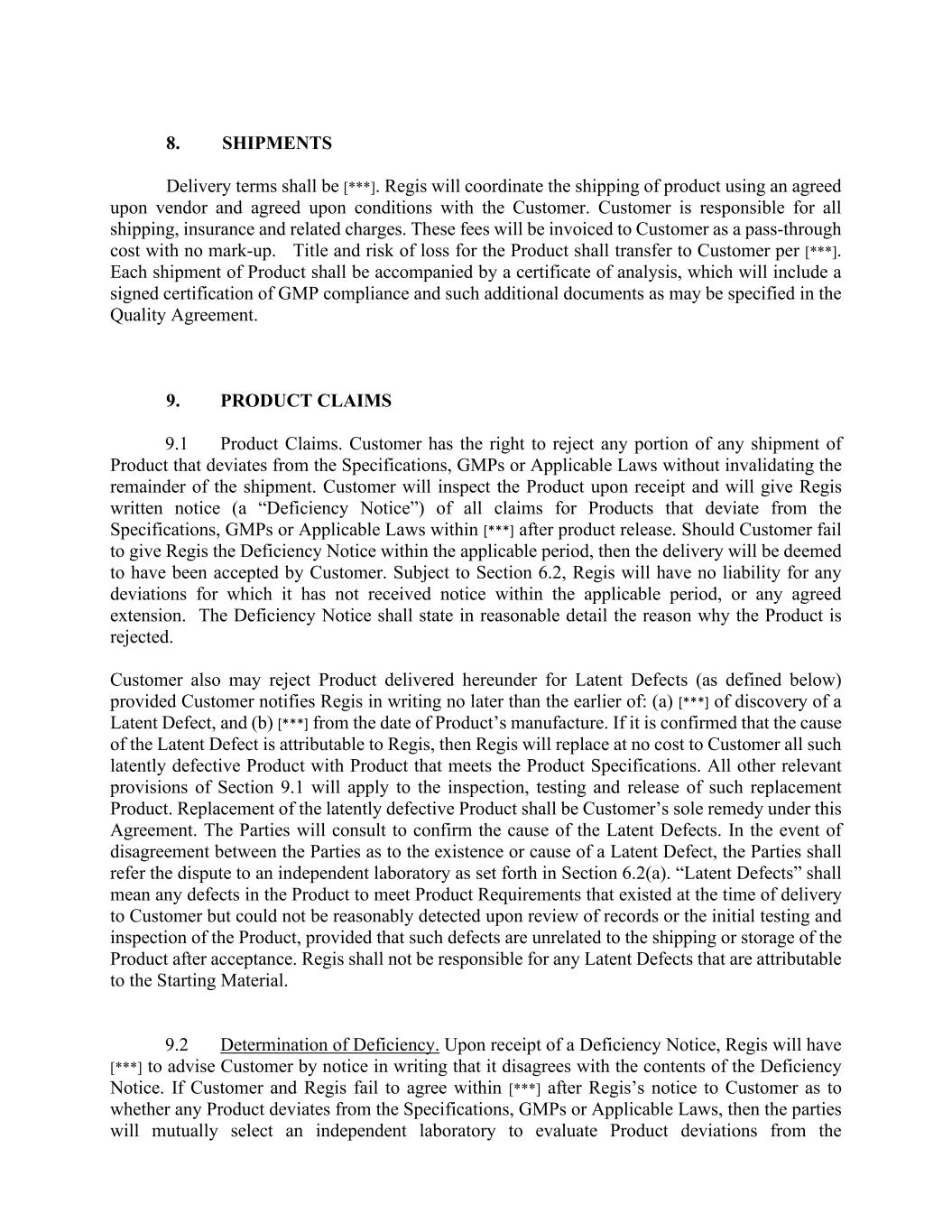 8. SHIPMENTS Delivery terms shall be [***]. Regis will coordinate the shipping of product using an agreed upon vendor and agreed upon conditions with the Customer. Customer is responsible for all shipping, insurance and related charges. These fees will be invoiced to Customer as a pass-through cost with no mark-up. Title and risk of loss for the Product shall transfer to Customer per [***]. Each shipment of Product shall be accompanied by a certificate of analysis, which will include a signed certification of GMP compliance and such additional documents as may be specified in the Quality Agreement. 9. PRODUCT CLAIMS 9.1 Product Claims. Customer has the right to reject any portion of any shipment of Product that deviates from the Specifications, GMPs or Applicable Laws without invalidating the remainder of the shipment. Customer will inspect the Product upon receipt and will give Regis written notice (a “Deficiency Notice”) of all claims for Products that deviate from the Specifications, GMPs or Applicable Laws within [***] after product release. Should Customer fail to give Regis the Deficiency Notice within the applicable period, then the delivery will be deemed to have been accepted by Customer. Subject to Section 6.2, Regis will have no liability for any deviations for which it has not received notice within the applicable period, or any agreed extension. The Deficiency Notice shall state in reasonable detail the reason why the Product is rejected. Customer also may reject Product delivered hereunder for Latent Defects (as defined below) provided Customer notifies Regis in writing no later than the earlier of: (a) [***] of discovery of a Latent Defect, and (b) [***] from the date of Product’s manufacture. If it is confirmed that the cause of the Latent Defect is attributable to Regis, then Regis will replace at no cost to Customer all such latently defective Product with Product that meets the Product Specifications. All other relevant provisions of Section 9.1 will apply to the inspection, testing and release of such replacement Product. Replacement of the latently defective Product shall be Customer’s sole remedy under this Agreement. The Parties will consult to confirm the cause of the Latent Defects. In the event of disagreement between the Parties as to the existence or cause of a Latent Defect, the Parties shall refer the dispute to an independent laboratory as set forth in Section 6.2(a). “Latent Defects” shall mean any defects in the Product to meet Product Requirements that existed at the time of delivery to Customer but could not be reasonably detected upon review of records or the initial testing and inspection of the Product, provided that such defects are unrelated to the shipping or storage of the Product after acceptance. Regis shall not be responsible for any Latent Defects that are attributable to the Starting Material. 9.2 Determination of Deficiency. Upon receipt of a Deficiency Notice, Regis will have [***] to advise Customer by notice in writing that it disagrees with the contents of the Deficiency Notice. If Customer and Regis fail to agree within [***] after Regis’s notice to Customer as to whether any Product deviates from the Specifications, GMPs or Applicable Laws, then the parties will mutually select an independent laboratory to evaluate Product deviations from the
