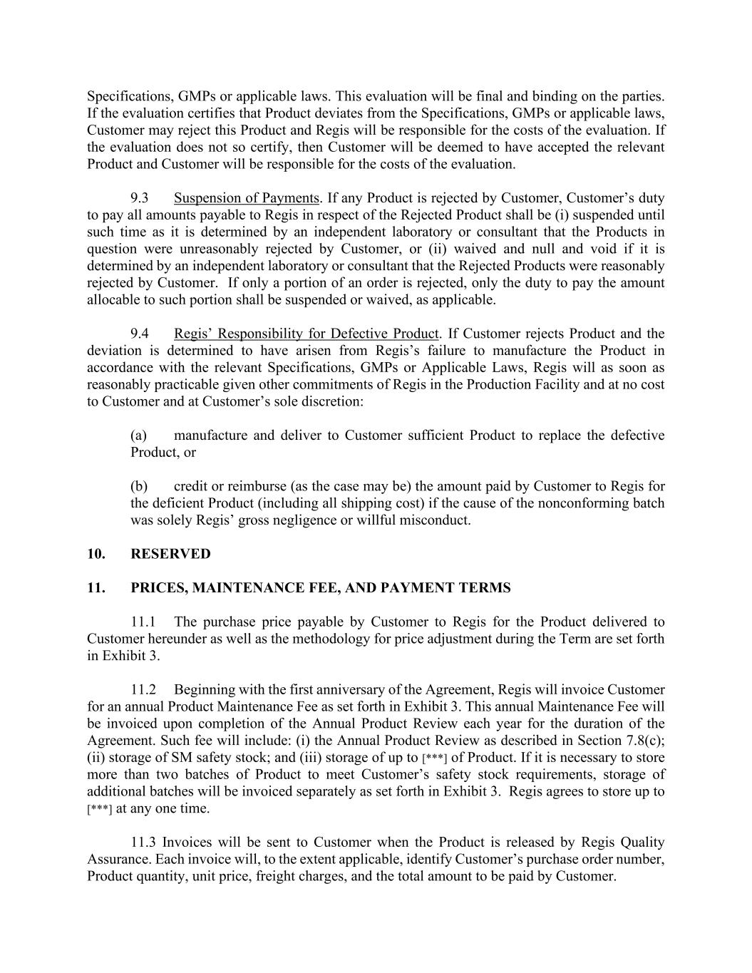 Specifications, GMPs or applicable laws. This evaluation will be final and binding on the parties. If the evaluation certifies that Product deviates from the Specifications, GMPs or applicable laws, Customer may reject this Product and Regis will be responsible for the costs of the evaluation. If the evaluation does not so certify, then Customer will be deemed to have accepted the relevant Product and Customer will be responsible for the costs of the evaluation. 9.3 Suspension of Payments. If any Product is rejected by Customer, Customer’s duty to pay all amounts payable to Regis in respect of the Rejected Product shall be (i) suspended until such time as it is determined by an independent laboratory or consultant that the Products in question were unreasonably rejected by Customer, or (ii) waived and null and void if it is determined by an independent laboratory or consultant that the Rejected Products were reasonably rejected by Customer. If only a portion of an order is rejected, only the duty to pay the amount allocable to such portion shall be suspended or waived, as applicable. 9.4 Regis’ Responsibility for Defective Product. If Customer rejects Product and the deviation is determined to have arisen from Regis’s failure to manufacture the Product in accordance with the relevant Specifications, GMPs or Applicable Laws, Regis will as soon as reasonably practicable given other commitments of Regis in the Production Facility and at no cost to Customer and at Customer’s sole discretion: (a) manufacture and deliver to Customer sufficient Product to replace the defective Product, or (b) credit or reimburse (as the case may be) the amount paid by Customer to Regis for the deficient Product (including all shipping cost) if the cause of the nonconforming batch was solely Regis’ gross negligence or willful misconduct. 10. RESERVED 11. PRICES, MAINTENANCE FEE, AND PAYMENT TERMS 11.1 The purchase price payable by Customer to Regis for the Product delivered to Customer hereunder as well as the methodology for price adjustment during the Term are set forth in Exhibit 3. 11.2 Beginning with the first anniversary of the Agreement, Regis will invoice Customer for an annual Product Maintenance Fee as set forth in Exhibit 3. This annual Maintenance Fee will be invoiced upon completion of the Annual Product Review each year for the duration of the Agreement. Such fee will include: (i) the Annual Product Review as described in Section 7.8(c); (ii) storage of SM safety stock; and (iii) storage of up to [***] of Product. If it is necessary to store more than two batches of Product to meet Customer’s safety stock requirements, storage of additional batches will be invoiced separately as set forth in Exhibit 3. Regis agrees to store up to [***] at any one time. 11.3 Invoices will be sent to Customer when the Product is released by Regis Quality Assurance. Each invoice will, to the extent applicable, identify Customer’s purchase order number, Product quantity, unit price, freight charges, and the total amount to be paid by Customer.