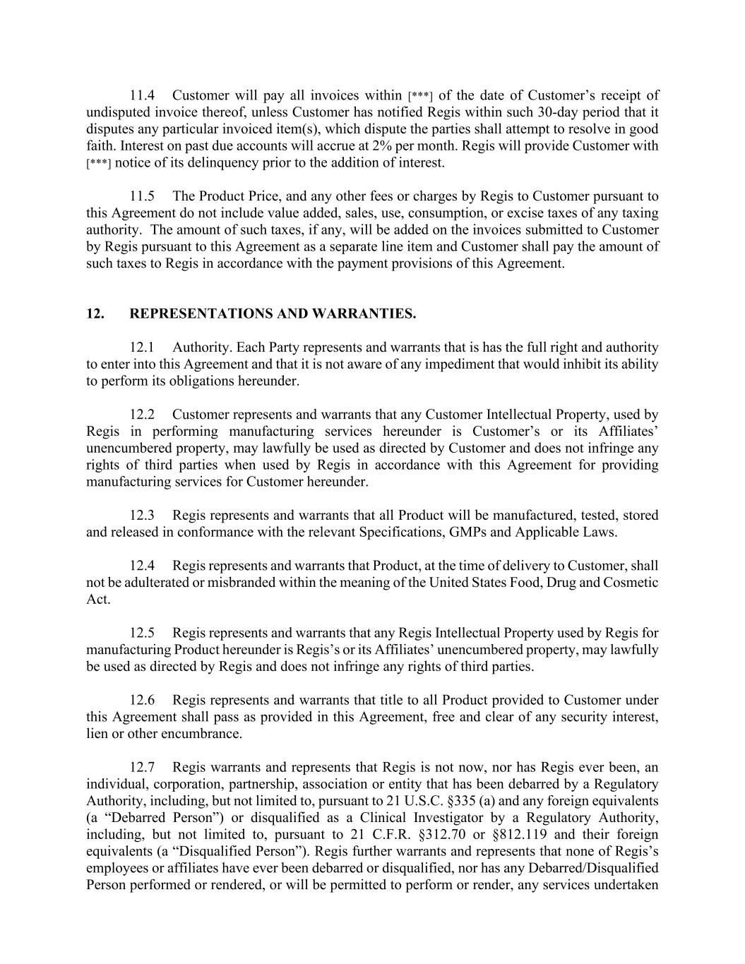 11.4 Customer will pay all invoices within [***] of the date of Customer’s receipt of undisputed invoice thereof, unless Customer has notified Regis within such 30-day period that it disputes any particular invoiced item(s), which dispute the parties shall attempt to resolve in good faith. Interest on past due accounts will accrue at 2% per month. Regis will provide Customer with [***] notice of its delinquency prior to the addition of interest. 11.5 The Product Price, and any other fees or charges by Regis to Customer pursuant to this Agreement do not include value added, sales, use, consumption, or excise taxes of any taxing authority. The amount of such taxes, if any, will be added on the invoices submitted to Customer by Regis pursuant to this Agreement as a separate line item and Customer shall pay the amount of such taxes to Regis in accordance with the payment provisions of this Agreement. 12. REPRESENTATIONS AND WARRANTIES. 12.1 Authority. Each Party represents and warrants that is has the full right and authority to enter into this Agreement and that it is not aware of any impediment that would inhibit its ability to perform its obligations hereunder. 12.2 Customer represents and warrants that any Customer Intellectual Property, used by Regis in performing manufacturing services hereunder is Customer’s or its Affiliates’ unencumbered property, may lawfully be used as directed by Customer and does not infringe any rights of third parties when used by Regis in accordance with this Agreement for providing manufacturing services for Customer hereunder. 12.3 Regis represents and warrants that all Product will be manufactured, tested, stored and released in conformance with the relevant Specifications, GMPs and Applicable Laws. 12.4 Regis represents and warrants that Product, at the time of delivery to Customer, shall not be adulterated or misbranded within the meaning of the United States Food, Drug and Cosmetic Act. 12.5 Regis represents and warrants that any Regis Intellectual Property used by Regis for manufacturing Product hereunder is Regis’s or its Affiliates’ unencumbered property, may lawfully be used as directed by Regis and does not infringe any rights of third parties. 12.6 Regis represents and warrants that title to all Product provided to Customer under this Agreement shall pass as provided in this Agreement, free and clear of any security interest, lien or other encumbrance. 12.7 Regis warrants and represents that Regis is not now, nor has Regis ever been, an individual, corporation, partnership, association or entity that has been debarred by a Regulatory Authority, including, but not limited to, pursuant to 21 U.S.C. §335 (a) and any foreign equivalents (a “Debarred Person”) or disqualified as a Clinical Investigator by a Regulatory Authority, including, but not limited to, pursuant to 21 C.F.R. §312.70 or §812.119 and their foreign equivalents (a “Disqualified Person”). Regis further warrants and represents that none of Regis’s employees or affiliates have ever been debarred or disqualified, nor has any Debarred/Disqualified Person performed or rendered, or will be permitted to perform or render, any services undertaken