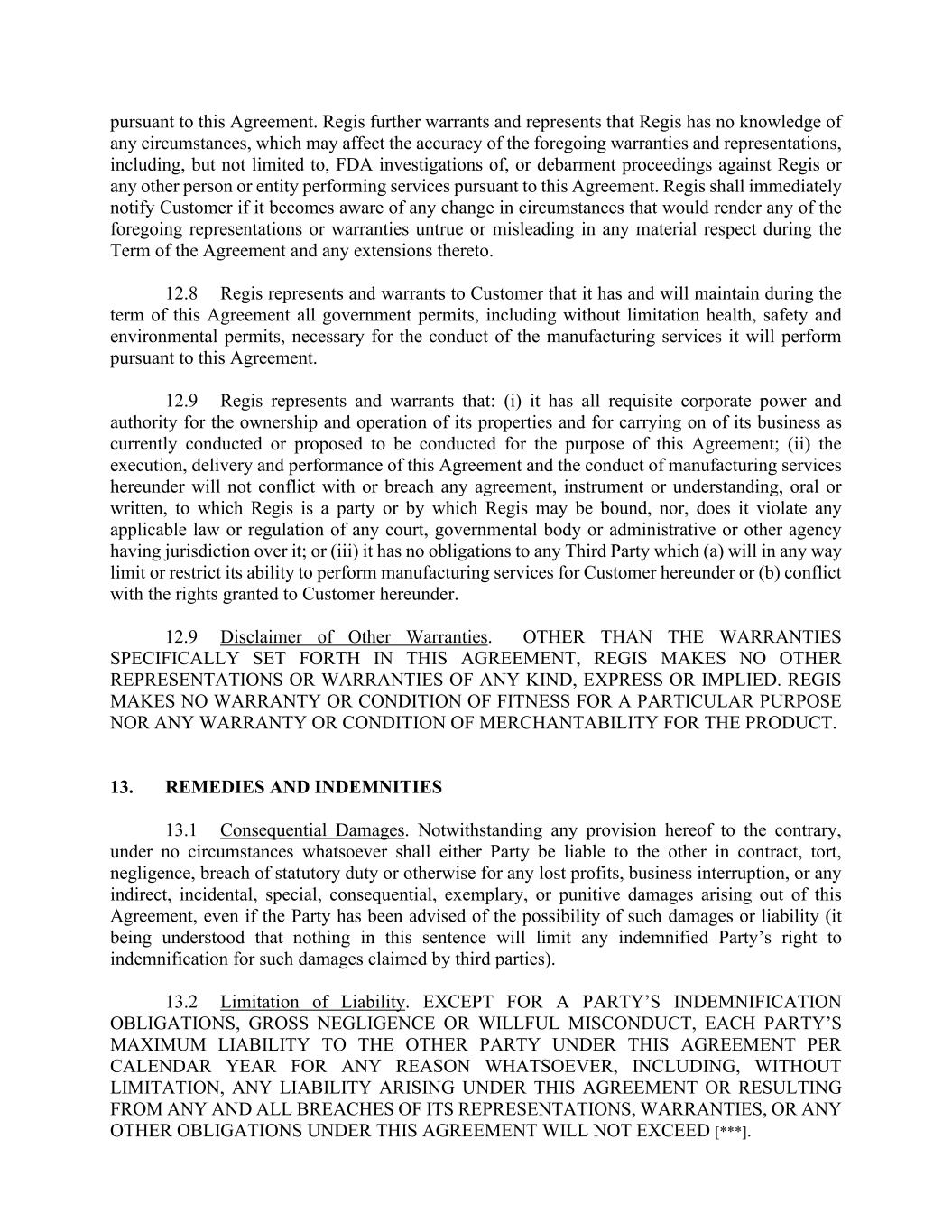 pursuant to this Agreement. Regis further warrants and represents that Regis has no knowledge of any circumstances, which may affect the accuracy of the foregoing warranties and representations, including, but not limited to, FDA investigations of, or debarment proceedings against Regis or any other person or entity performing services pursuant to this Agreement. Regis shall immediately notify Customer if it becomes aware of any change in circumstances that would render any of the foregoing representations or warranties untrue or misleading in any material respect during the Term of the Agreement and any extensions thereto. 12.8 Regis represents and warrants to Customer that it has and will maintain during the term of this Agreement all government permits, including without limitation health, safety and environmental permits, necessary for the conduct of the manufacturing services it will perform pursuant to this Agreement. 12.9 Regis represents and warrants that: (i) it has all requisite corporate power and authority for the ownership and operation of its properties and for carrying on of its business as currently conducted or proposed to be conducted for the purpose of this Agreement; (ii) the execution, delivery and performance of this Agreement and the conduct of manufacturing services hereunder will not conflict with or breach any agreement, instrument or understanding, oral or written, to which Regis is a party or by which Regis may be bound, nor, does it violate any applicable law or regulation of any court, governmental body or administrative or other agency having jurisdiction over it; or (iii) it has no obligations to any Third Party which (a) will in any way limit or restrict its ability to perform manufacturing services for Customer hereunder or (b) conflict with the rights granted to Customer hereunder. 12.9 Disclaimer of Other Warranties. OTHER THAN THE WARRANTIES SPECIFICALLY SET FORTH IN THIS AGREEMENT, REGIS MAKES NO OTHER REPRESENTATIONS OR WARRANTIES OF ANY KIND, EXPRESS OR IMPLIED. REGIS MAKES NO WARRANTY OR CONDITION OF FITNESS FOR A PARTICULAR PURPOSE NOR ANY WARRANTY OR CONDITION OF MERCHANTABILITY FOR THE PRODUCT. 13. REMEDIES AND INDEMNITIES 13.1 Consequential Damages. Notwithstanding any provision hereof to the contrary, under no circumstances whatsoever shall either Party be liable to the other in contract, tort, negligence, breach of statutory duty or otherwise for any lost profits, business interruption, or any indirect, incidental, special, consequential, exemplary, or punitive damages arising out of this Agreement, even if the Party has been advised of the possibility of such damages or liability (it being understood that nothing in this sentence will limit any indemnified Party’s right to indemnification for such damages claimed by third parties). 13.2 Limitation of Liability. EXCEPT FOR A PARTY’S INDEMNIFICATION OBLIGATIONS, GROSS NEGLIGENCE OR WILLFUL MISCONDUCT, EACH PARTY’S MAXIMUM LIABILITY TO THE OTHER PARTY UNDER THIS AGREEMENT PER CALENDAR YEAR FOR ANY REASON WHATSOEVER, INCLUDING, WITHOUT LIMITATION, ANY LIABILITY ARISING UNDER THIS AGREEMENT OR RESULTING FROM ANY AND ALL BREACHES OF ITS REPRESENTATIONS, WARRANTIES, OR ANY OTHER OBLIGATIONS UNDER THIS AGREEMENT WILL NOT EXCEED [***].